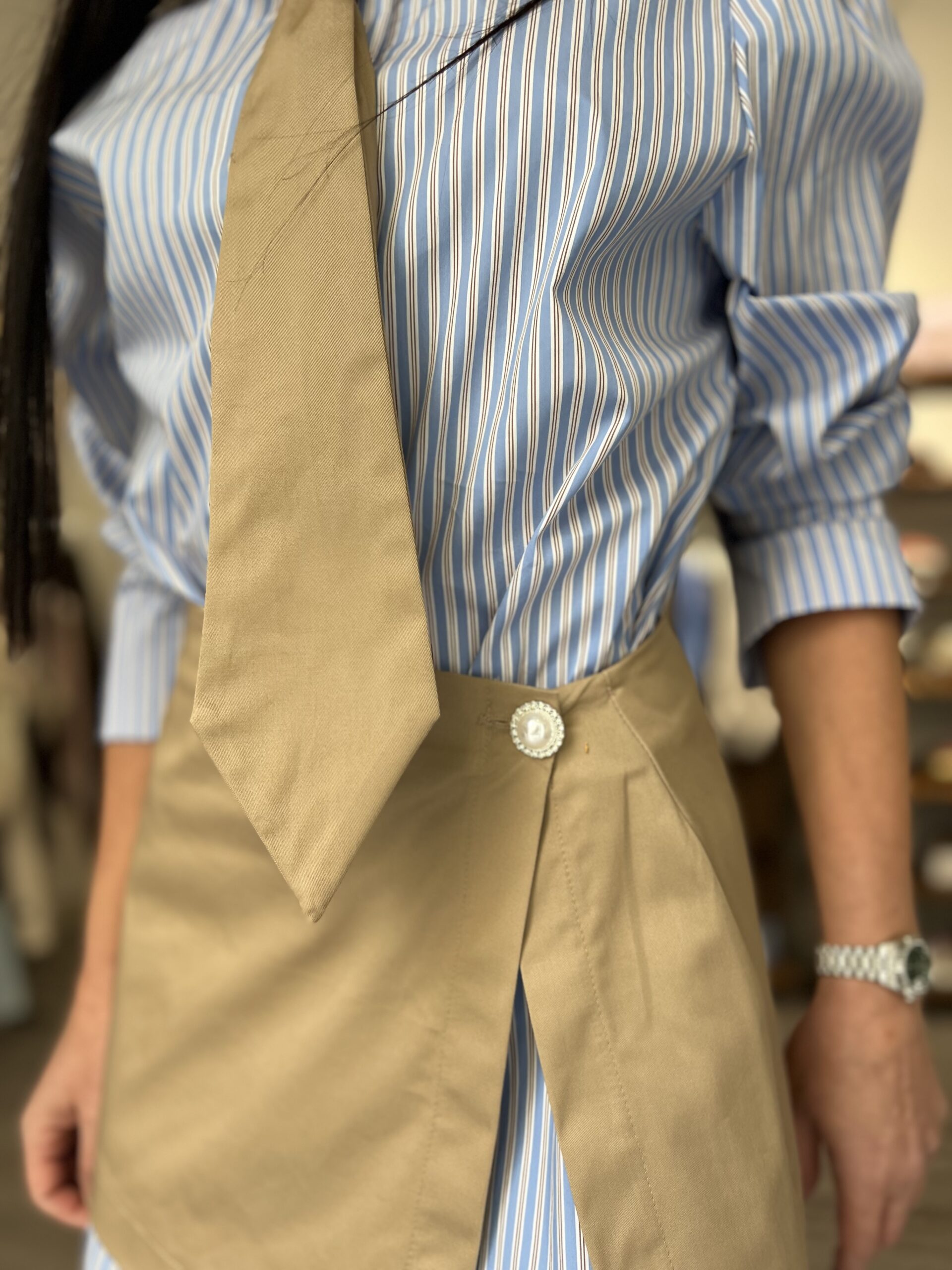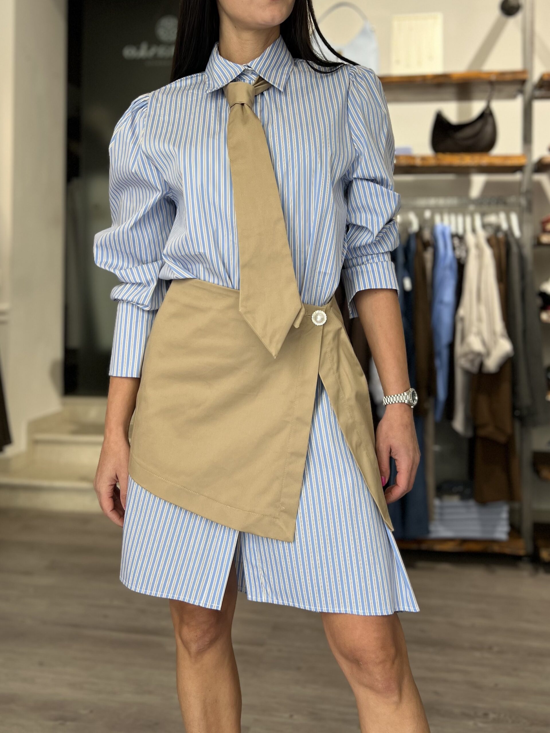 Abito composto da maxi camicia lunga, e gonna separata che si attacca tramite i bottoni laterali. Cravatta inclusa. La camicia è over ma la gonna veste fino alla M. Quindi è possibile indossare i tre pezzi separatamente.