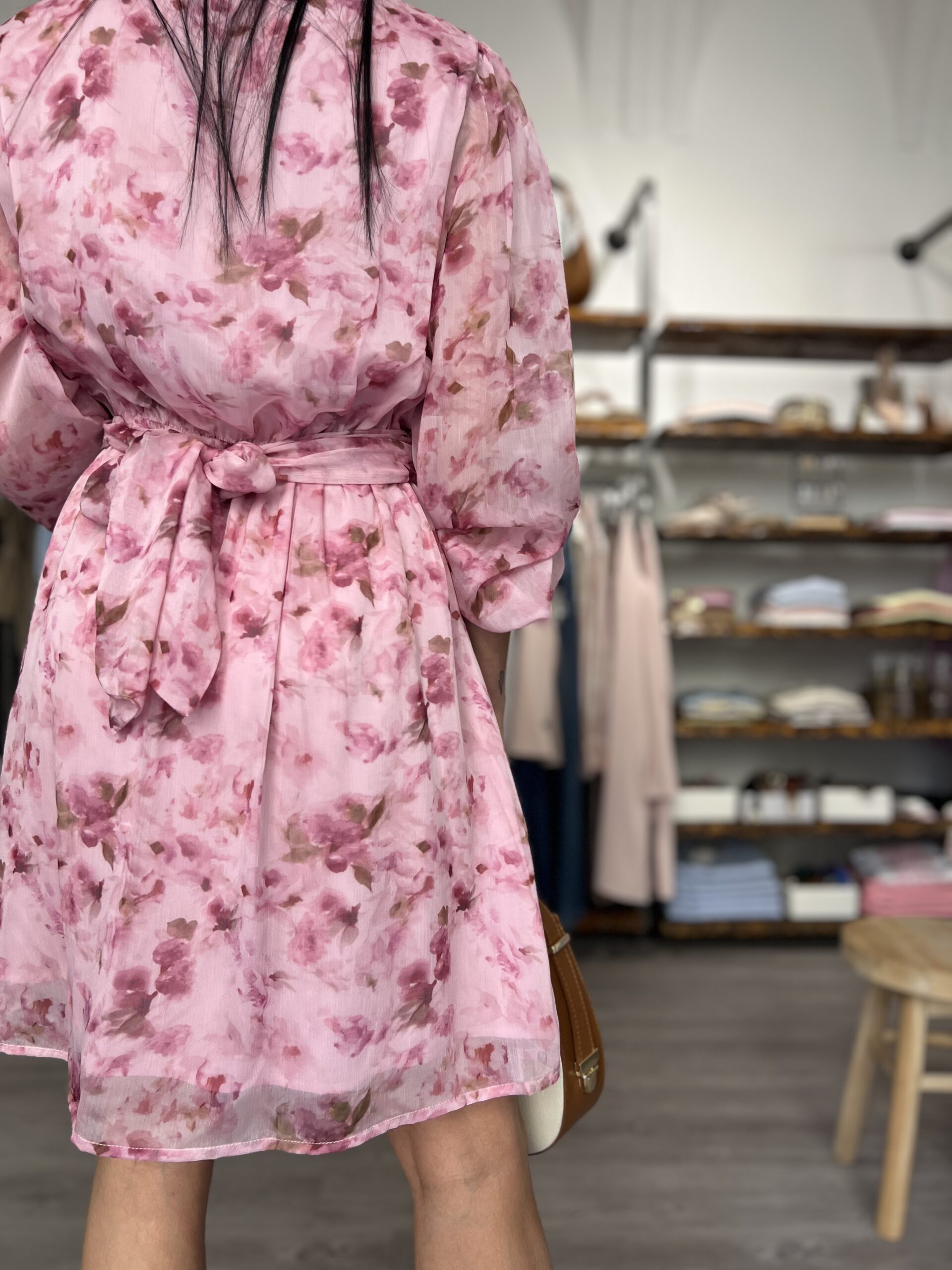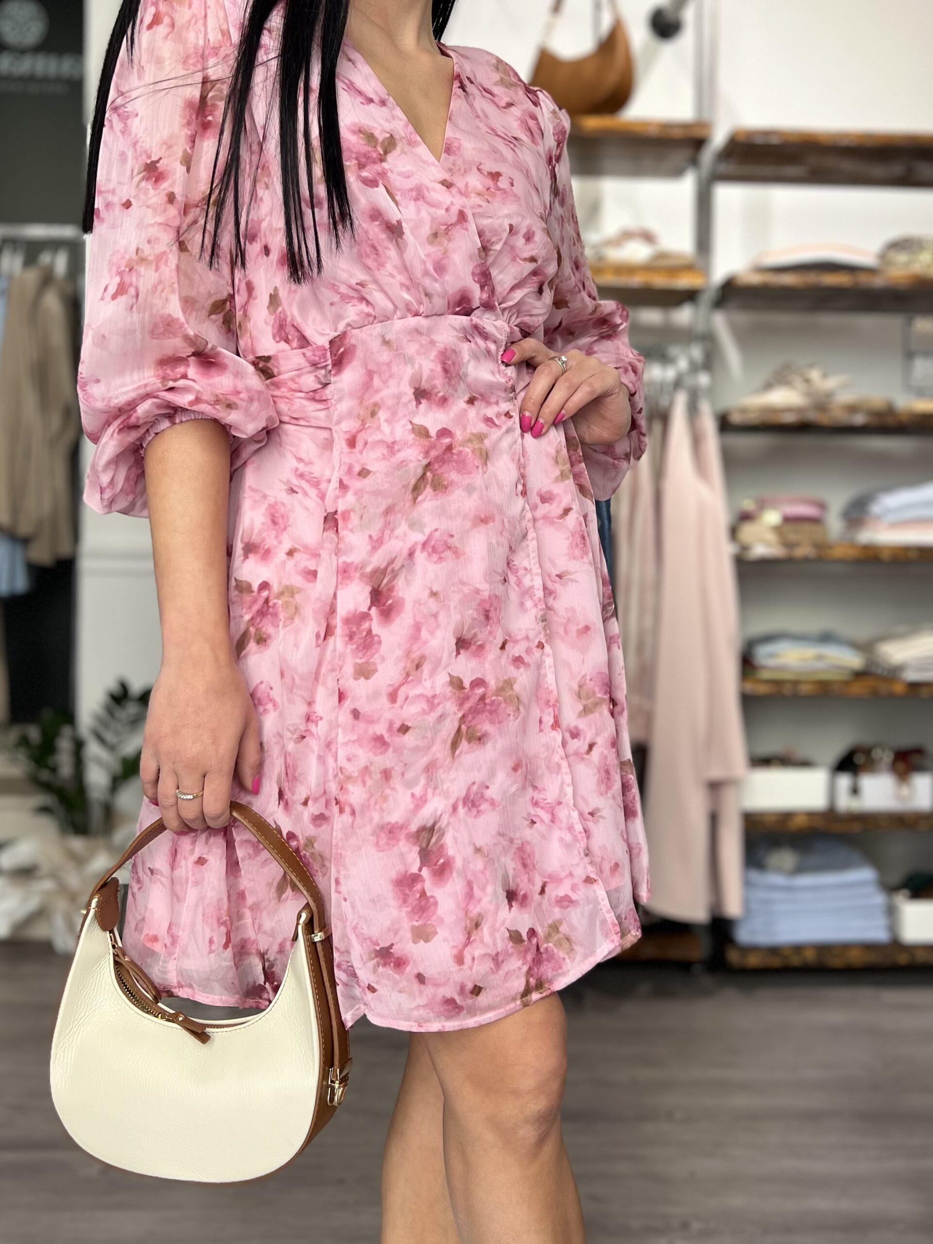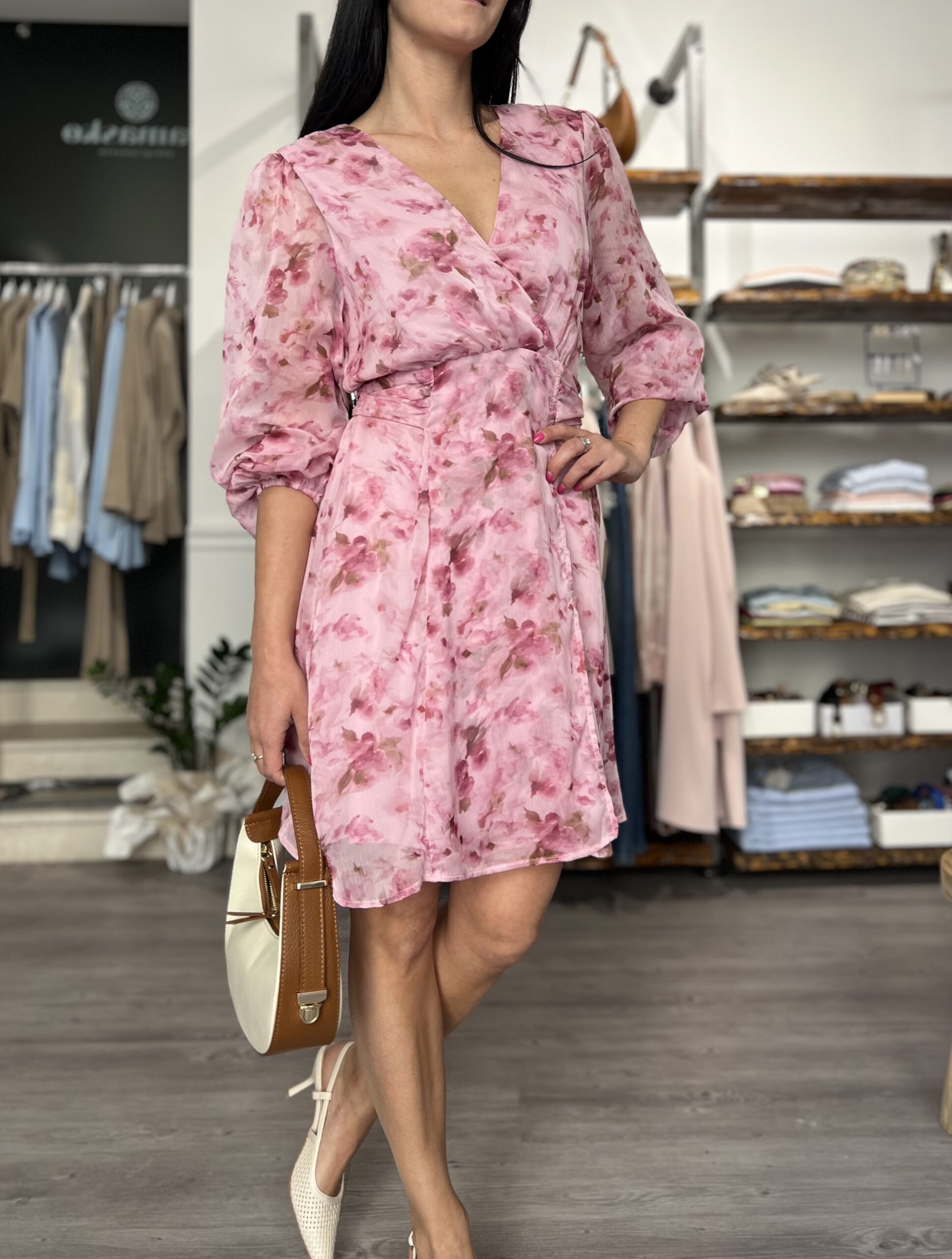 Abito in voile foderato con manica leggermente in trasparenza. Modello con scollo a V, punto vita segnato con fusciacca da annodare sul retro. Taglia S per 40/42 e M per 42/44.
