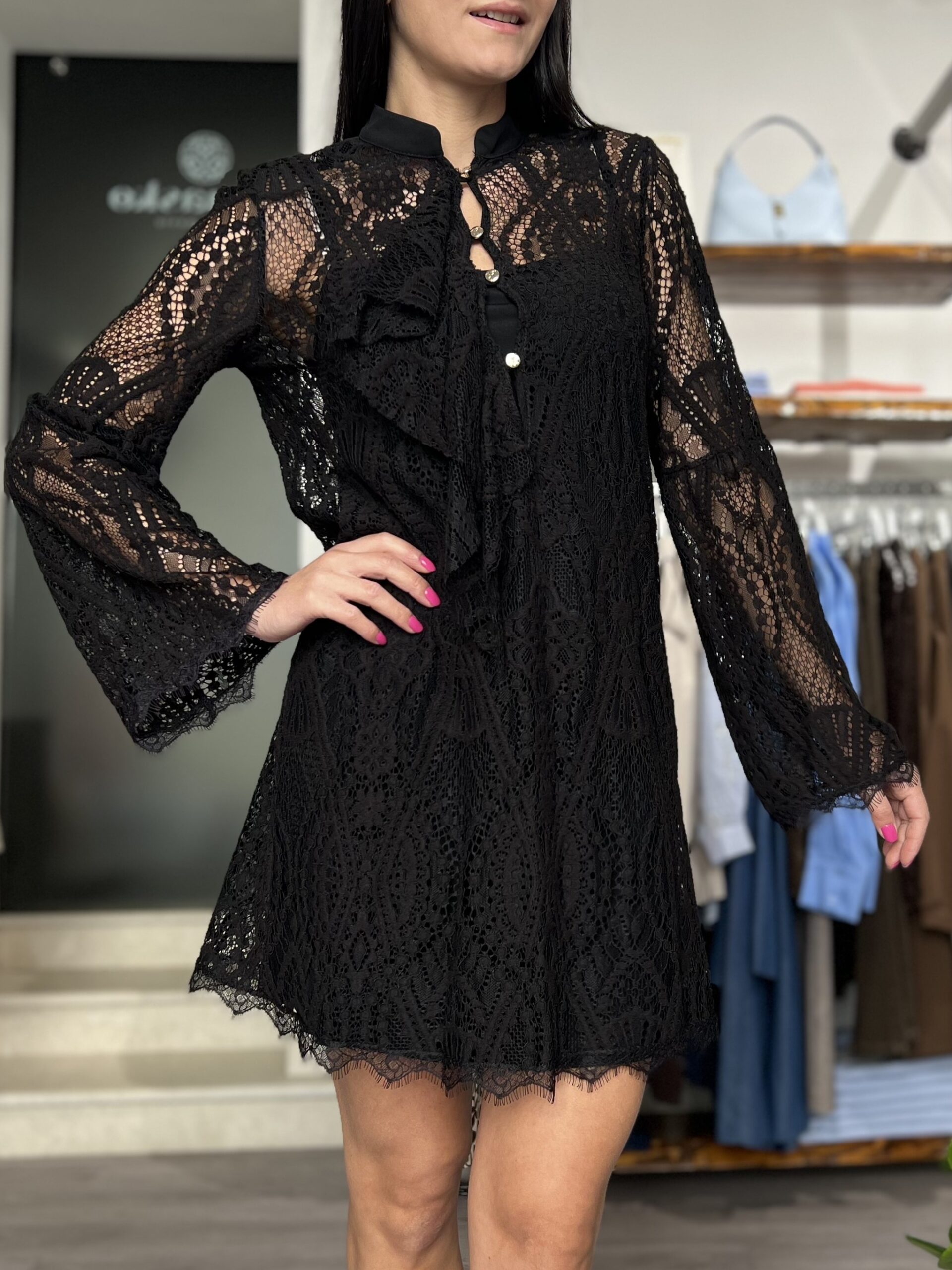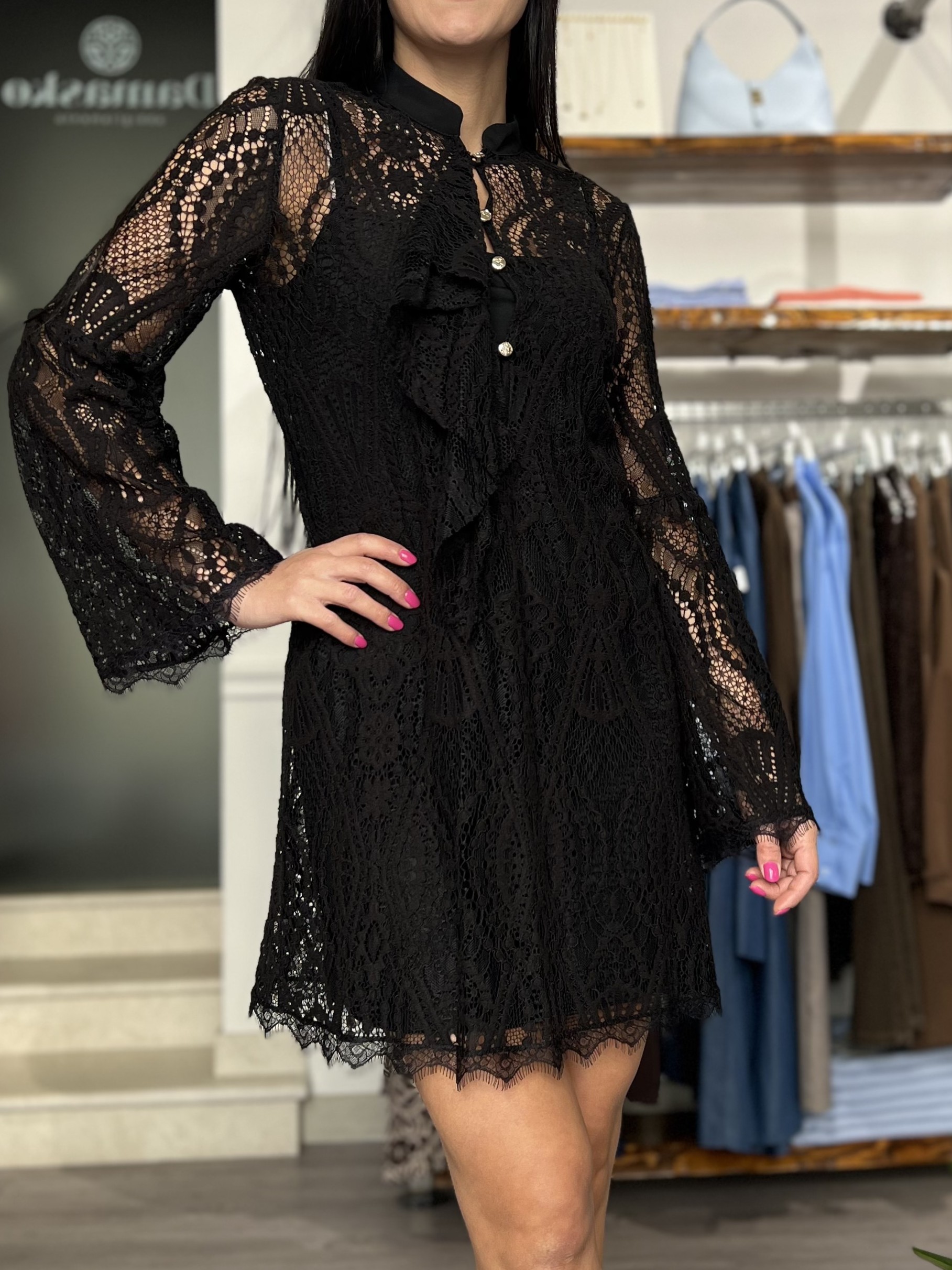 Abito con pizzo con colletto alla coreana, bottoncini oro e volant sullo scollo. Linea sfiancata, manica a campana e sottoveste con spallina sottile separata inclusa. Taglia XS per 38/40, S per 40/42 e M per 42/44.