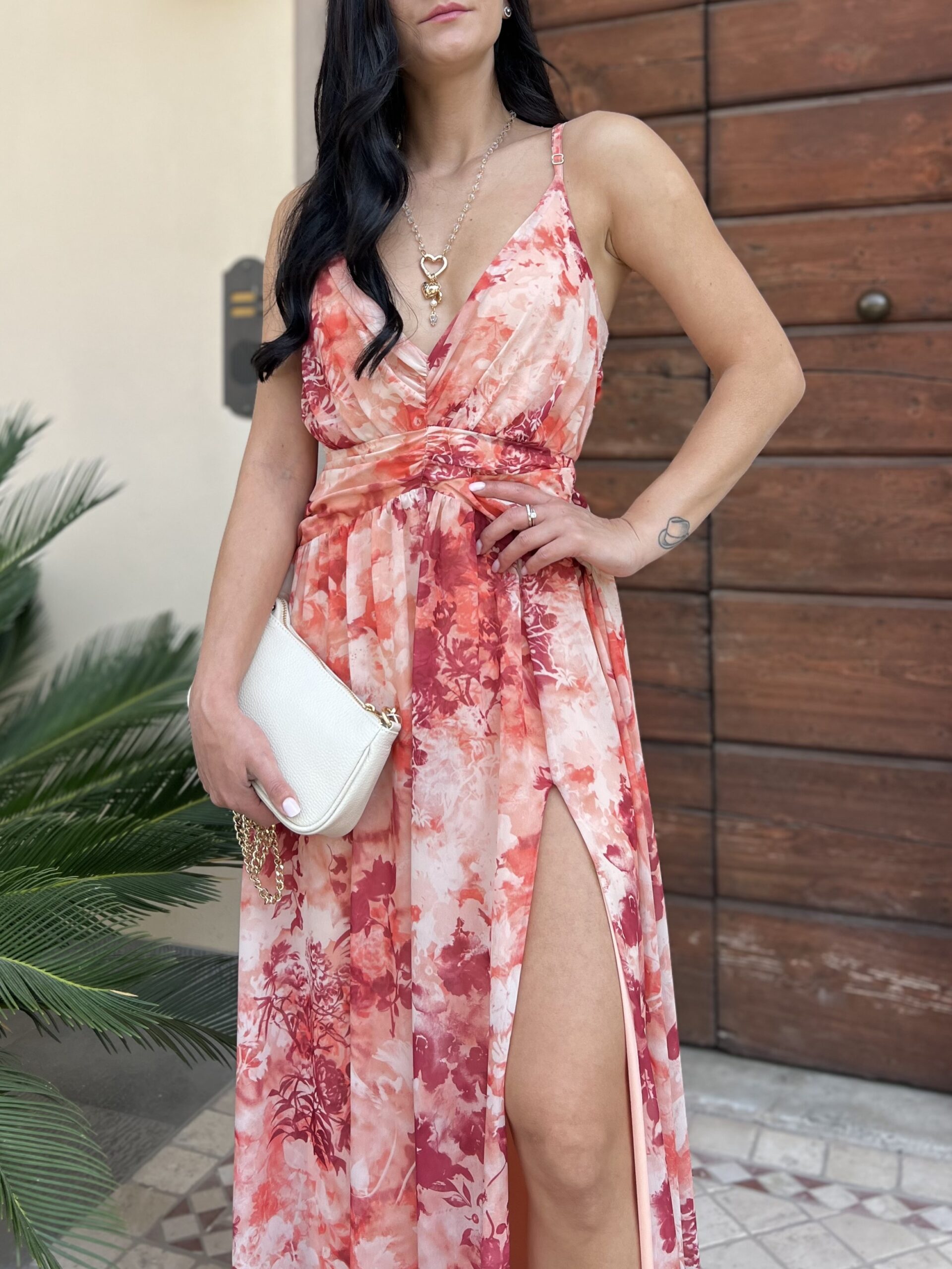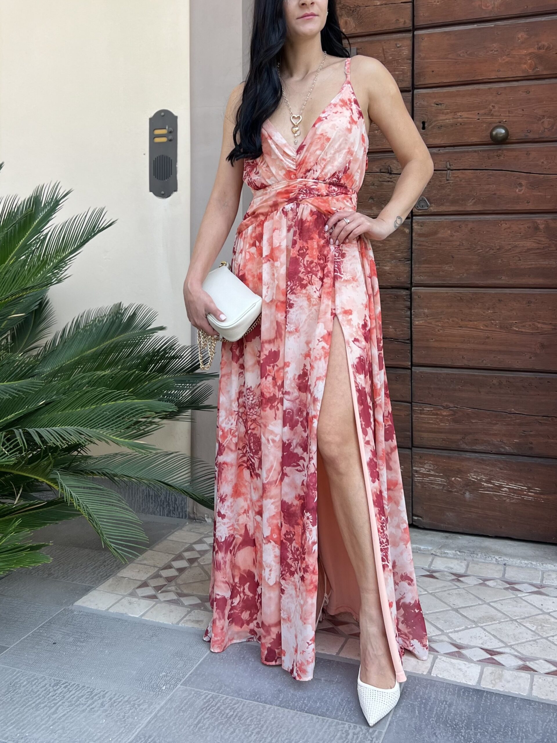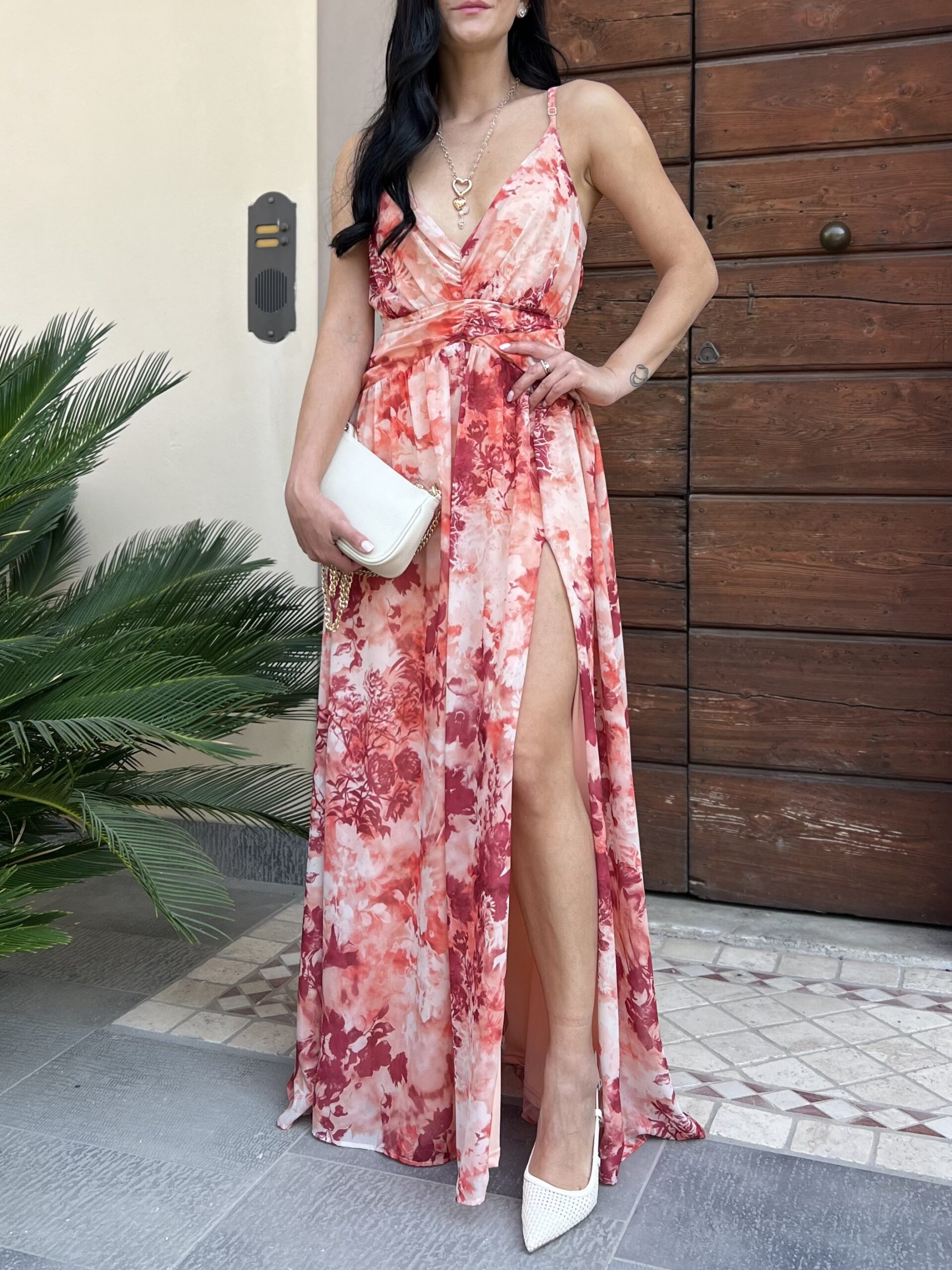 Abito lungo con spallino regolabile e chiusura zip sul retro. Modello con scollo a V, ripreso sotto al seno e linea leggermente ad A della gonna, con spacco profondo. La taglia L veste fino alla 46.
