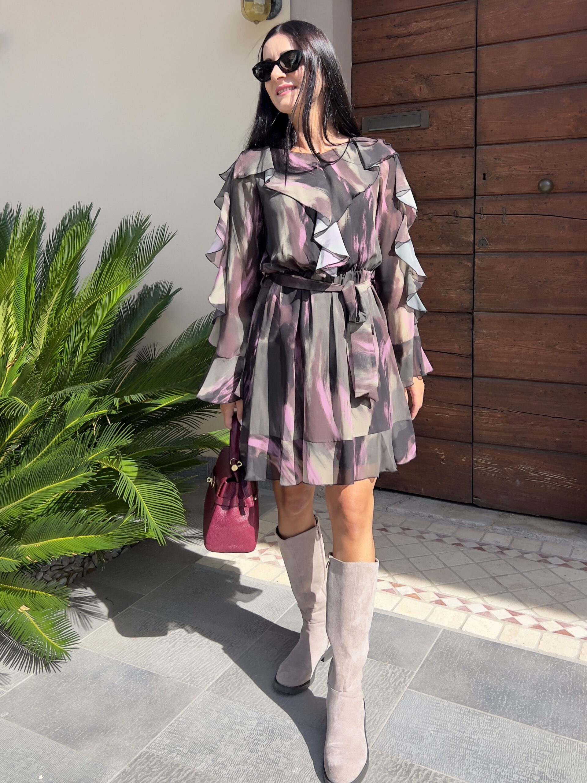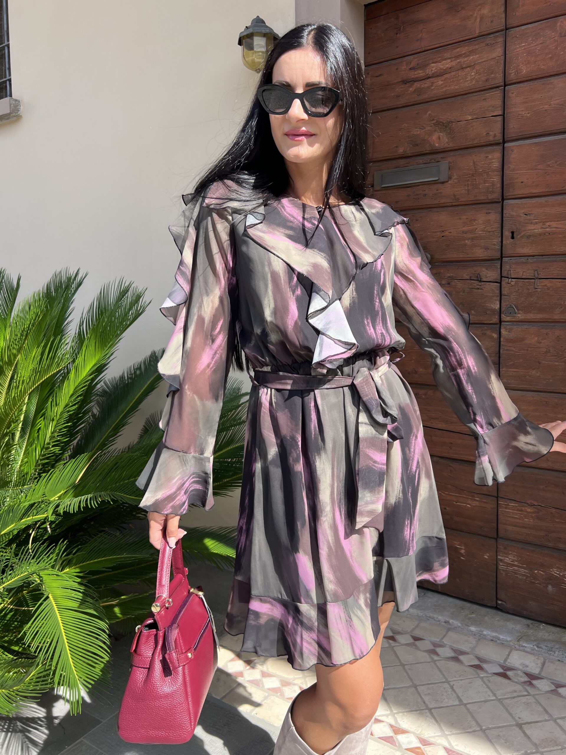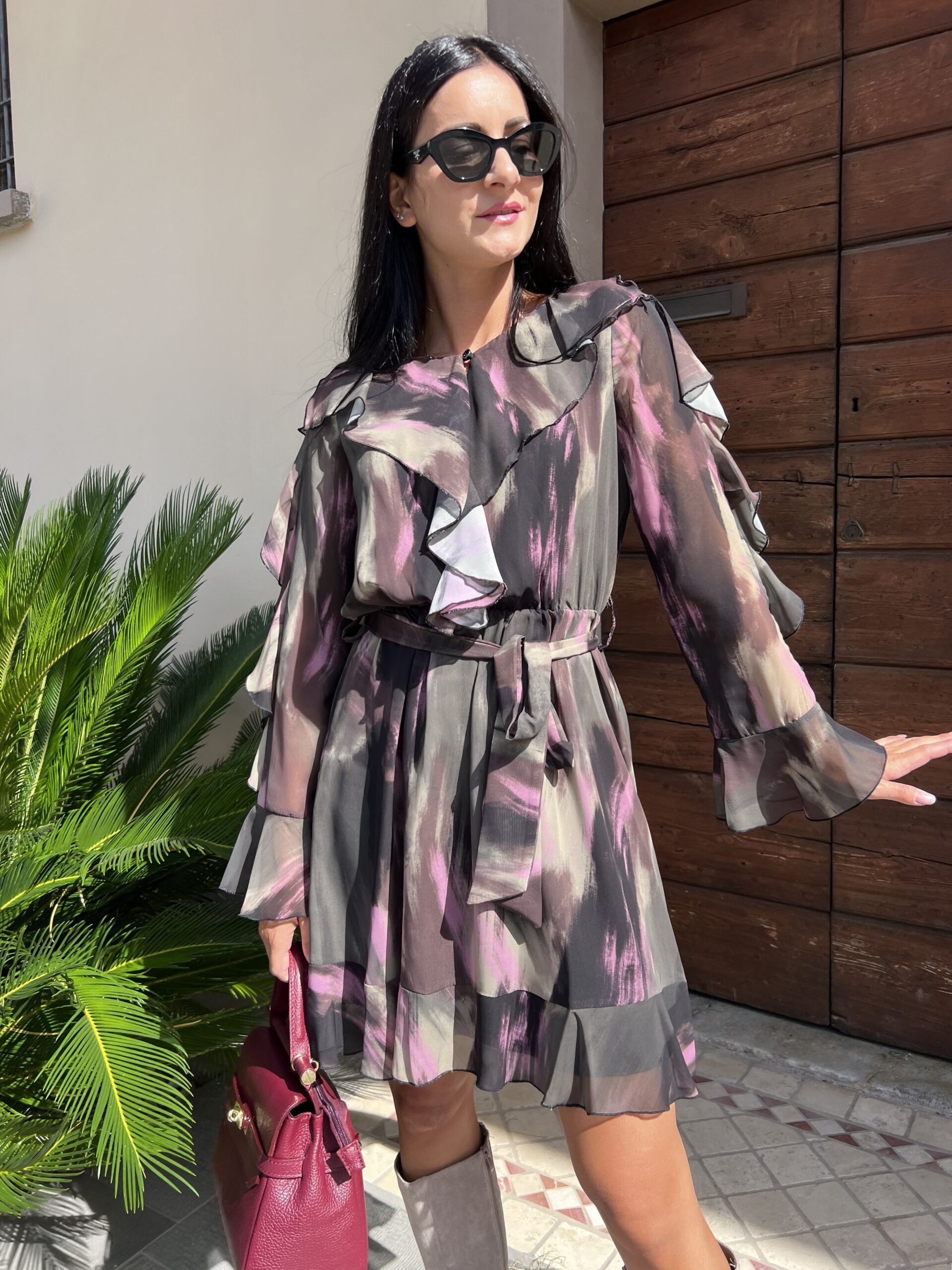 Abito fantasia con volant su scollo (chiuso da un bottoncino) e manica, che termina con polsino a campanella. Modello dalla linea dritta, cintura e passanti in vota. Foderato escluse le maniche. Taglia Xs per 38/40, S per 40/42 e M per 44/46.