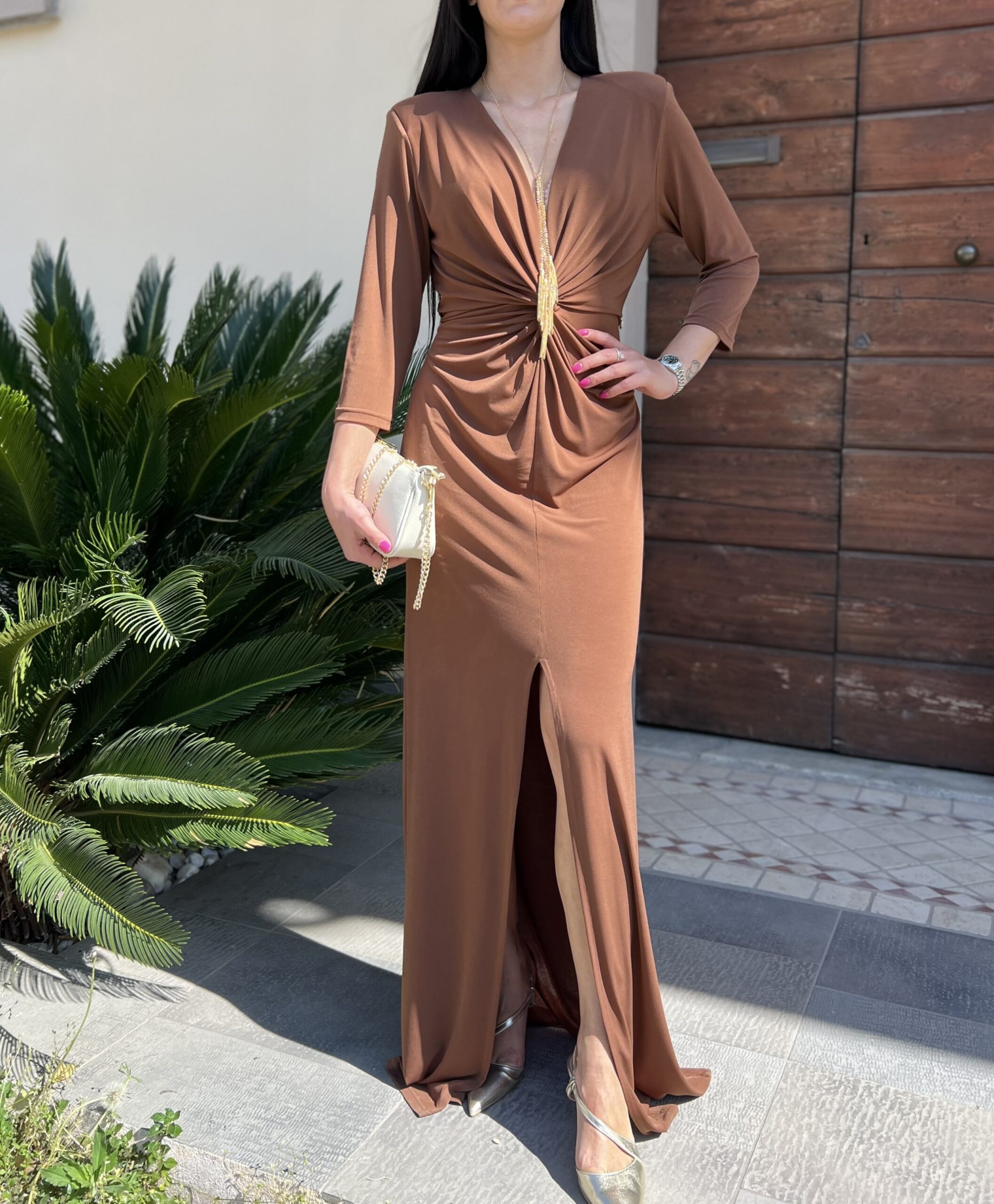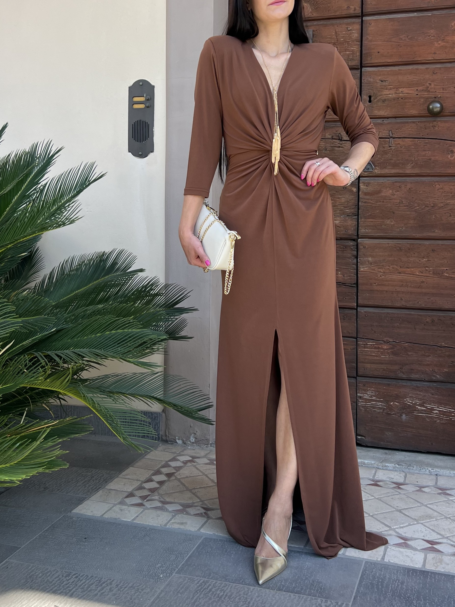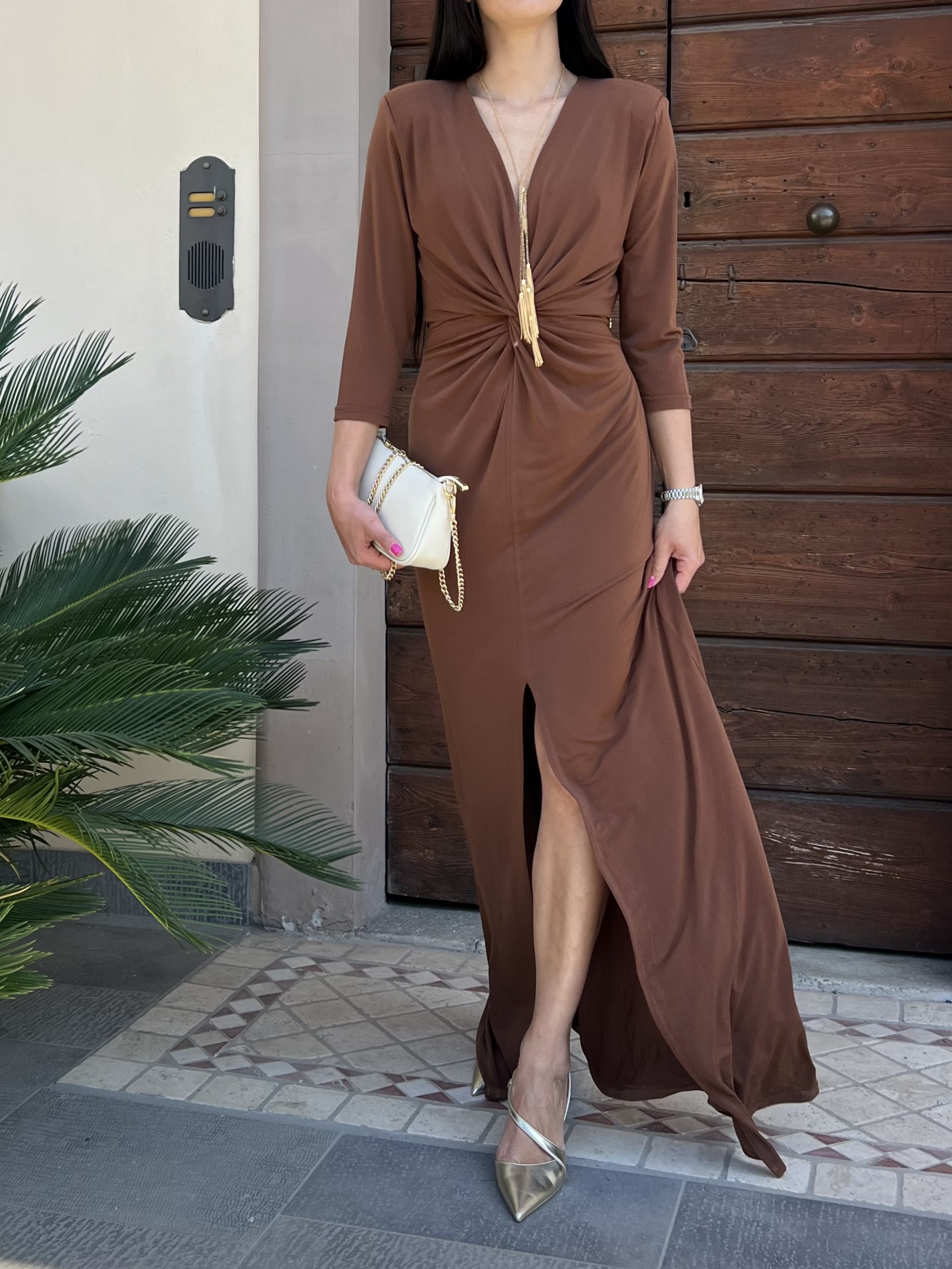 Abito cin spallina imbottita e manica a tre quarti. Scollo incrociato con nodo e spacco centrale. Taglia Xs per 38/40 S 40/42 e M 42/44.