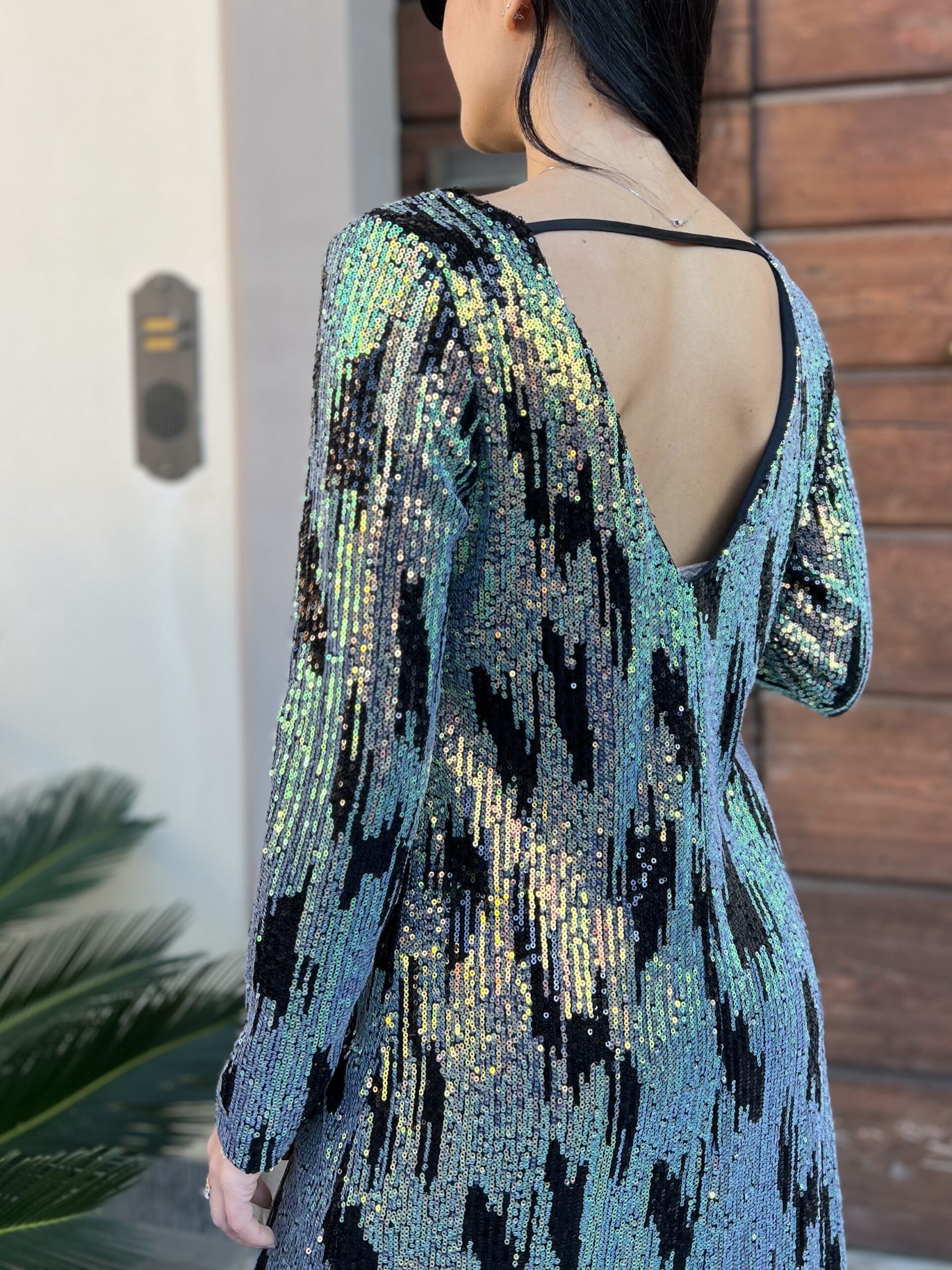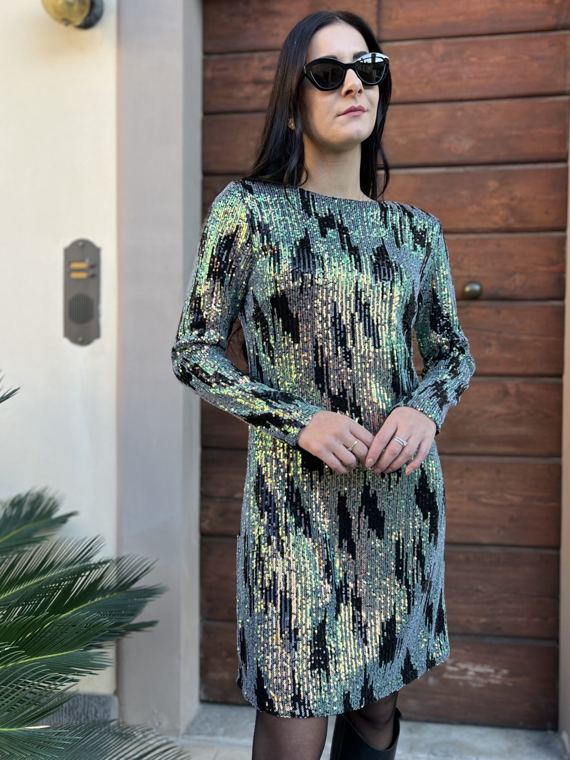 Abito in paillettes, modello sfiancato ma non troppo aderente, con scollo sul retro. Taglia XS/S per 38/40.