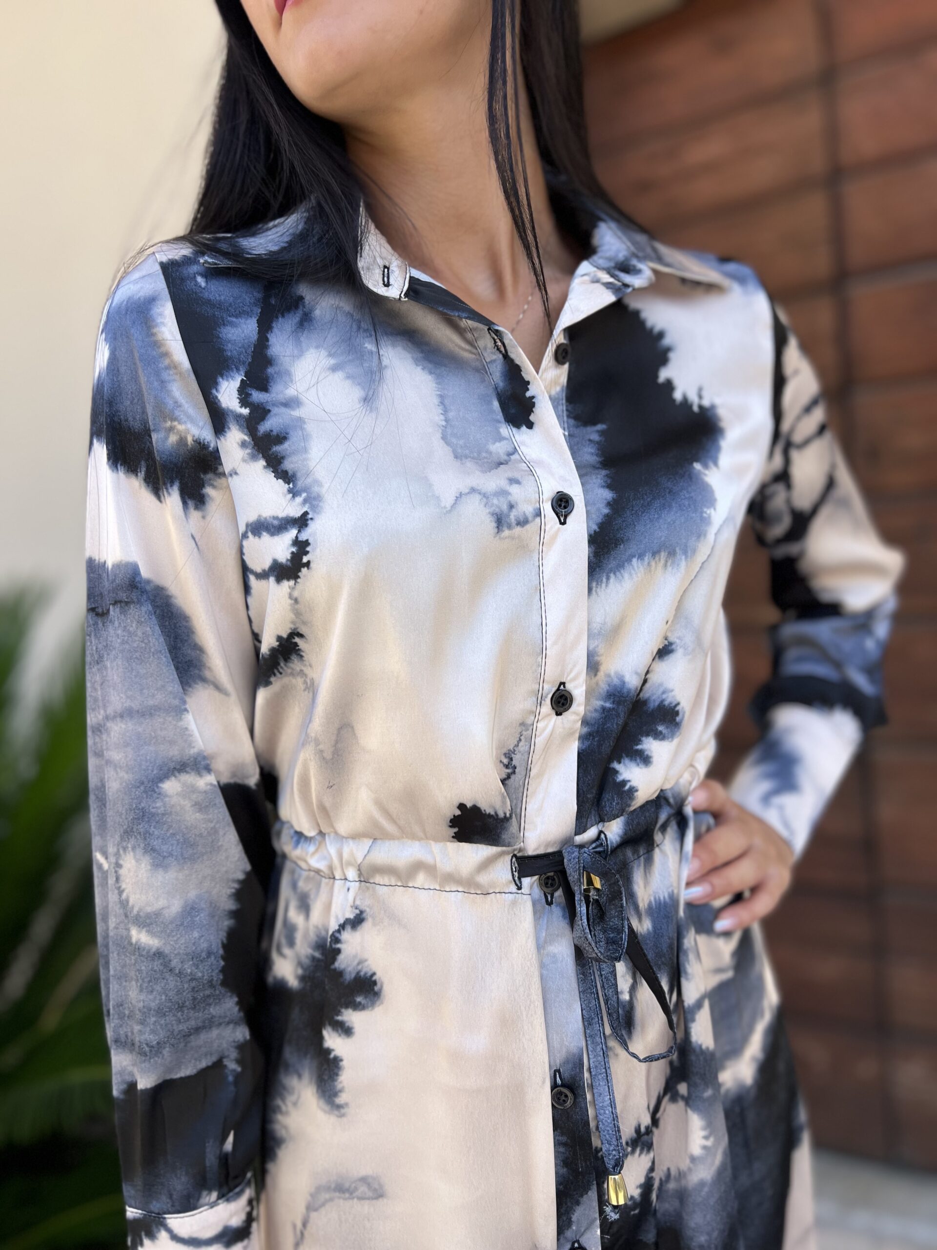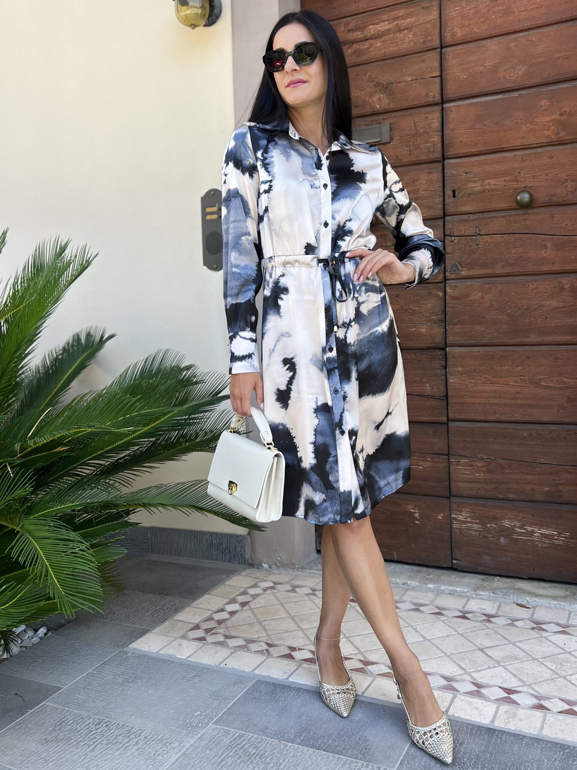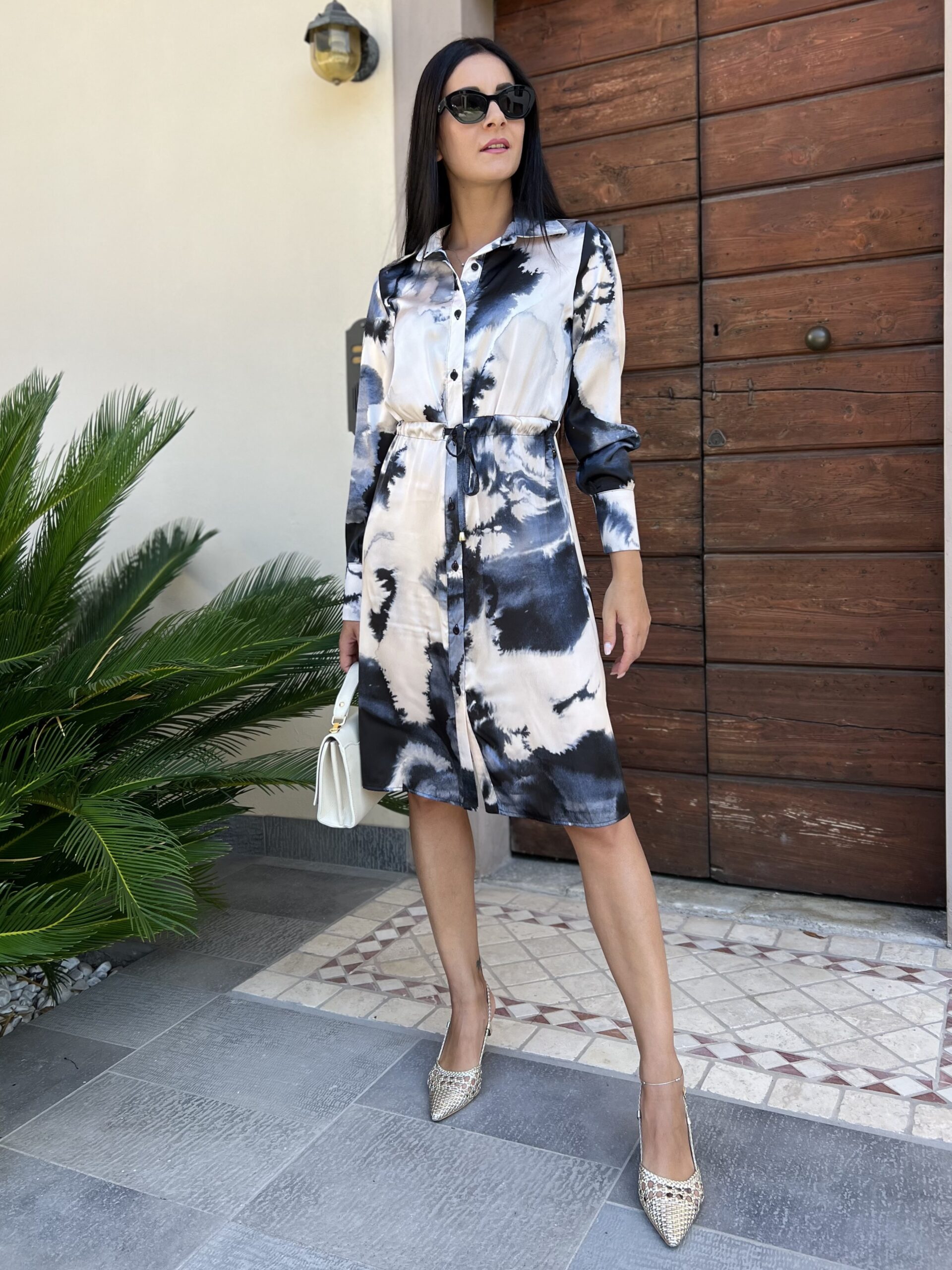 Abito in raso di viscosa, modello chemisier con colletto classico e manica regolare, lunghezza appena sotto al ginocchio e coulisse per stringere il punto vita. Taglia Xs per 38/40, S per 40/42, M per 42/44 e L per 44/46.