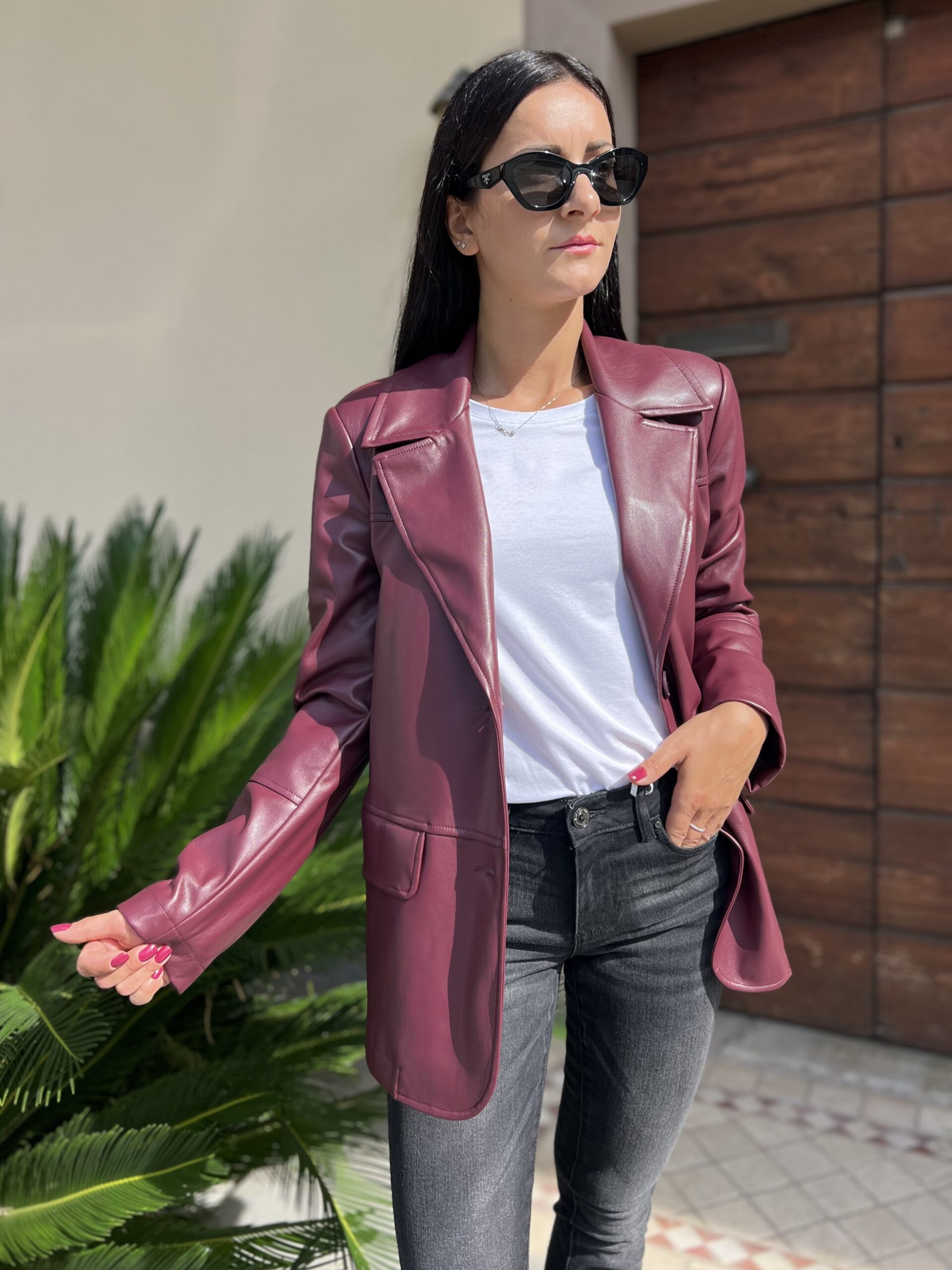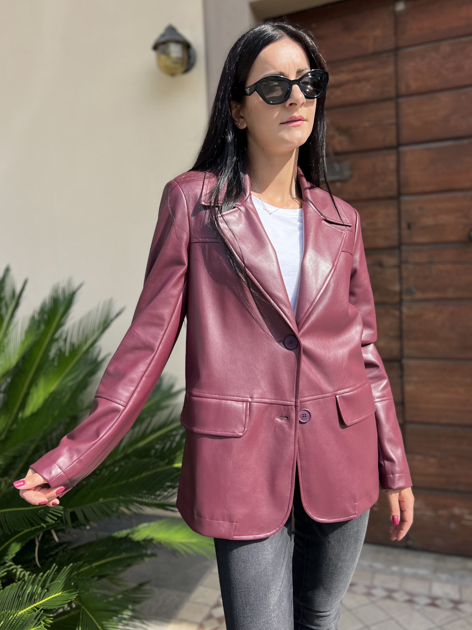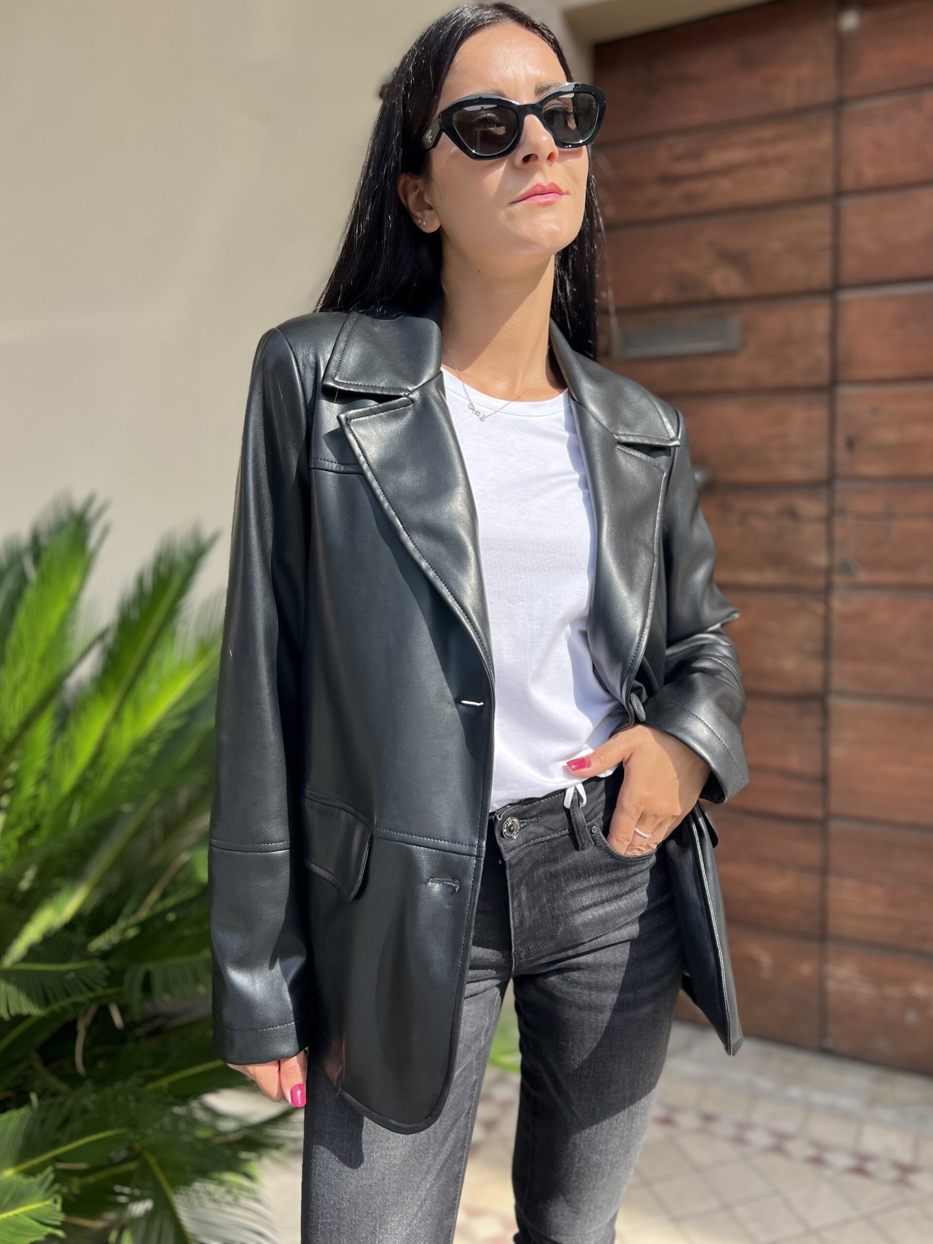Blazer in ecopelle morbidissima. Modello dal taglio dritto con revers classico, doppio bottone e fodera interna. La taglia S veste fino alla 42 e la M fino alla 46.