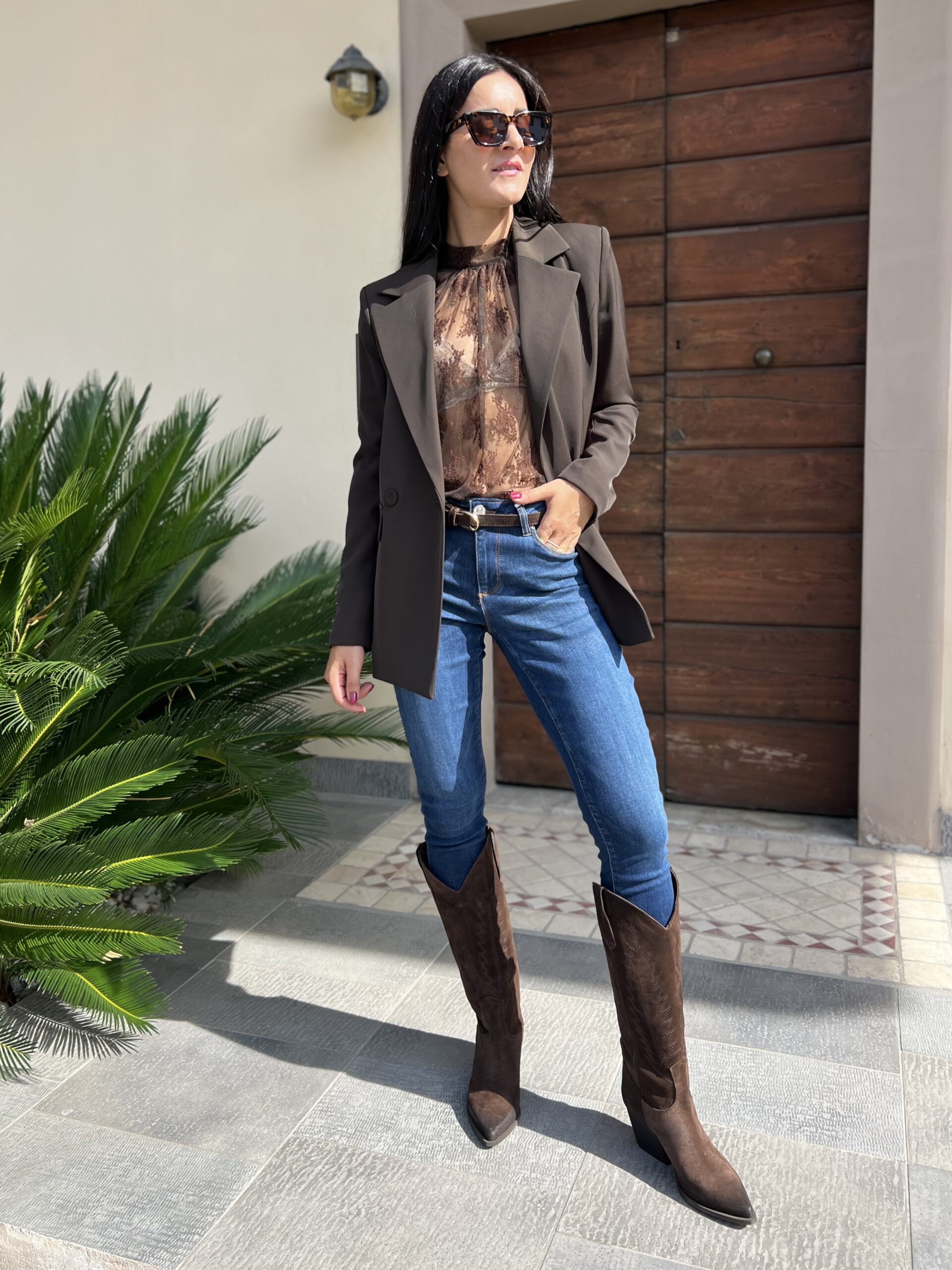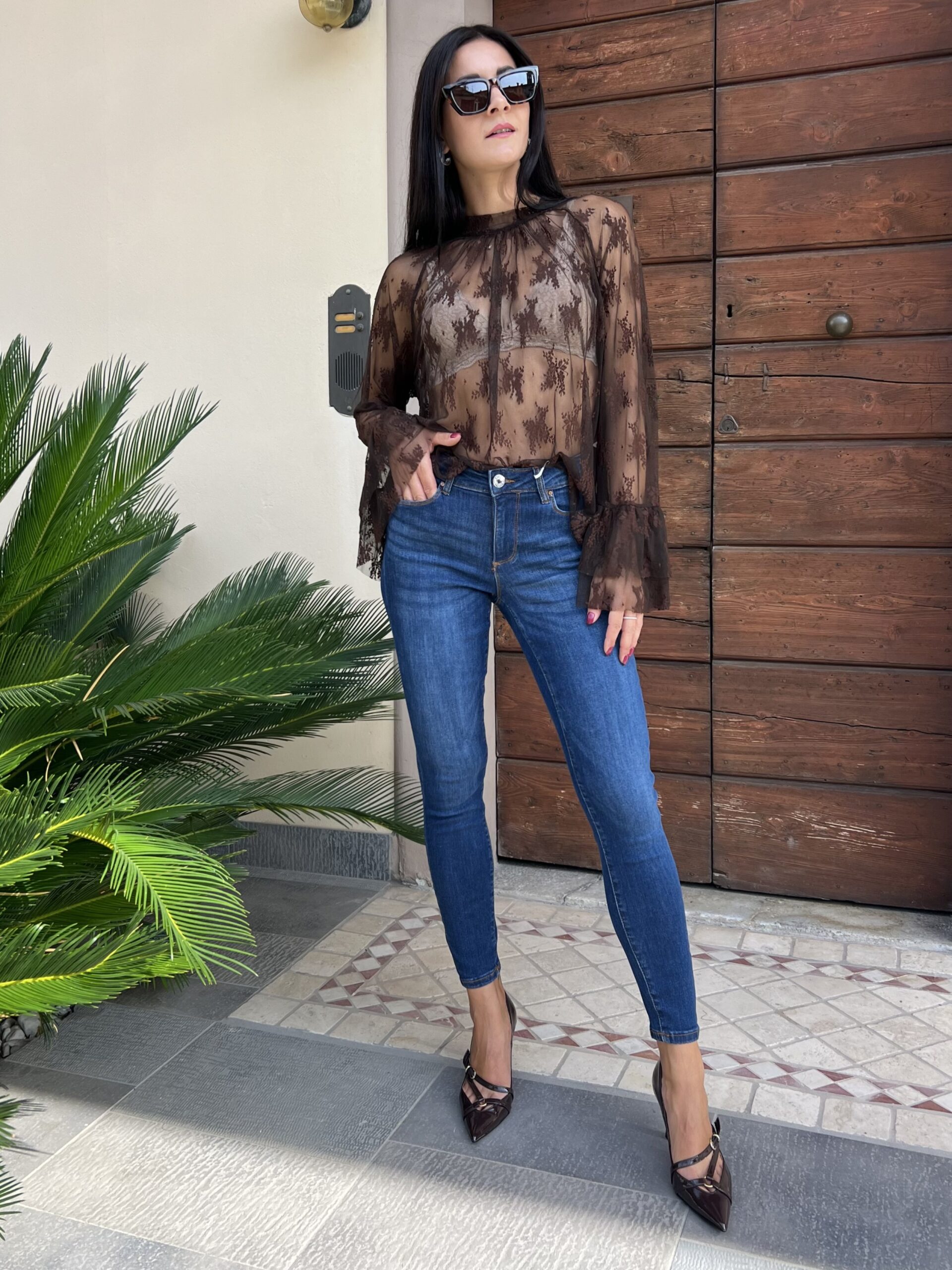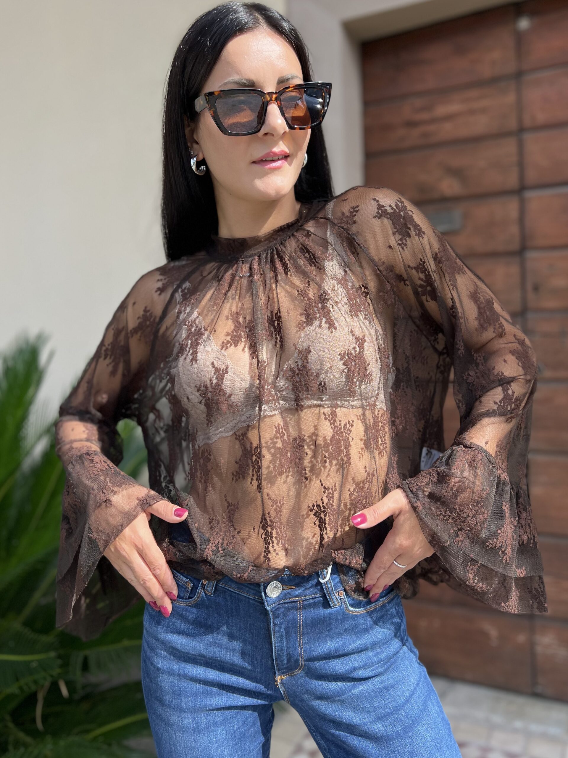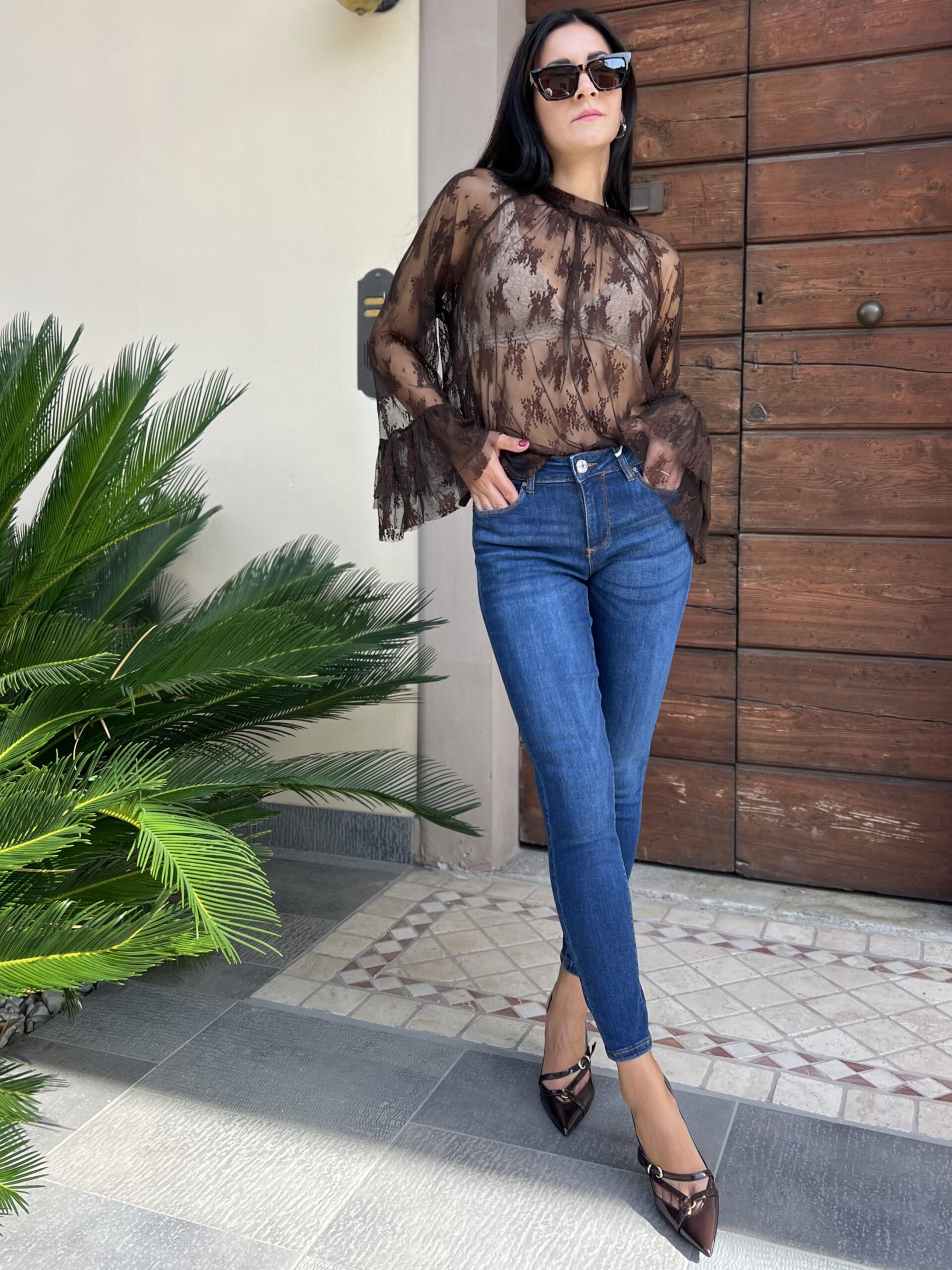 Blusa girocollo in pizzo, modello dal taglio dritto, lungo fino al fianco. Dettaglio polsino ampio a campana. Taglia S per 40/42 e M fino alla 44/46.