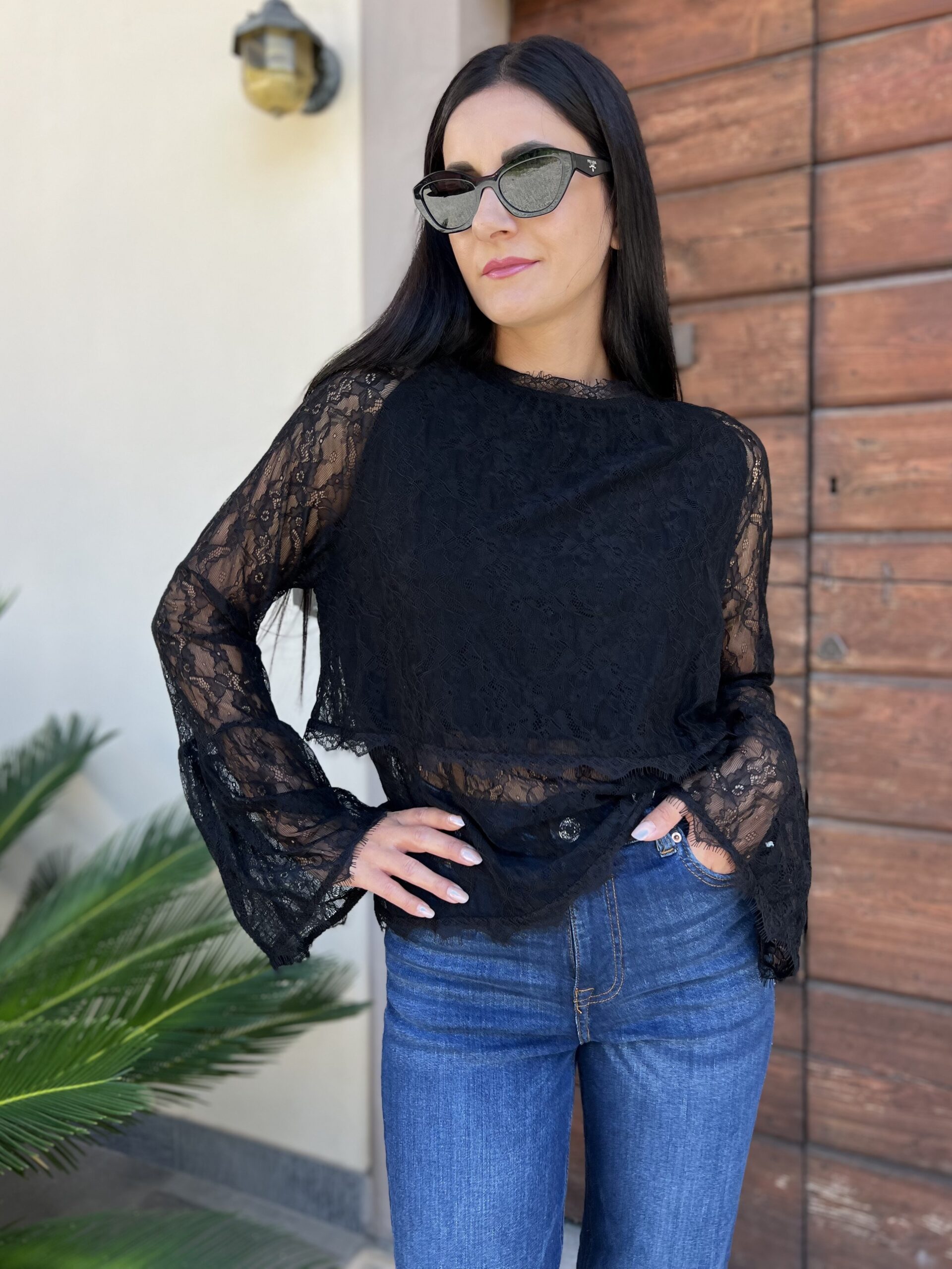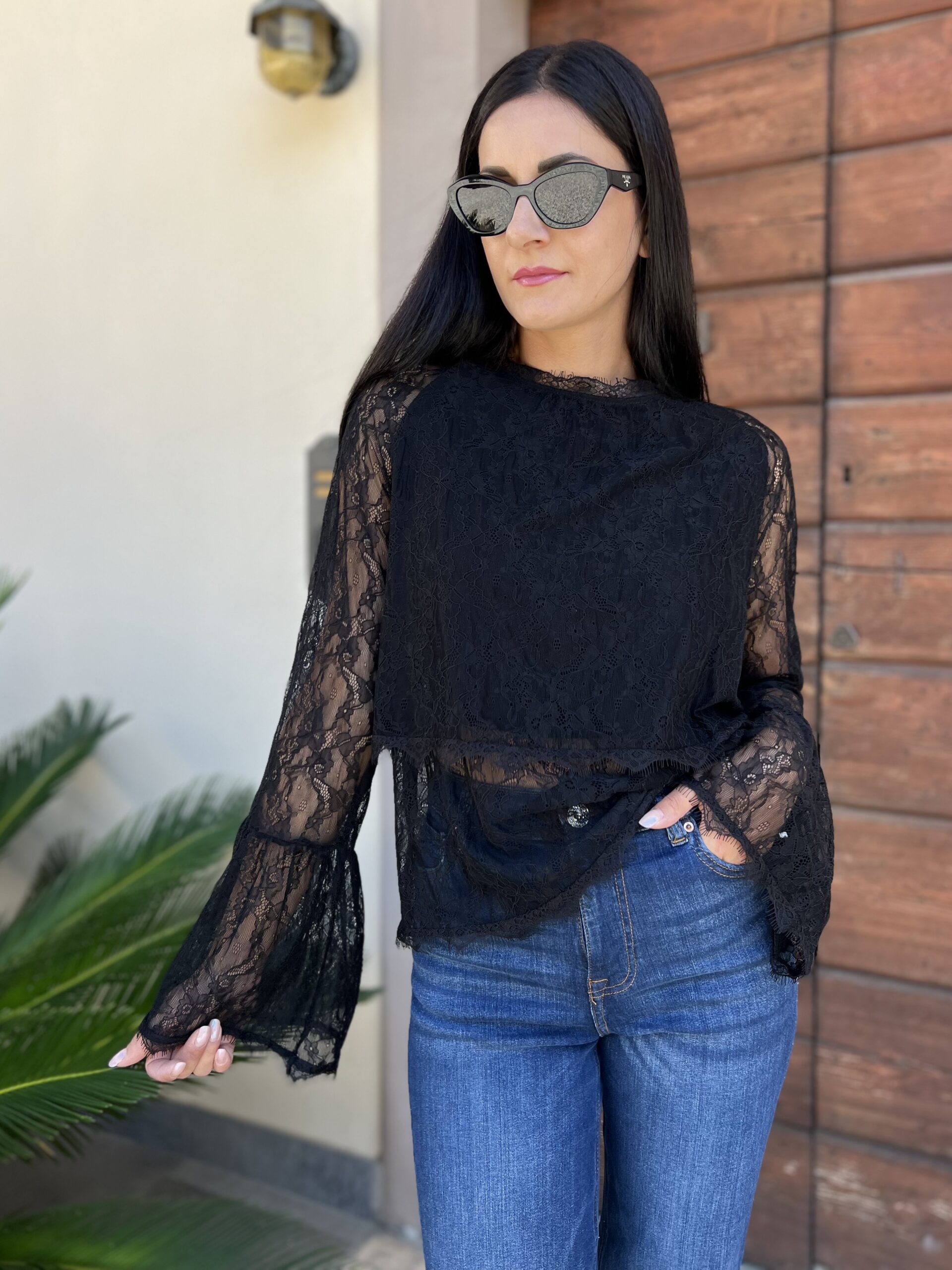 Blusa in pizzo dal taglio a scatola con doppio tessuto. Manica regolare con spalla scesa e polsino a campana. Veste ampio, la taglia M fino alla 46.