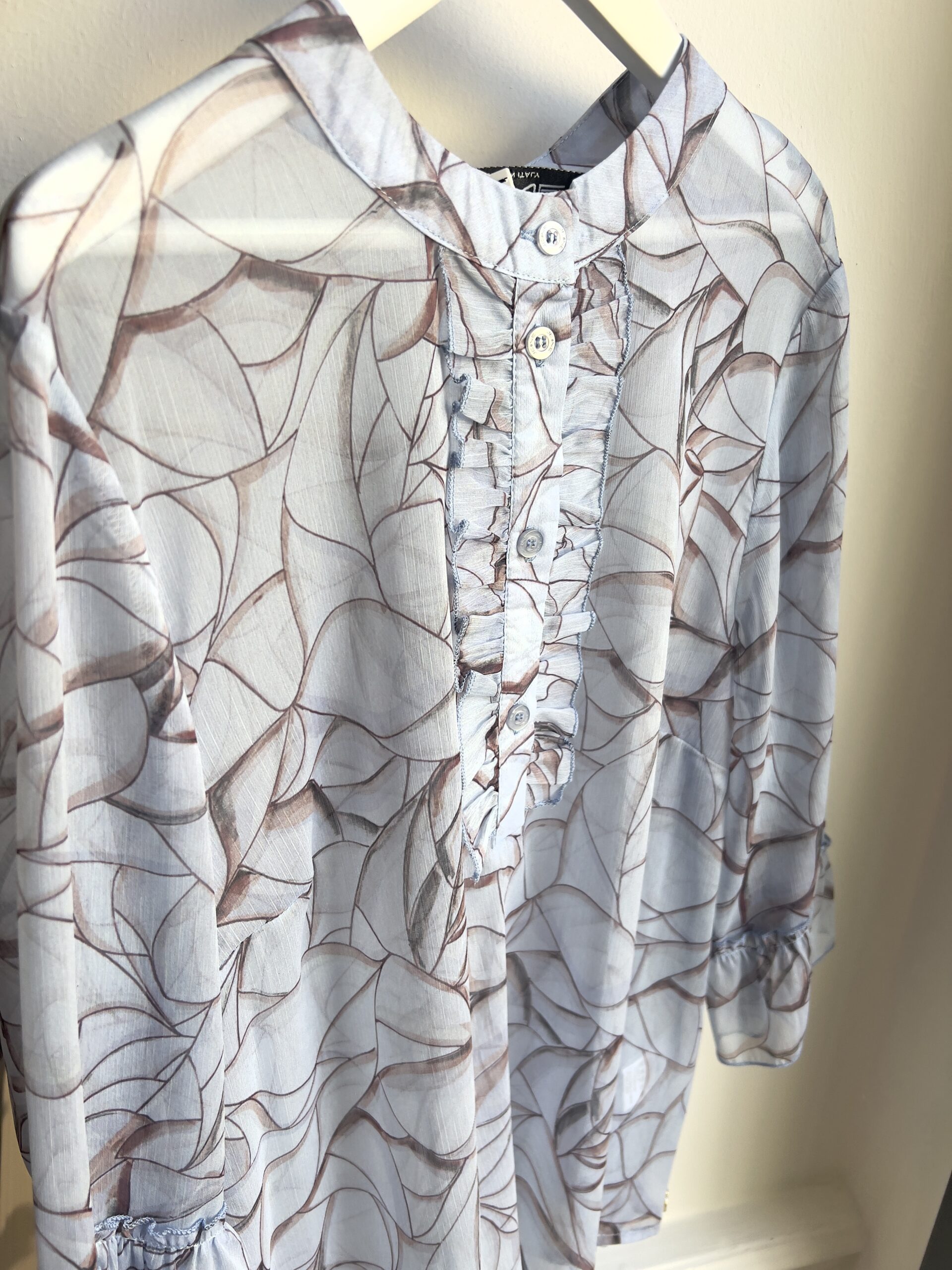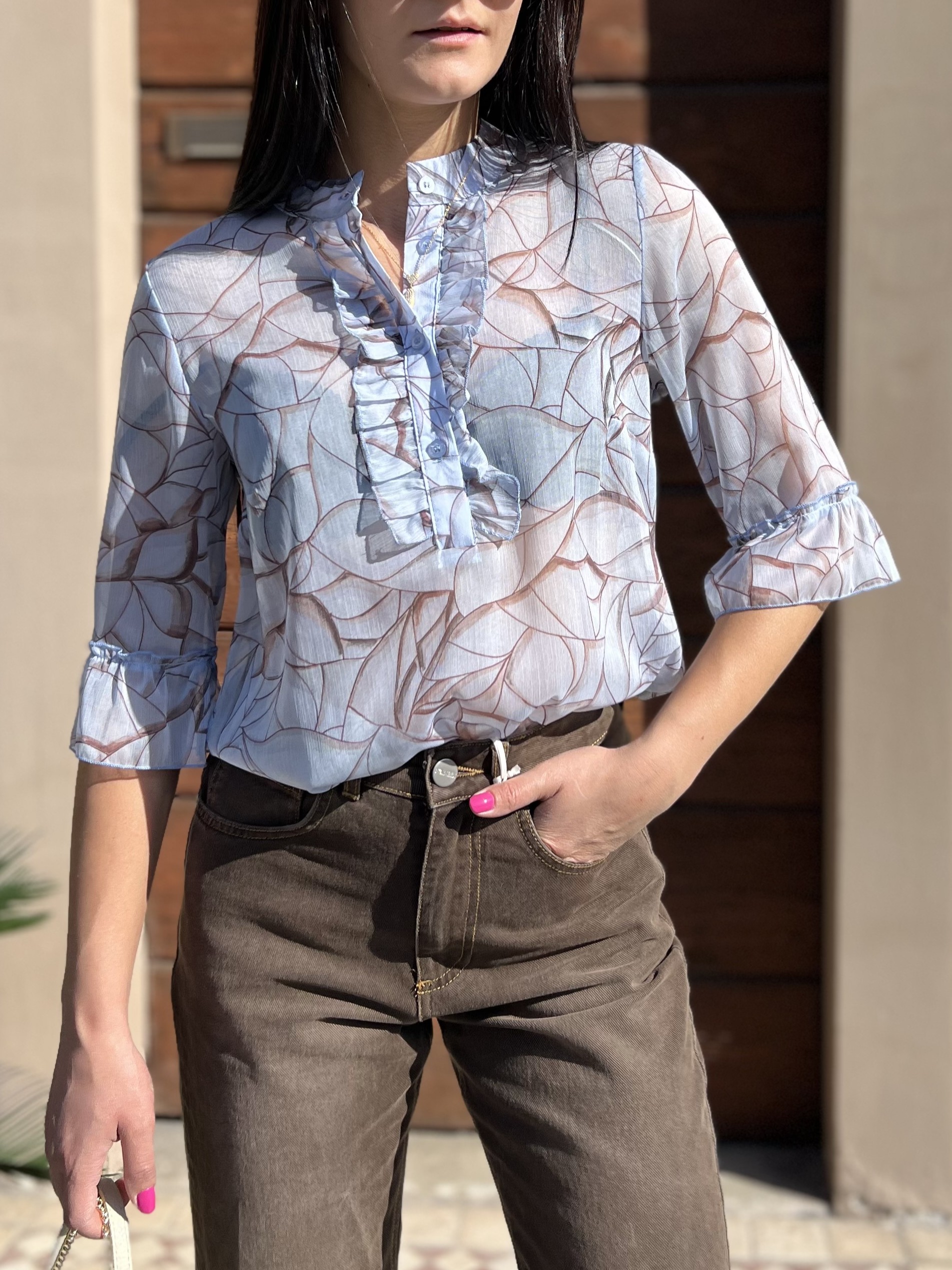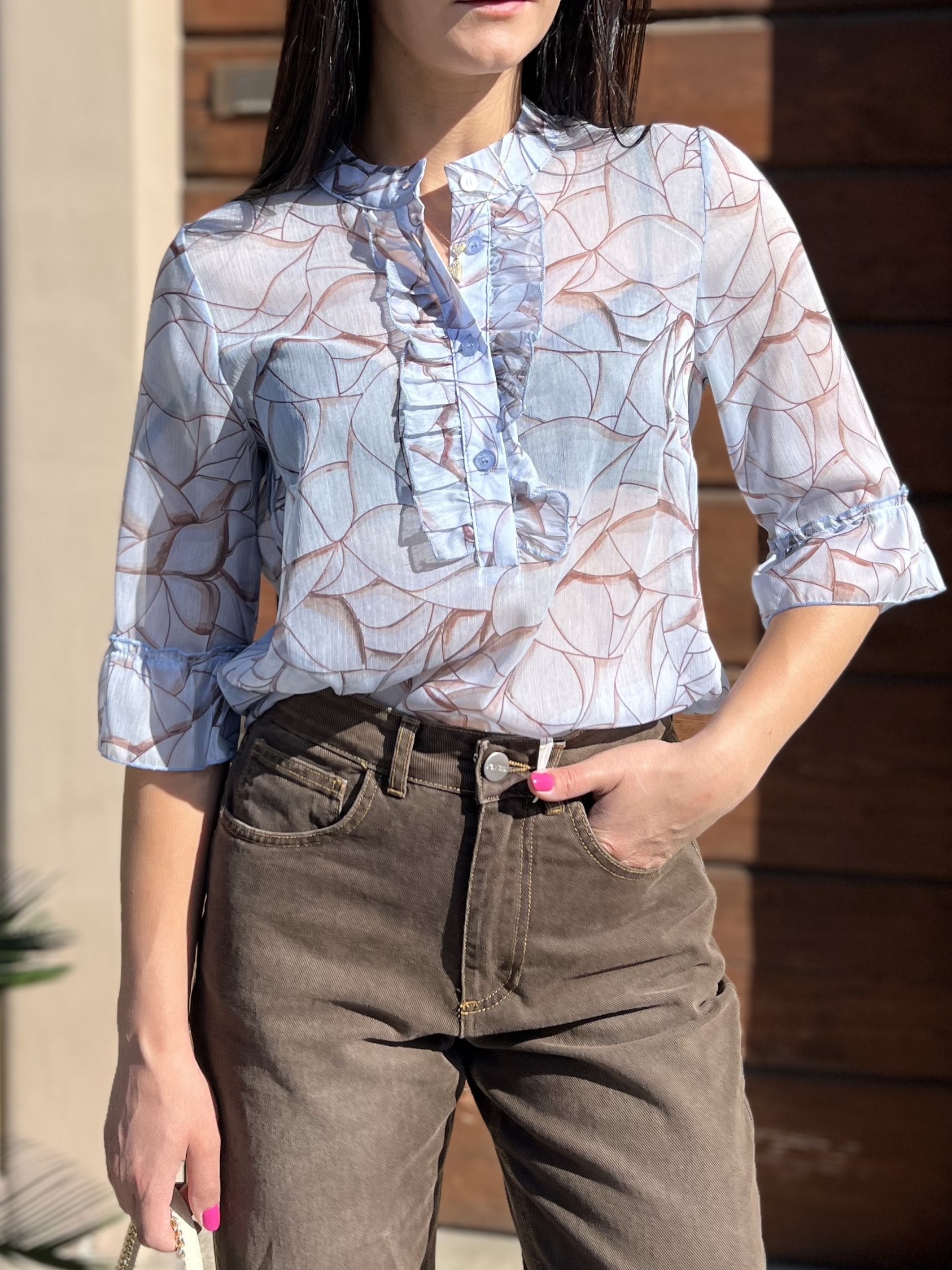 Blusa dal taglio dritto lungo fino al fianco con colletto alla coreana. Volant sull’abbottonatura e sulla manica a 3/4.