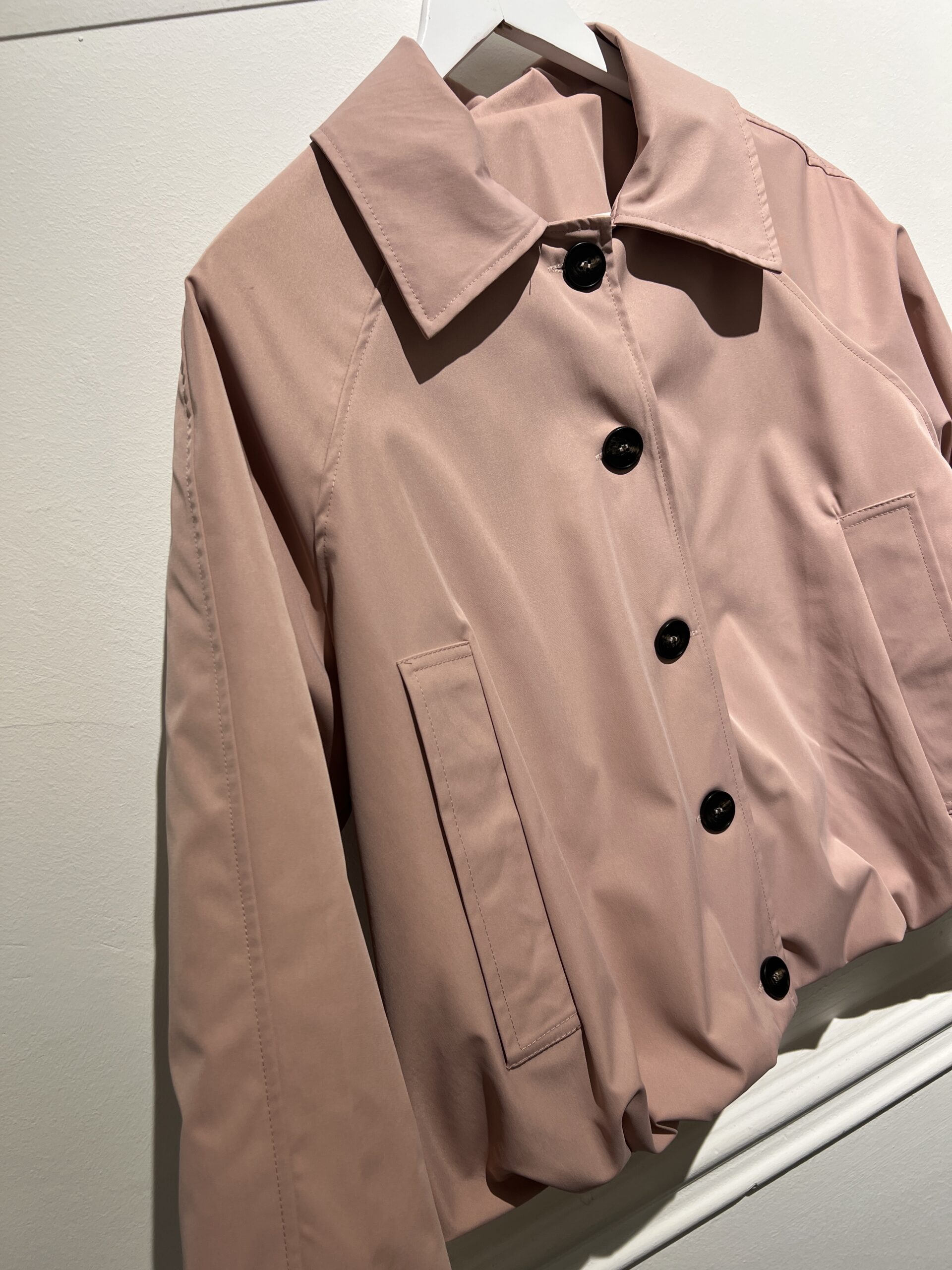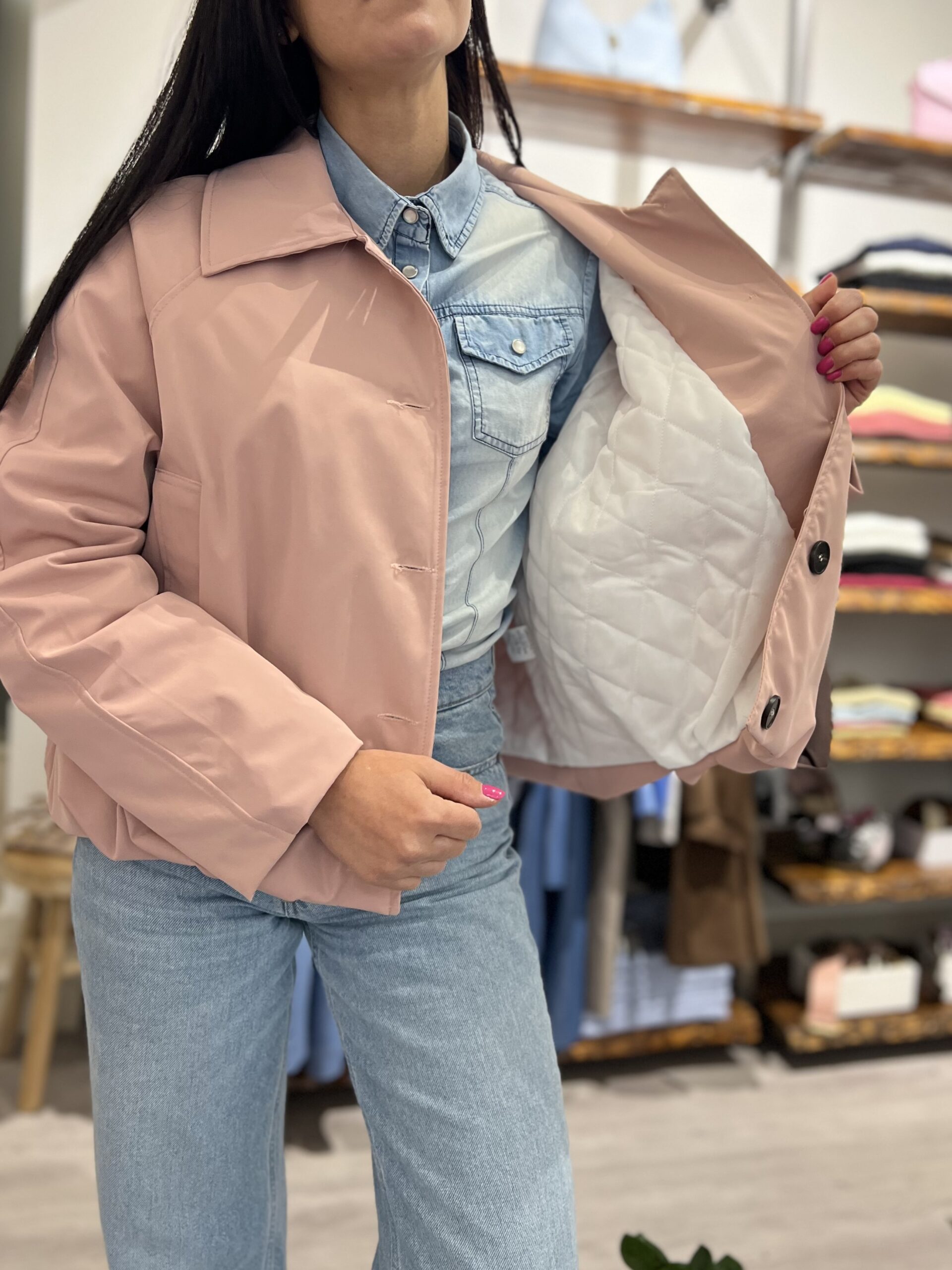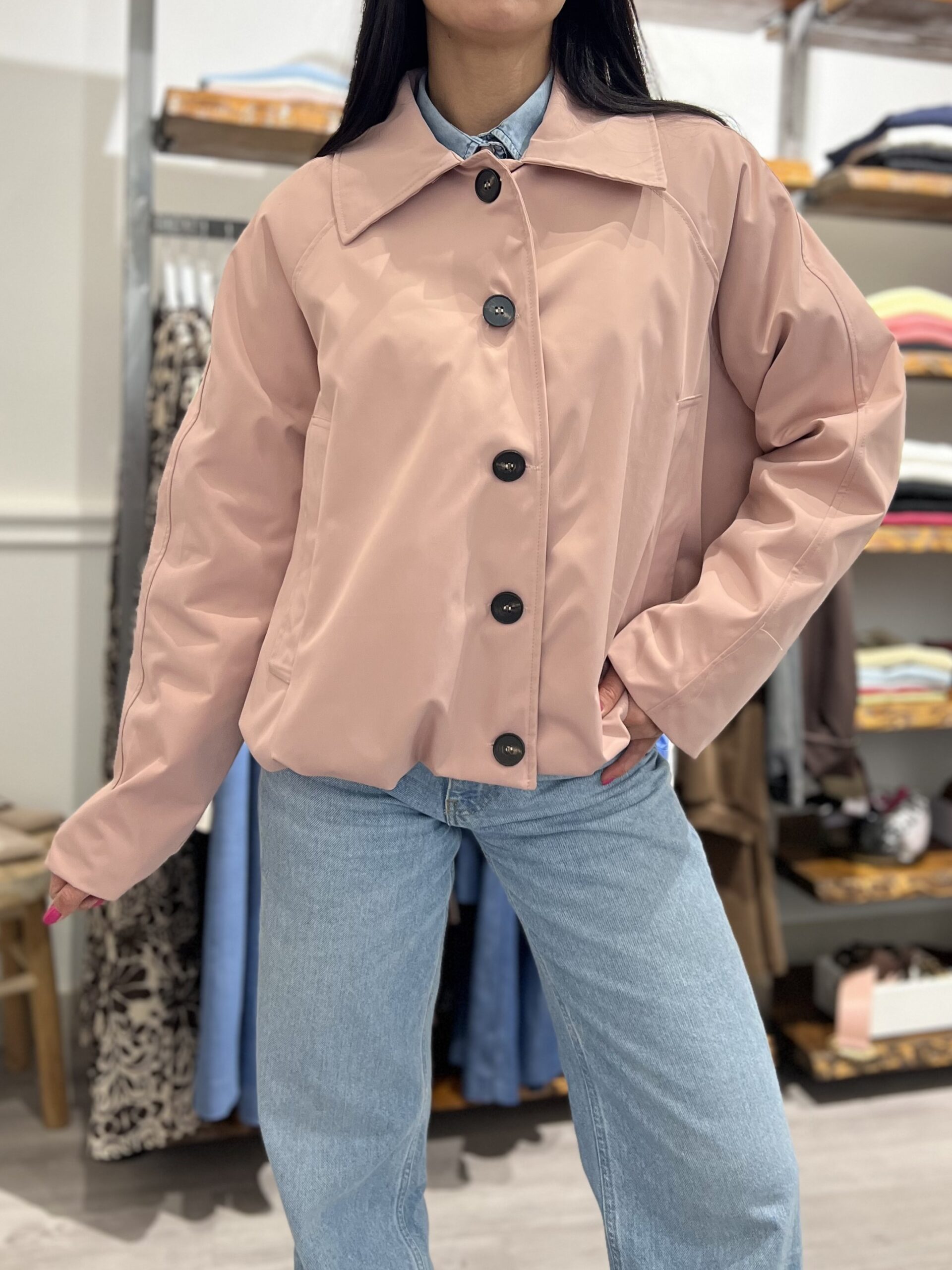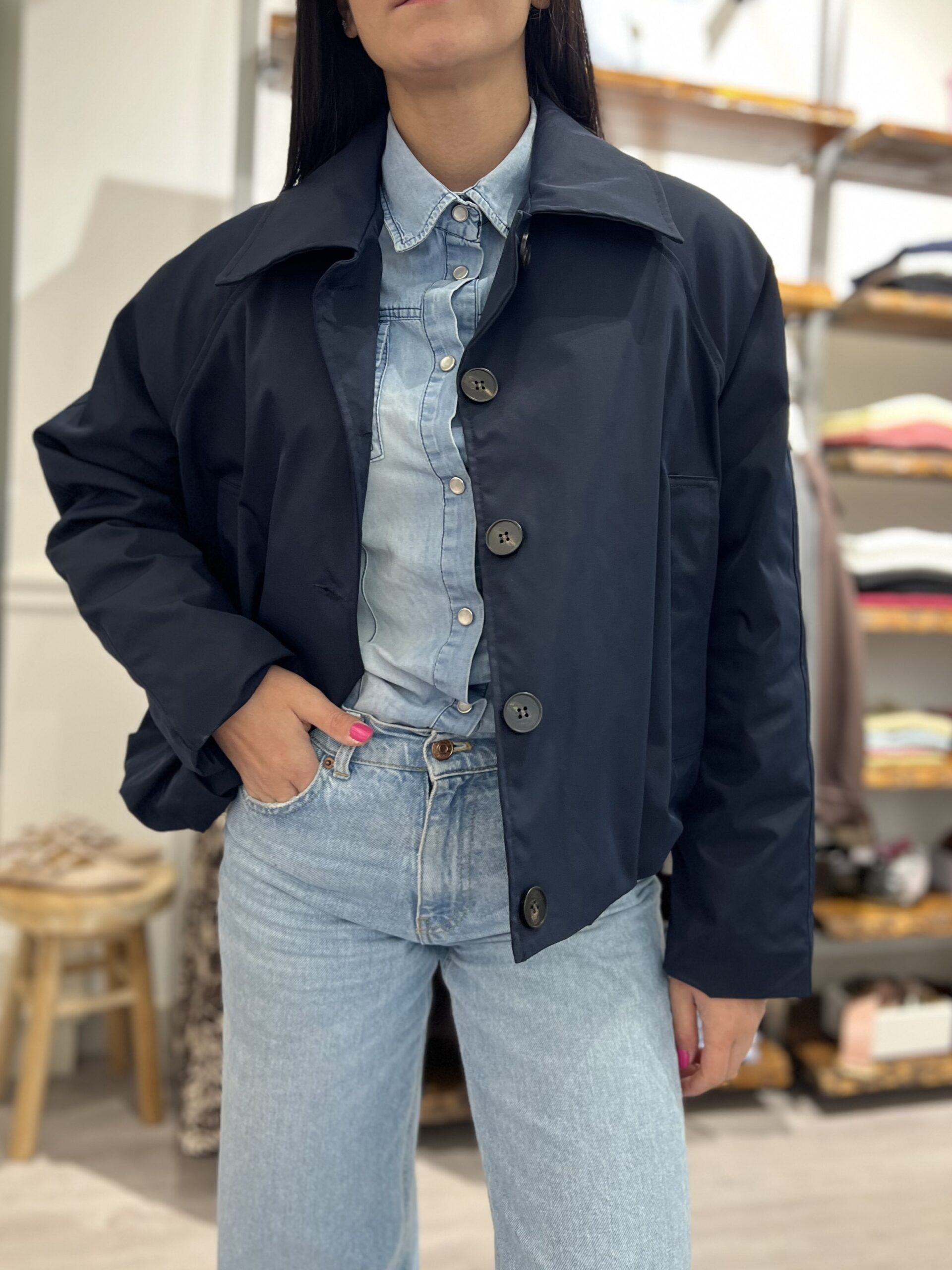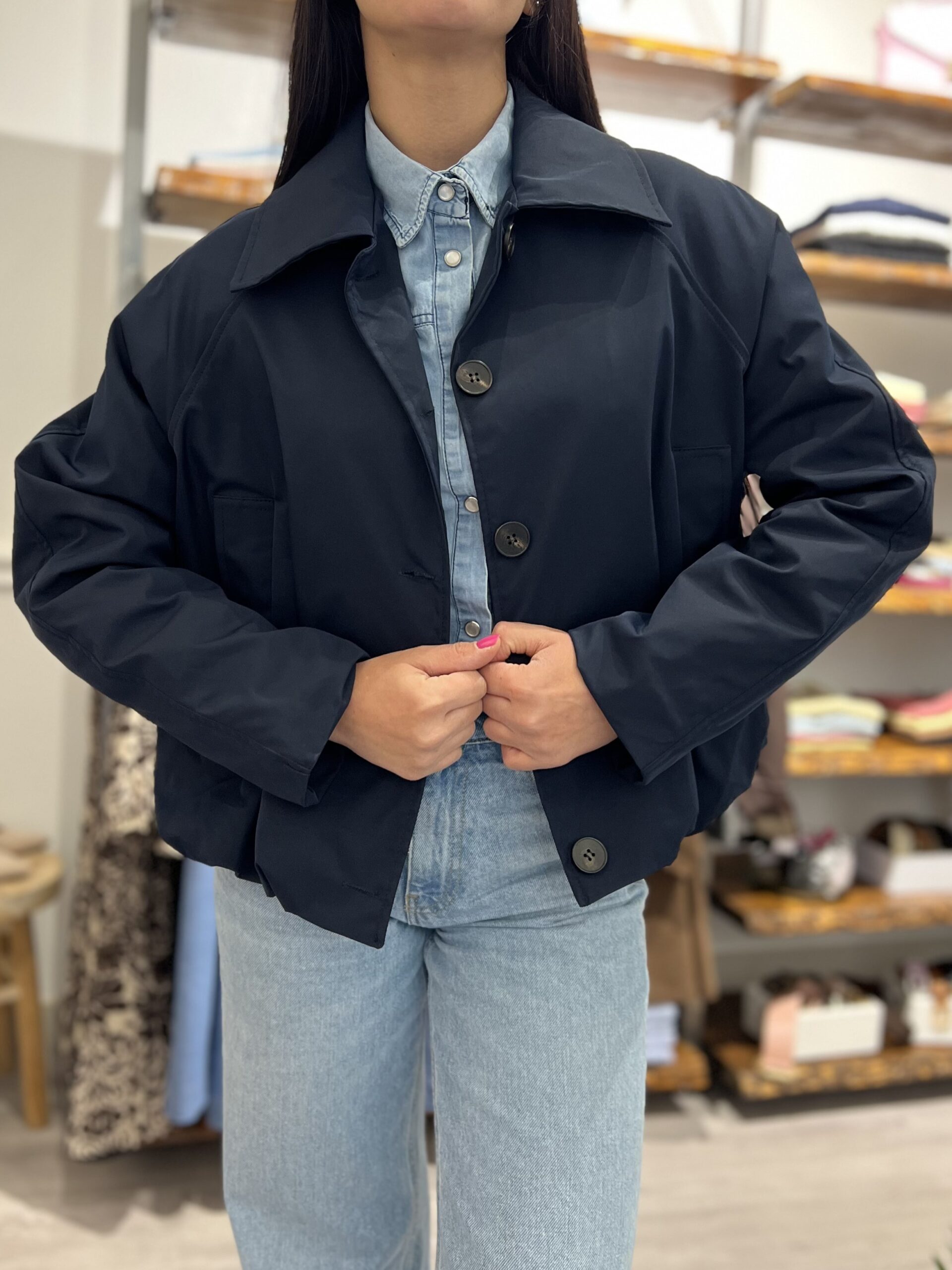Bomber leggermente imbottito con colletto classico, arricciatura sul fondo e chiusura con bottoni. Taglia unica veste fino alla M.