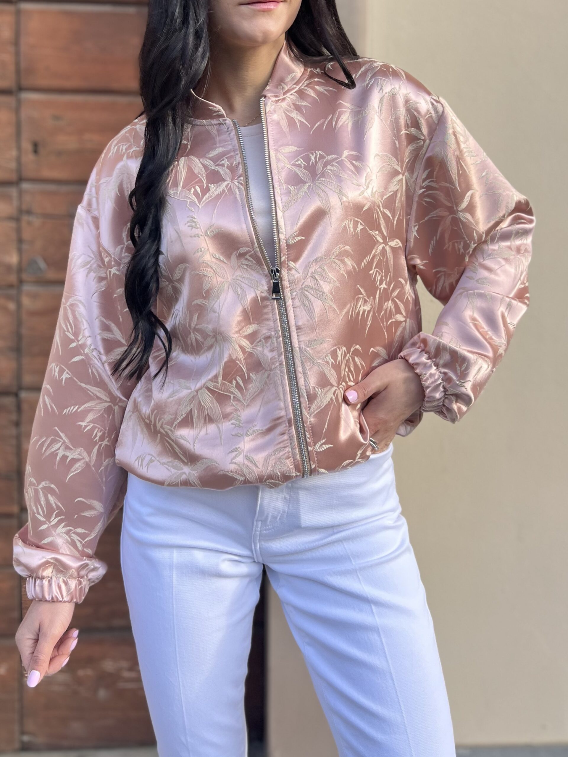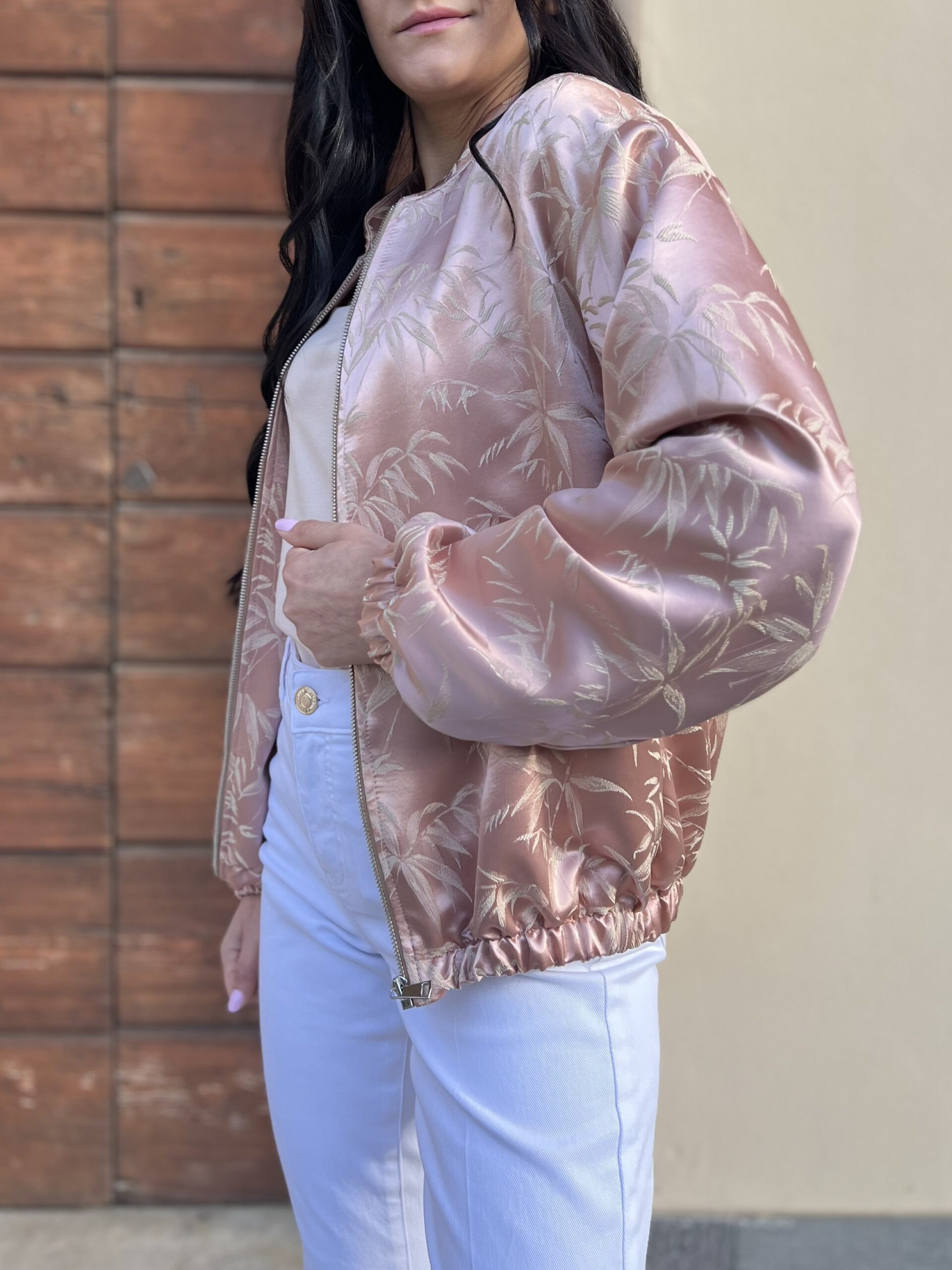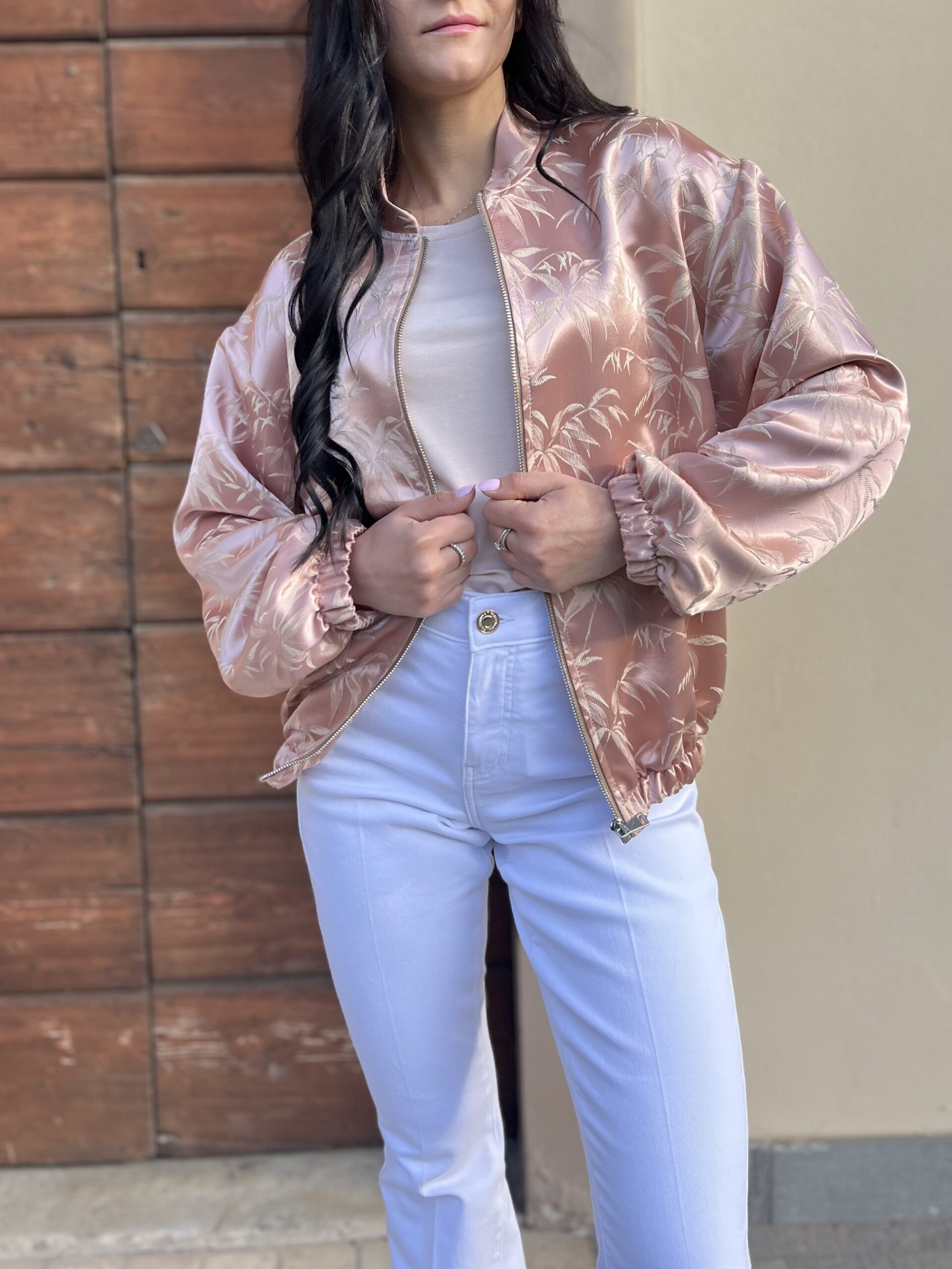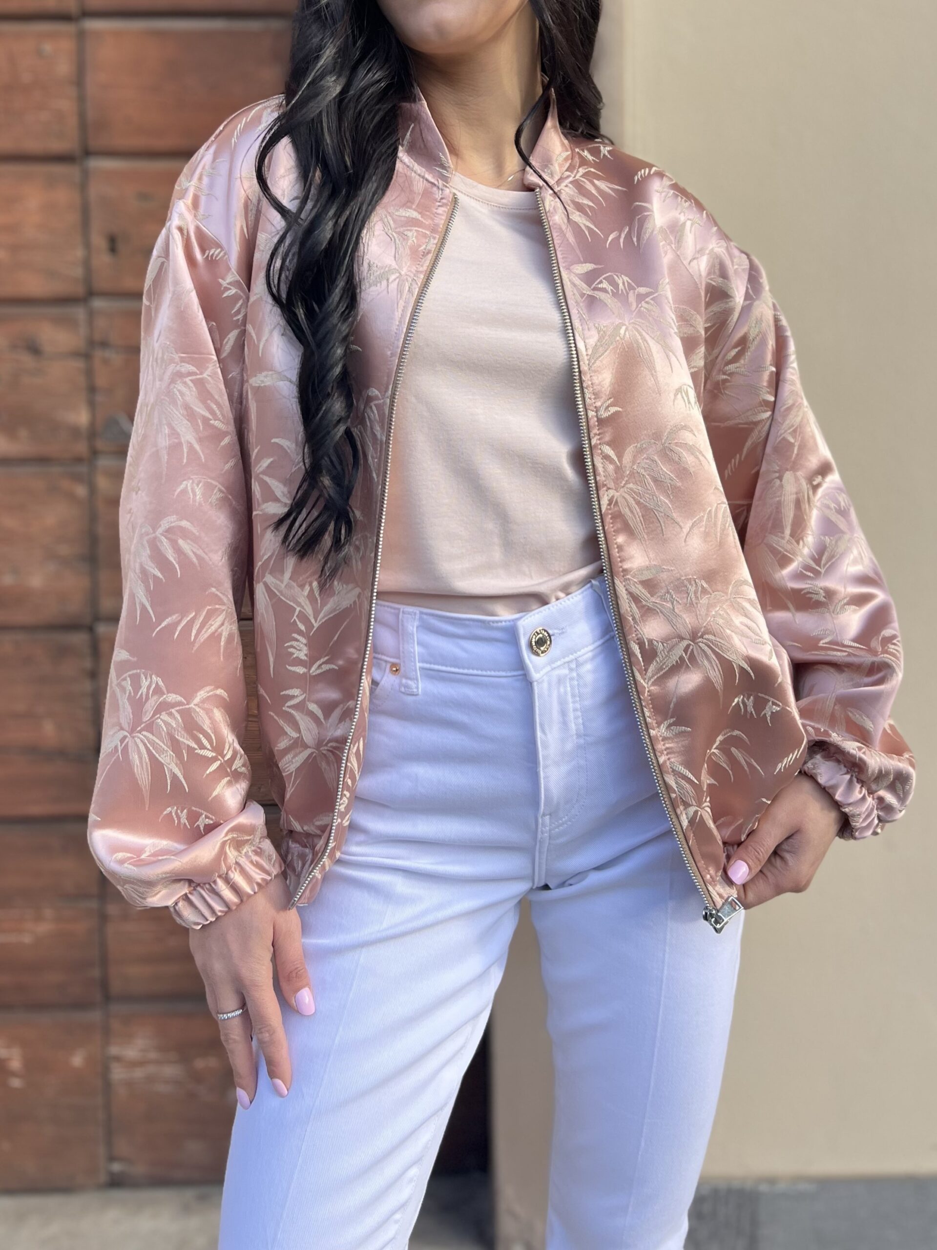 Bomber dal taglio ampio con spalla scesa, classico elastico sul fondo e tasche laterali. Modello foderato, effetto raso ricamato. La taglia M veste fino alla 46. Composizione 99% PL, 1% EA.