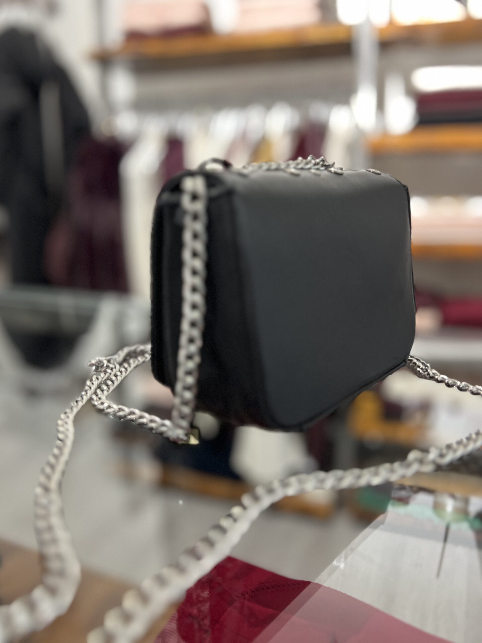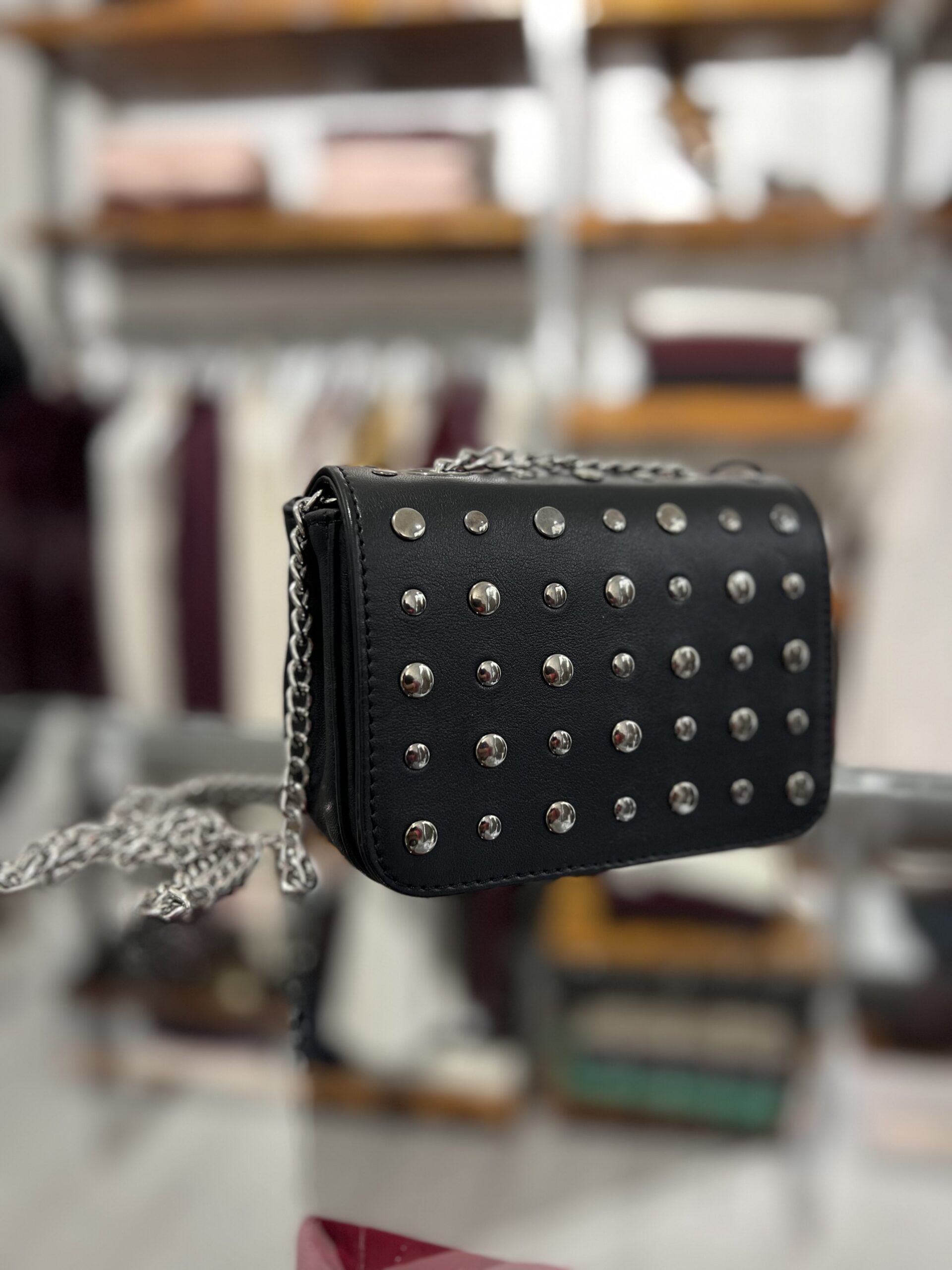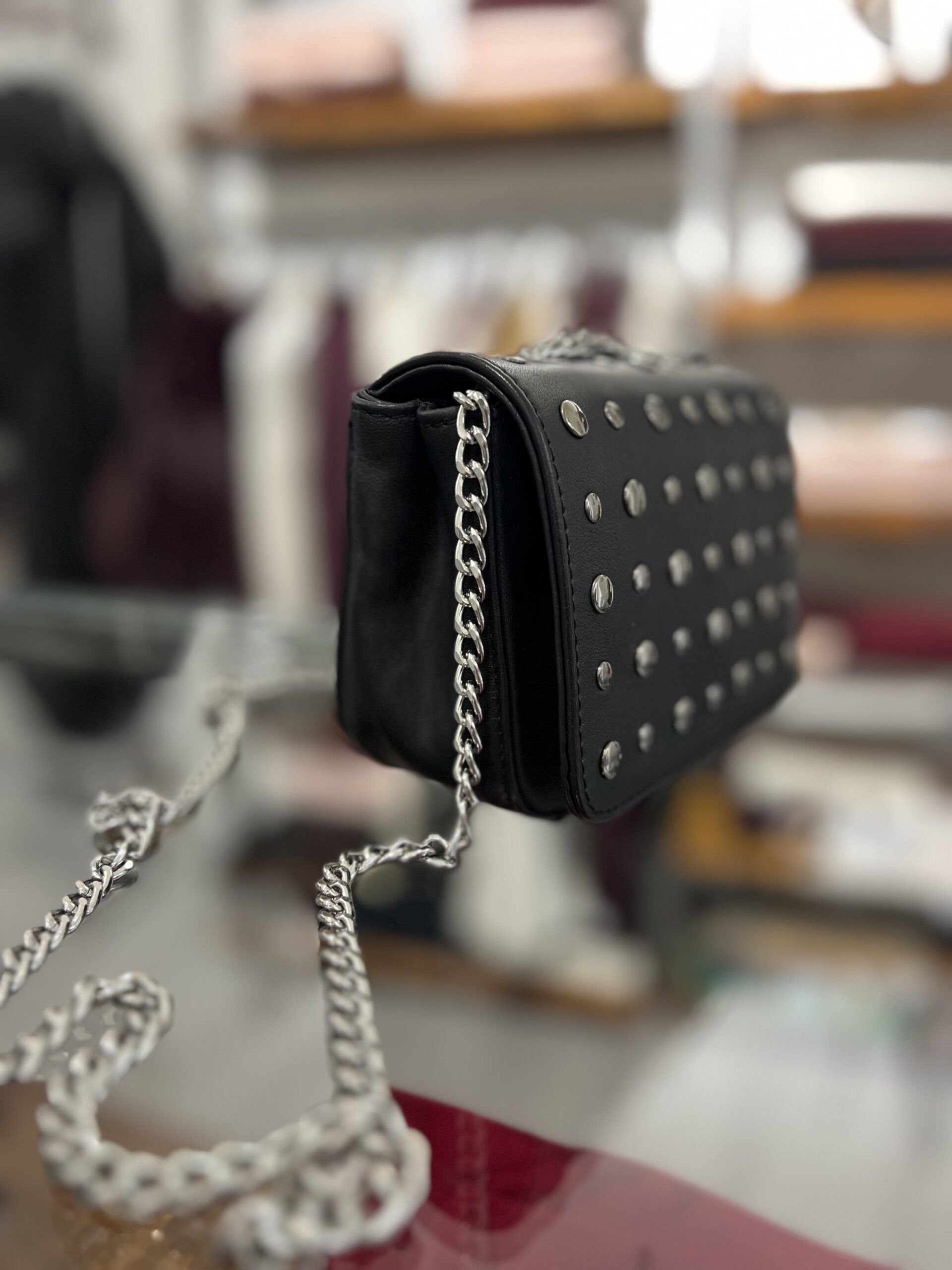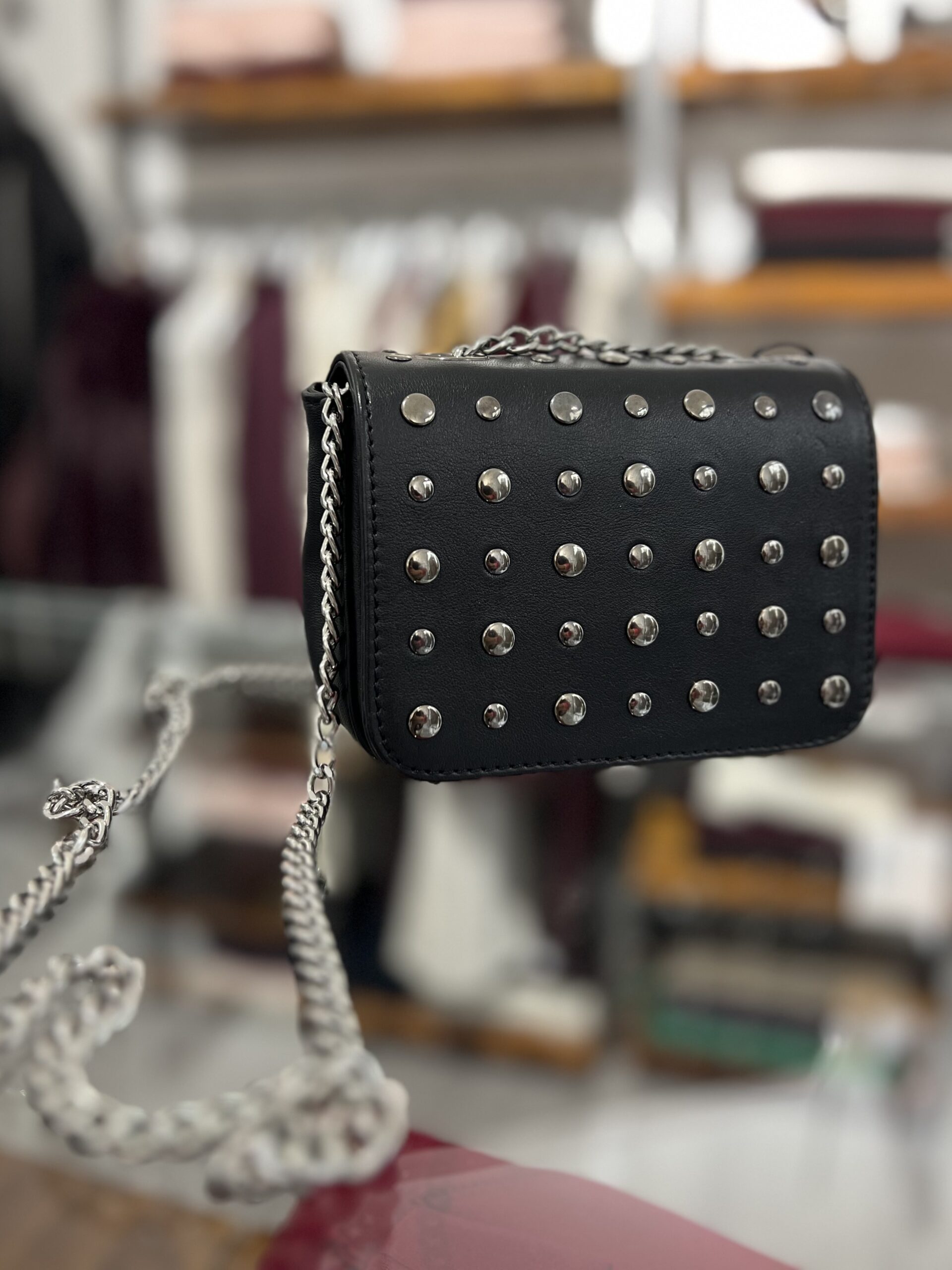 Borsa mini in vera pelle, modello con catena e borchie applicate. Misure: 16 cm, 11 cm, base 6 cm.