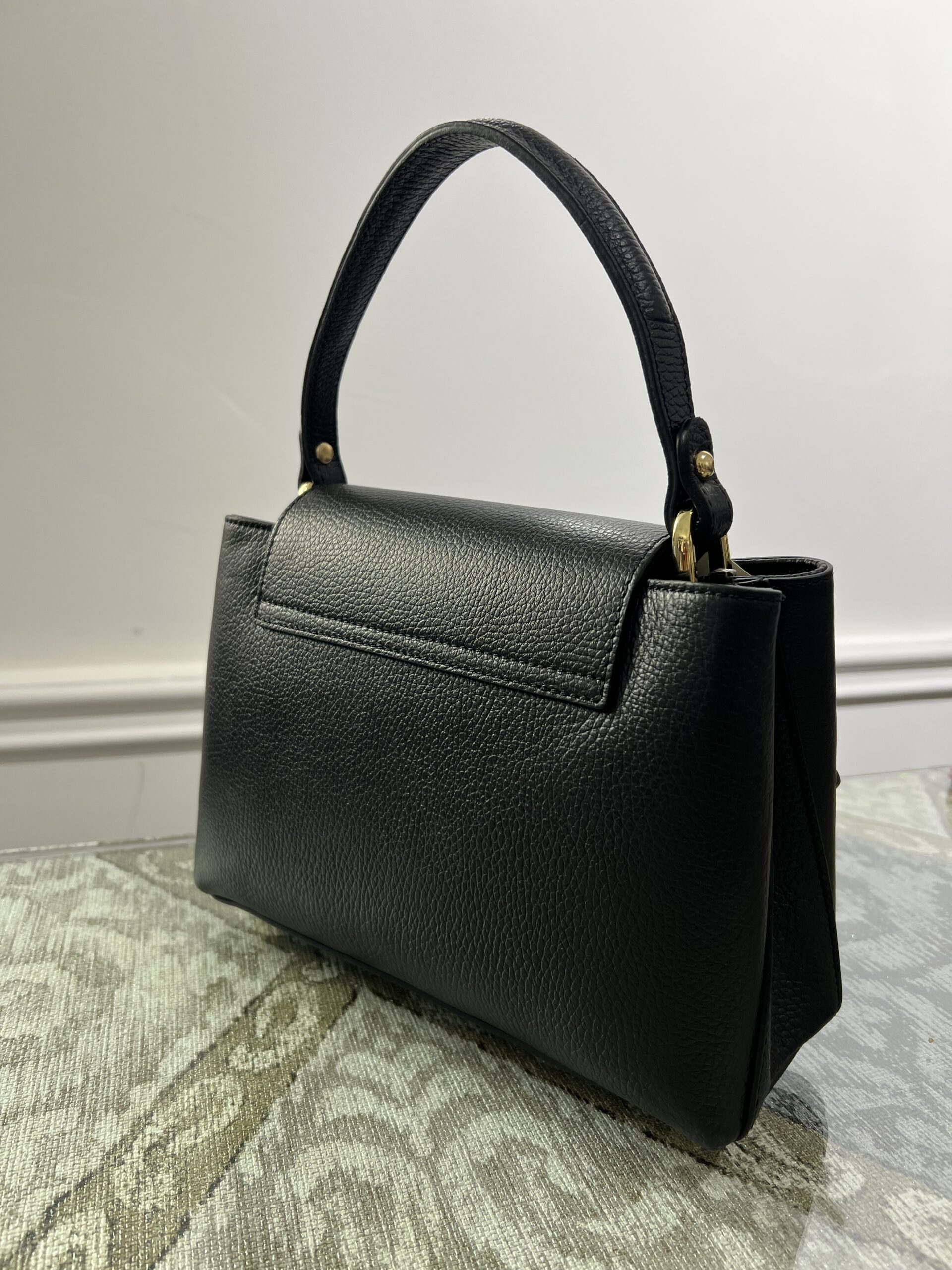 Borsa in vera pelle martellata con maniglia e tracolla. Modello rigide e capiente, all’interno uno scomparto centrale chiuso da zip che divide gli altri due scomparti, e doppia taschina interna. Chiusura con bottone a pressione nascosto. Misure 25 cm, 18 cm, base 9 cm.
