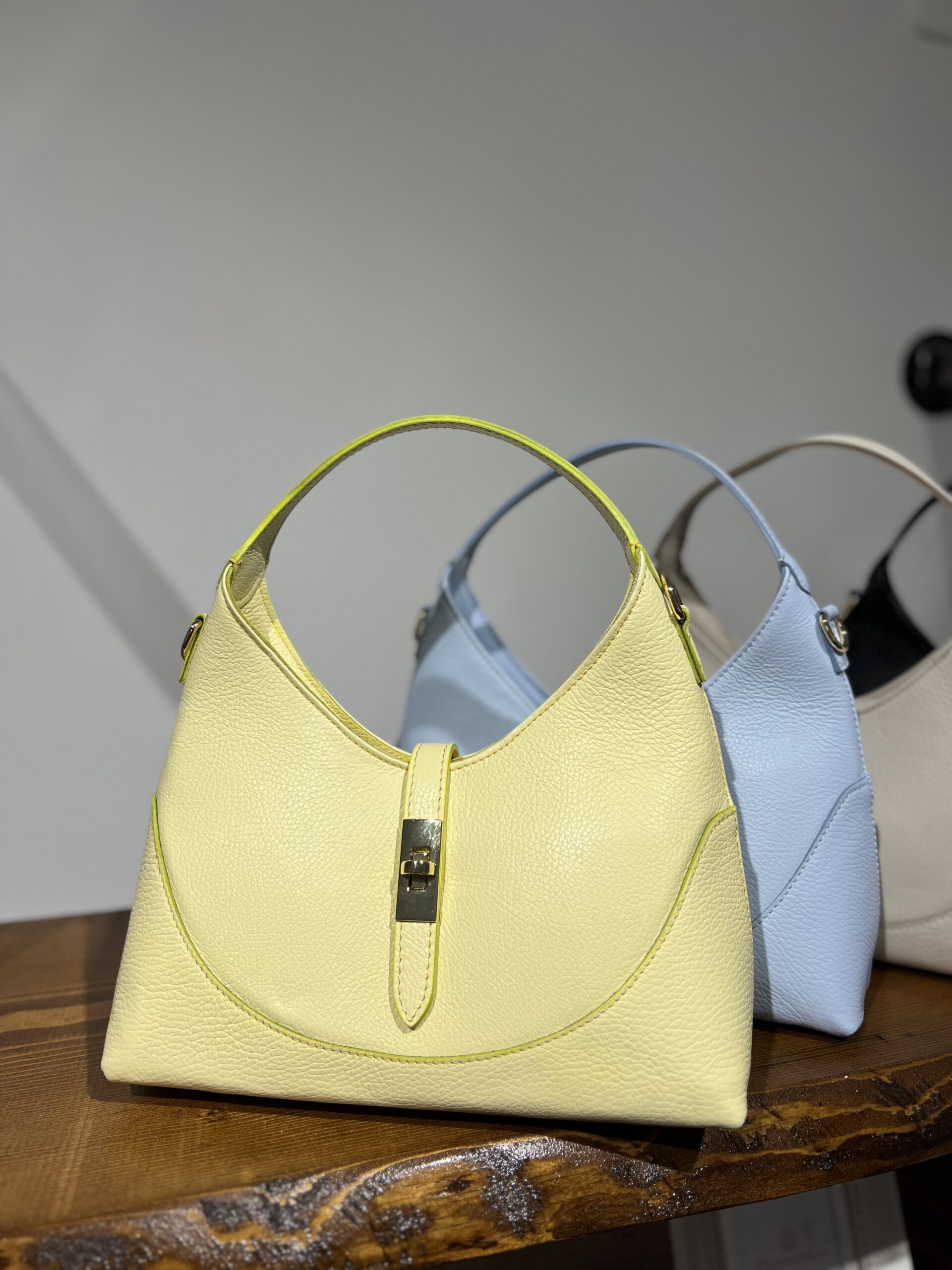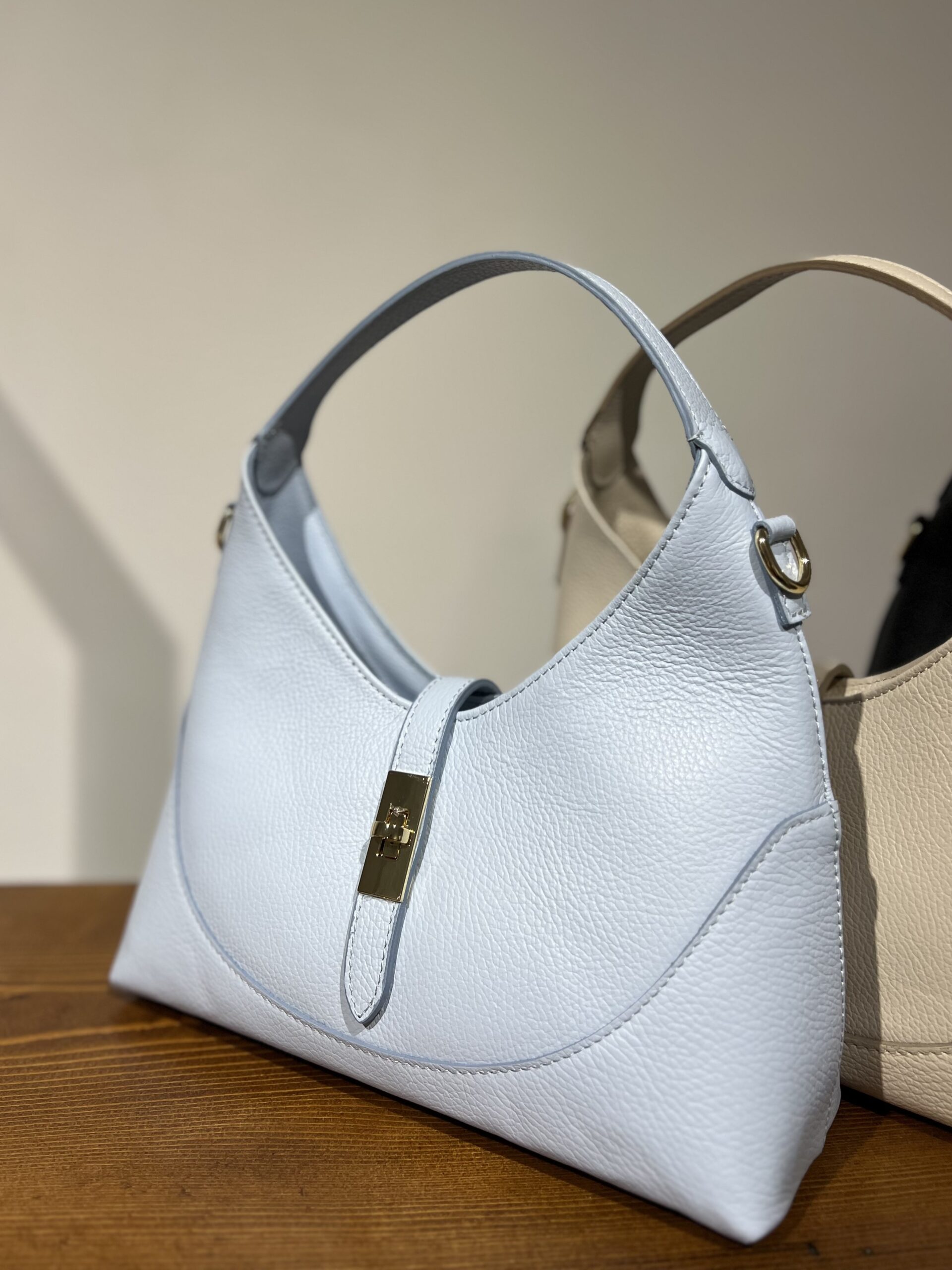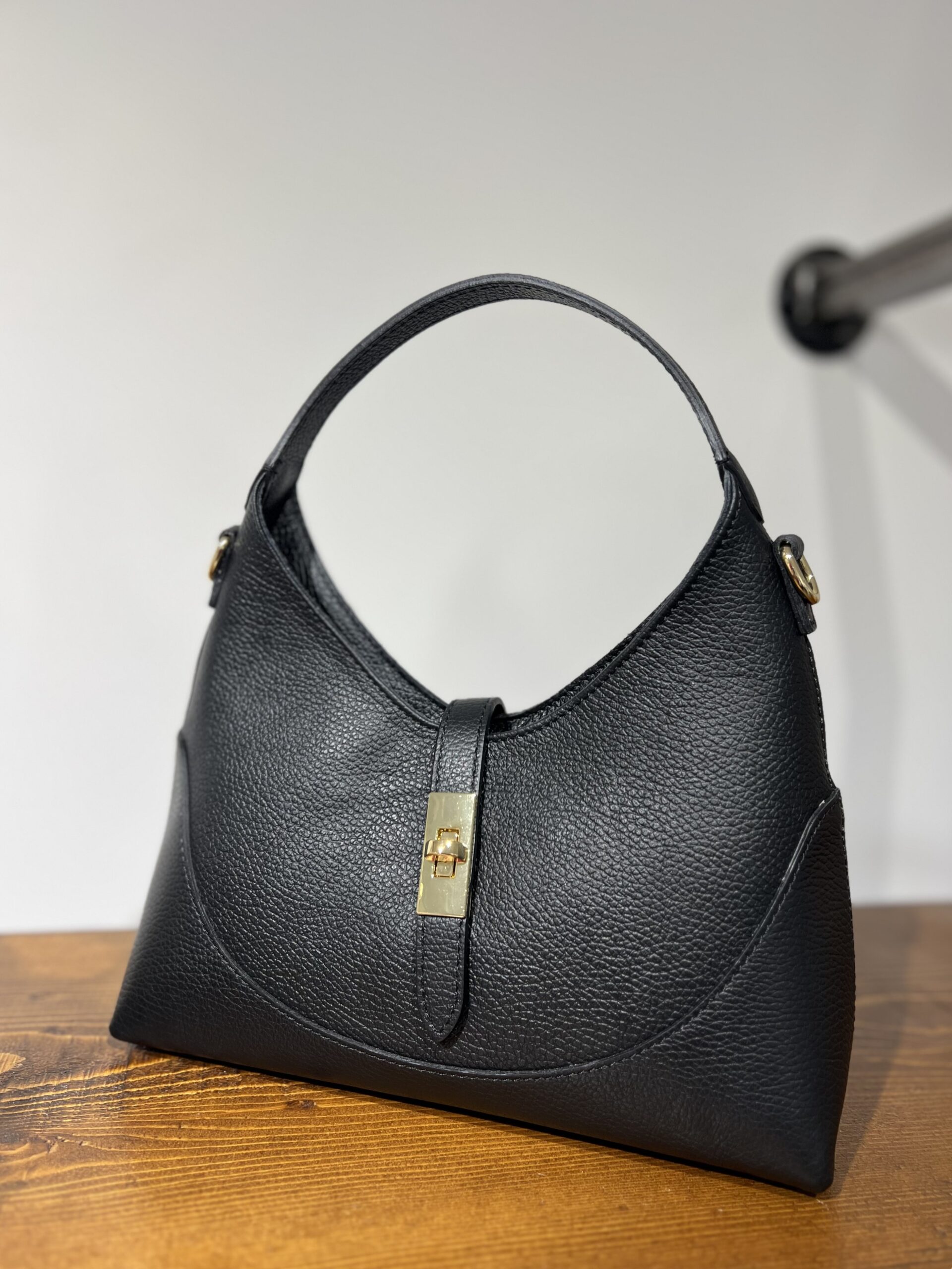 Borsa in vera pelle con maniglia e tracolla interna. Chiusura con zip e morsetto, internamente foderata con tasca di sicurezza chiusa con zip. Misure 28 cm, 16 cm, base 10 cm.