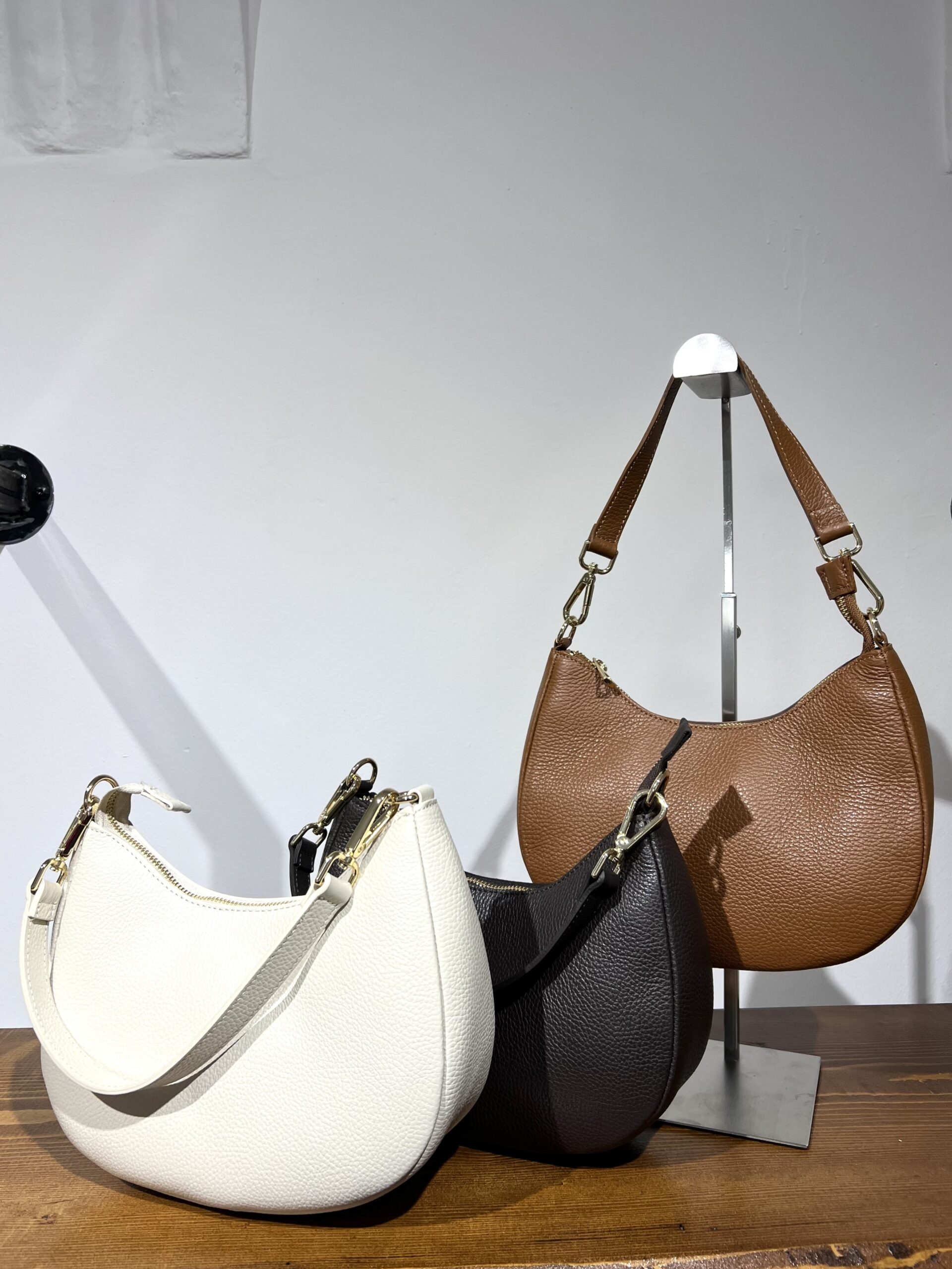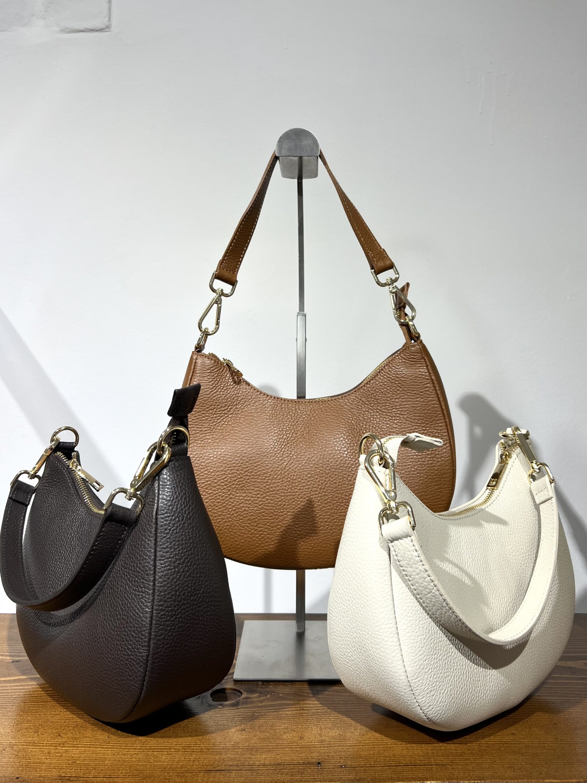 Borsa in vera pelle con maniglia per portarla a spalla e tracolla interna. Modello comodo e capiente cn chiusura con zip. Misure: 25 cm, 16 cm, base 8 cm.