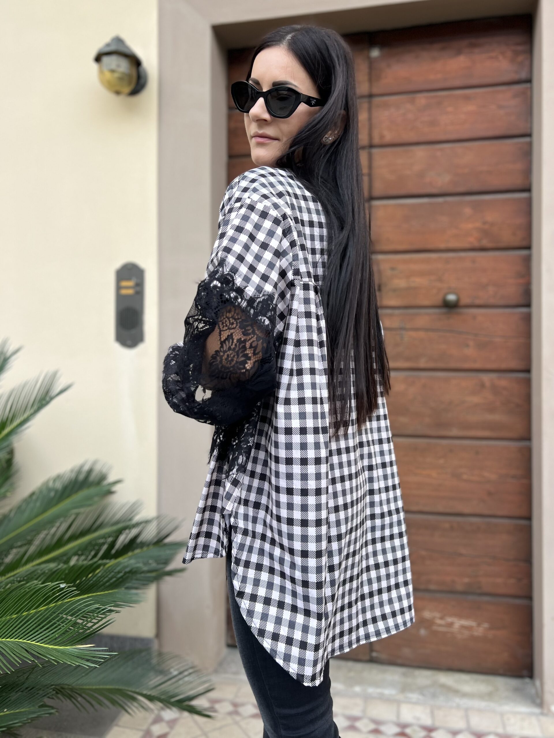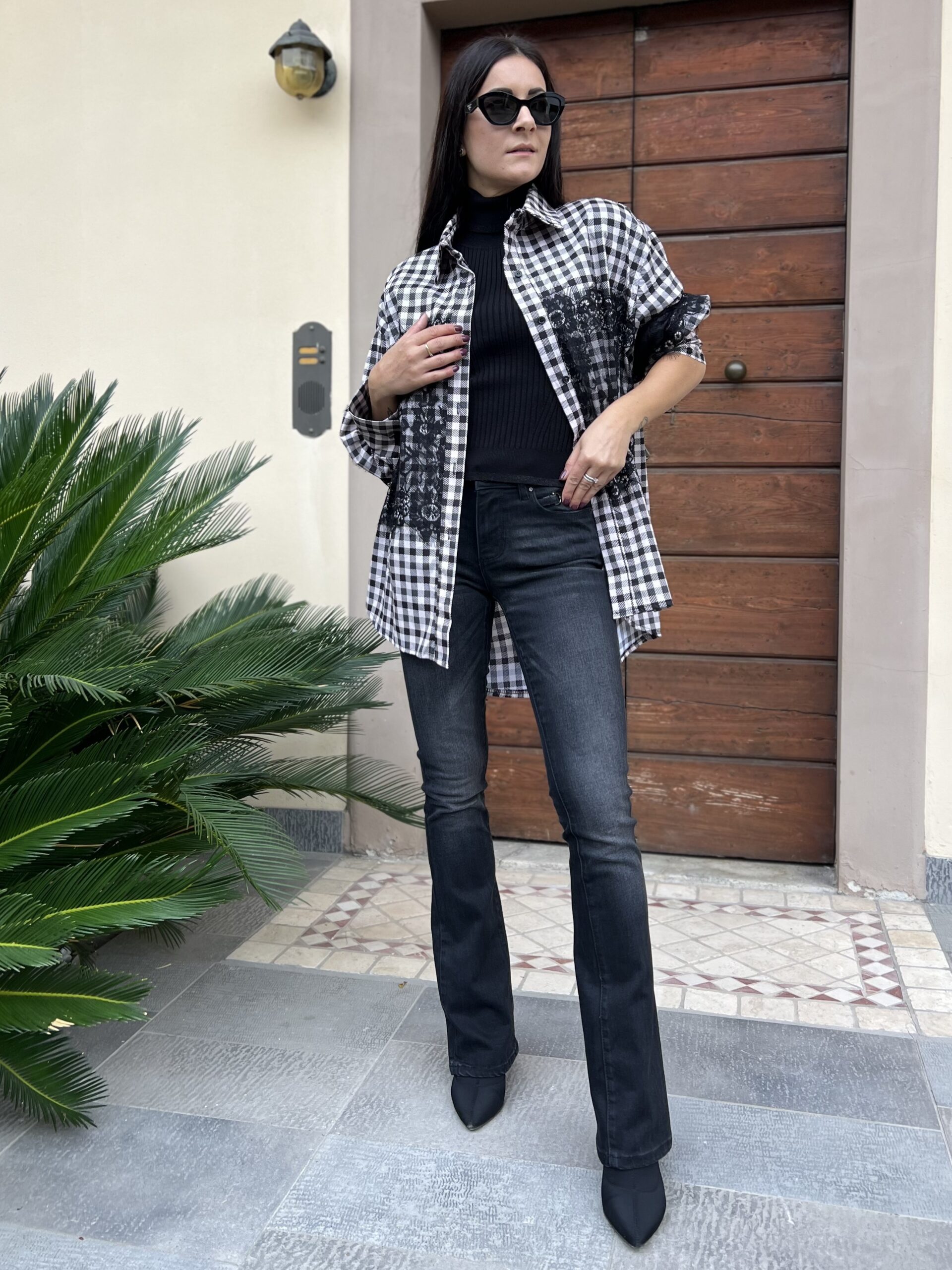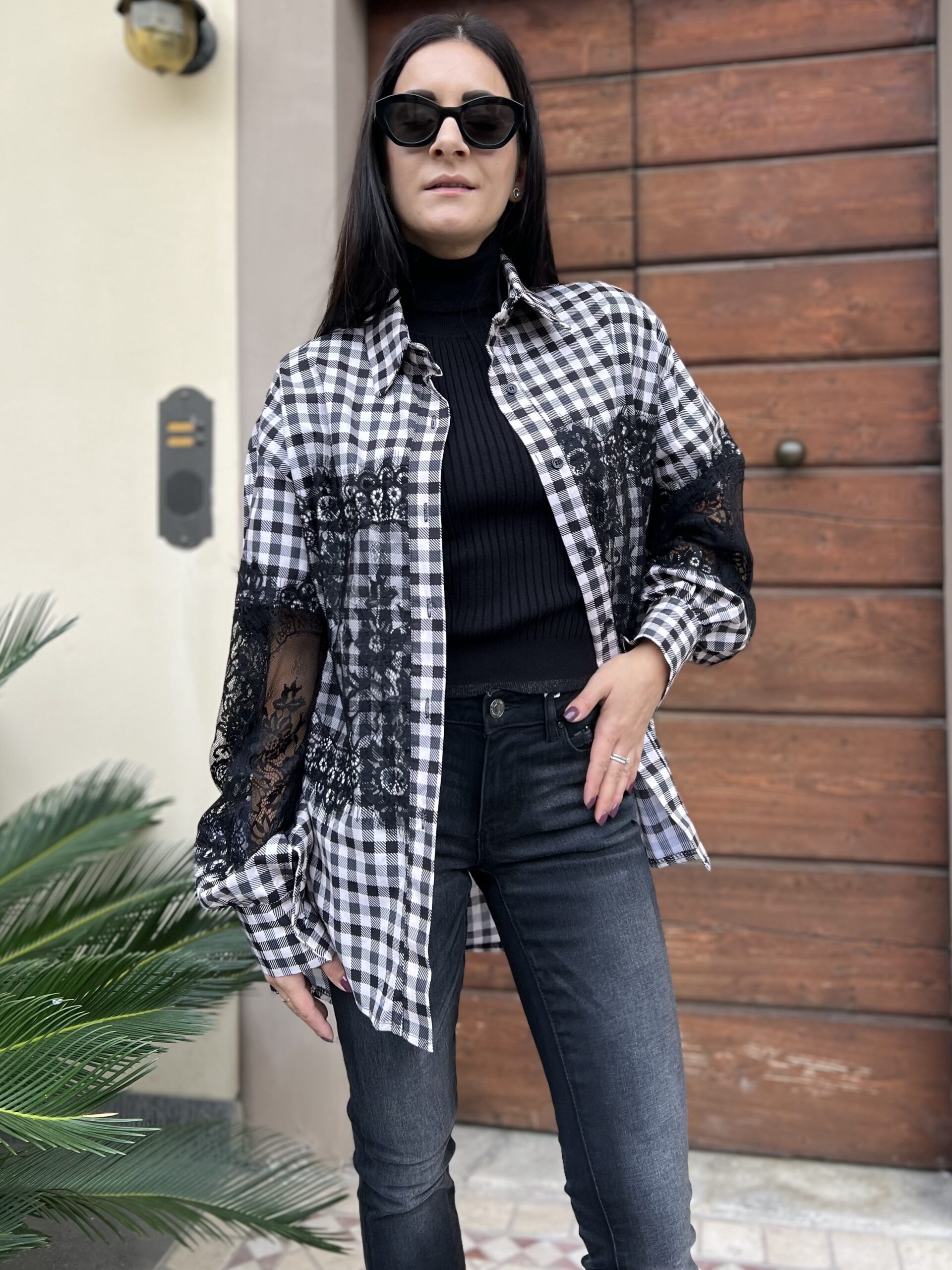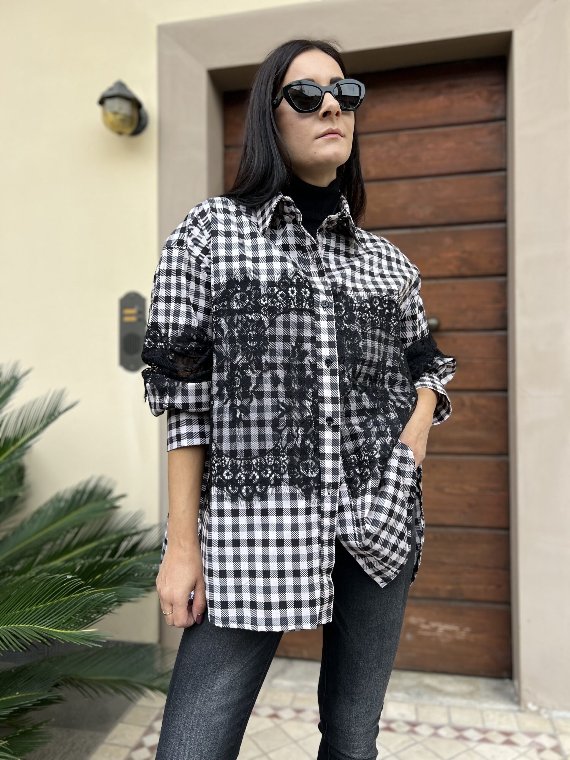 Camicia oversize in cotone con dettaglio applicazione pizzo. Modello con colletto classico, leggermentw più linga sul retro e manica ampia. Taglia unica veste fino alla 50.