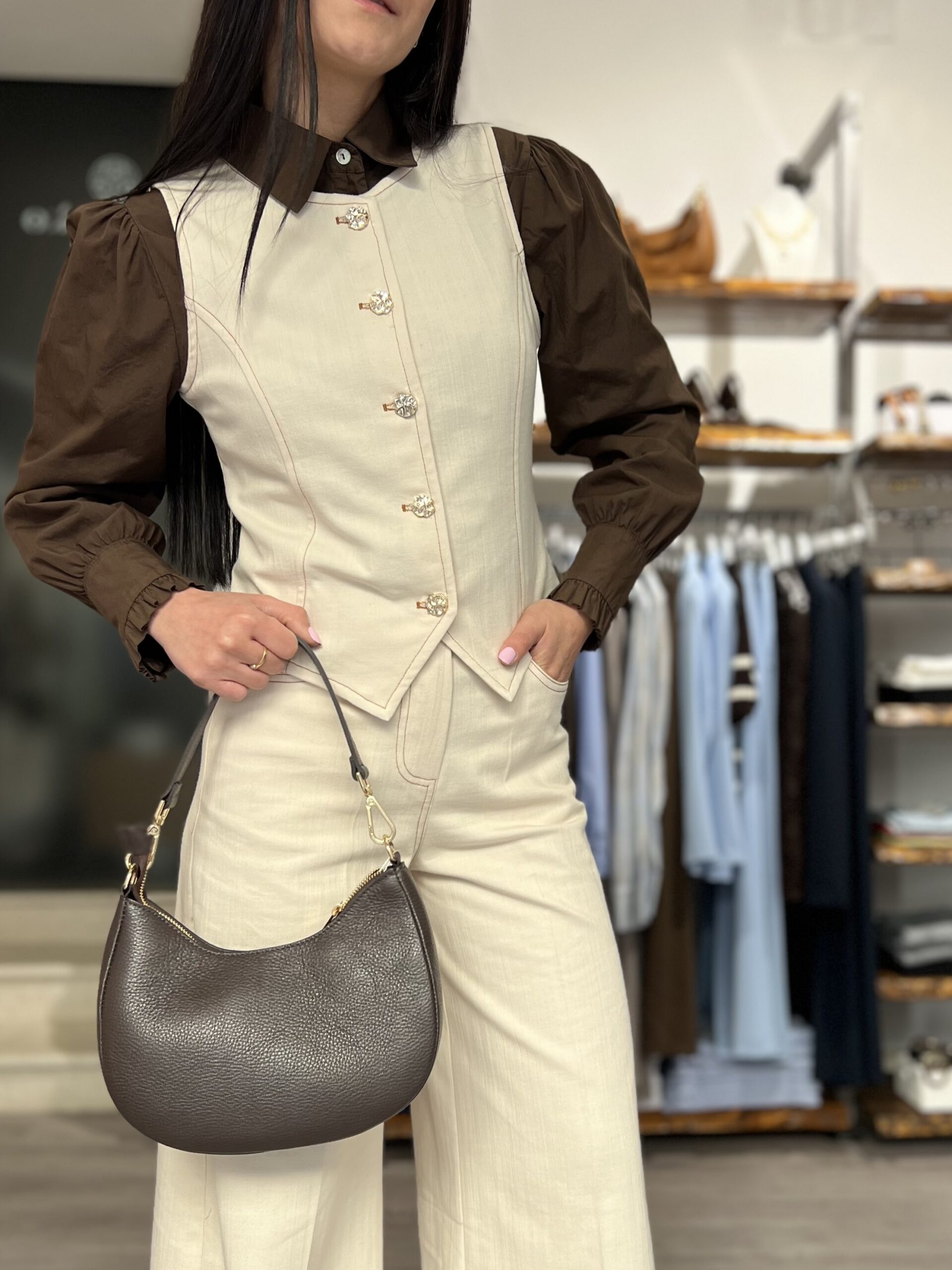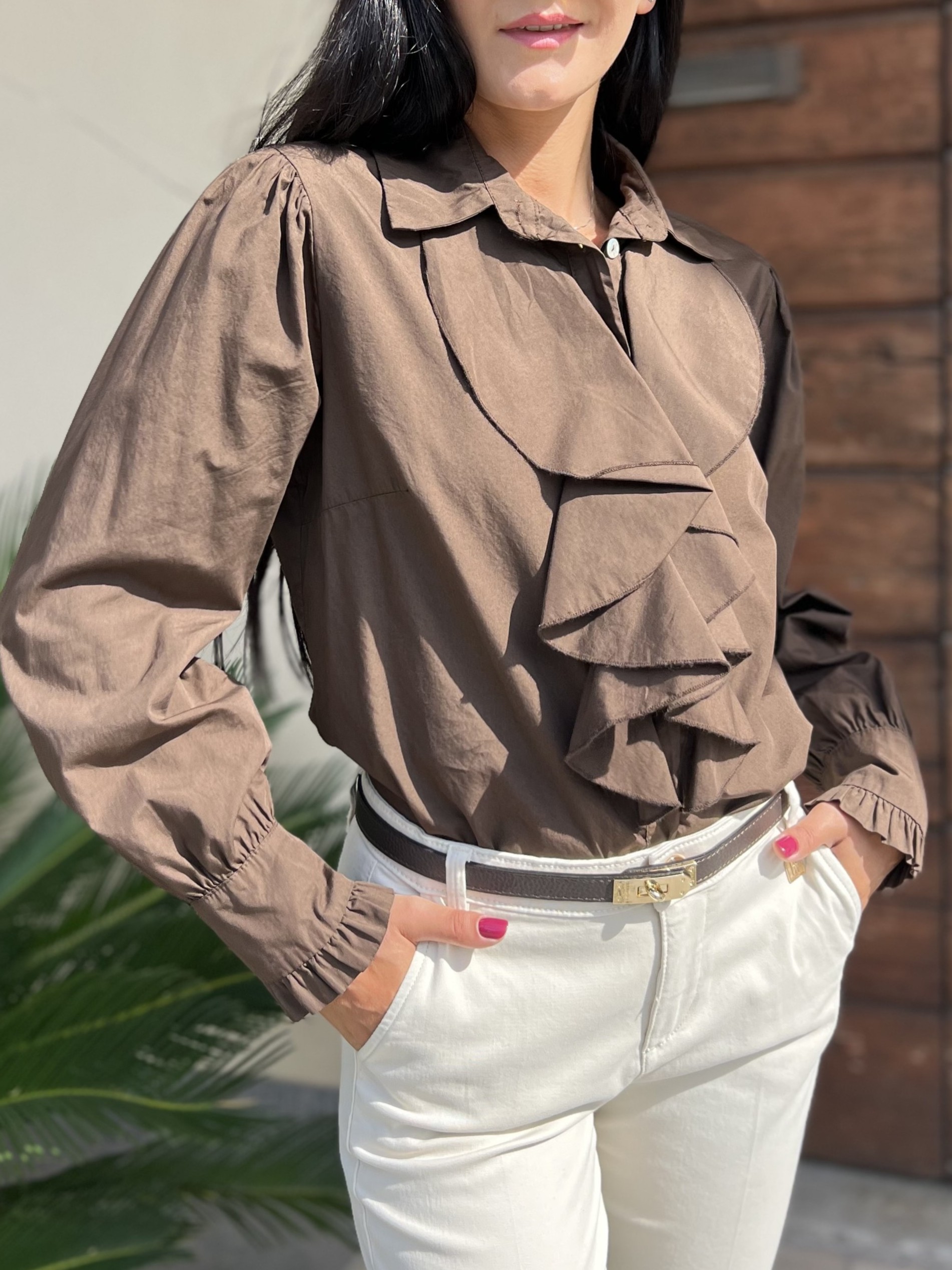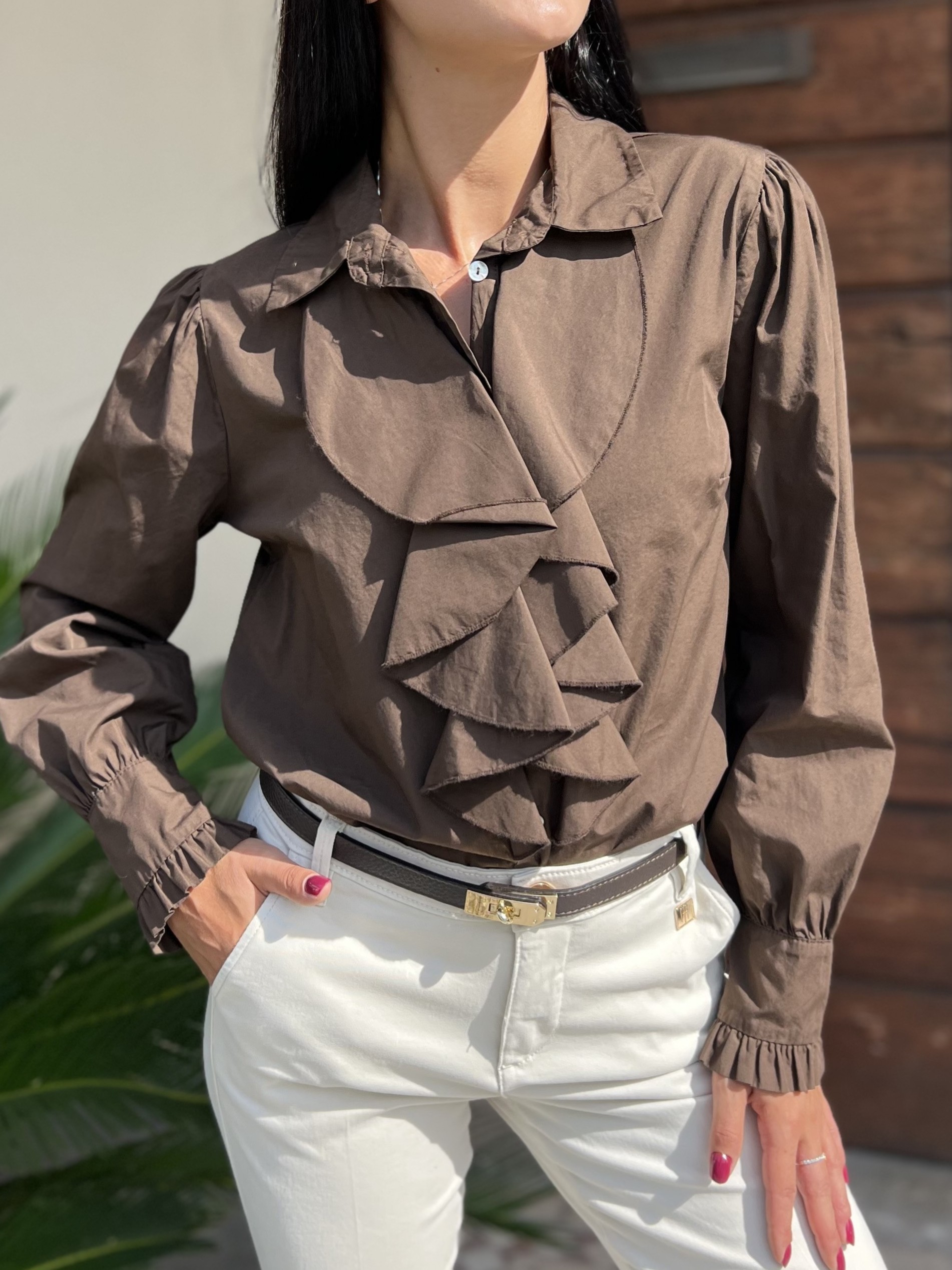 Camicia in cotone con colletto classico e rouches su tutta l’abbottonatura. Modello dal taglio dritto e morbido, manica leggermente a sbuffo e polsino con plissé. Taglia S per 38/42 e M per 44/46.