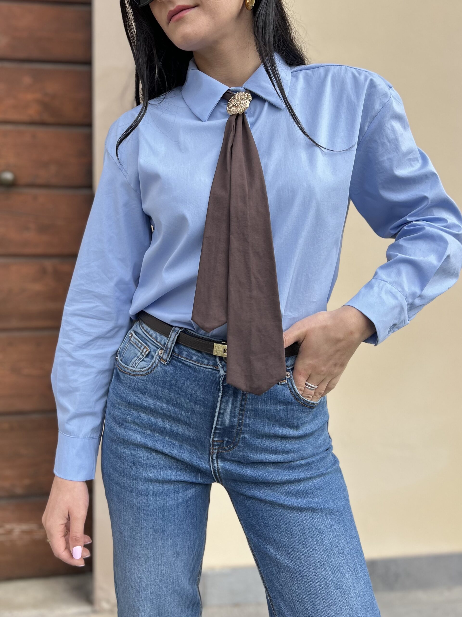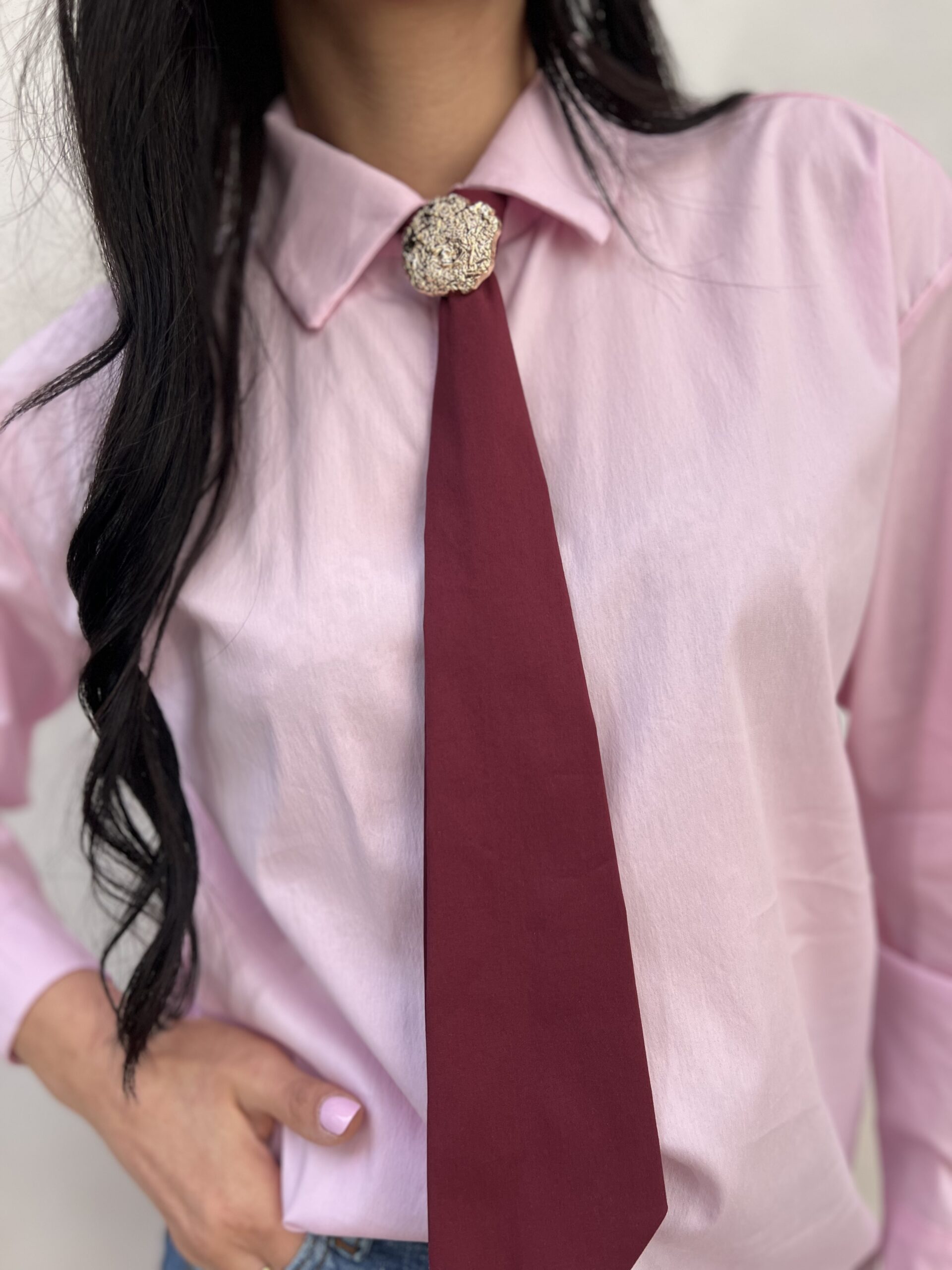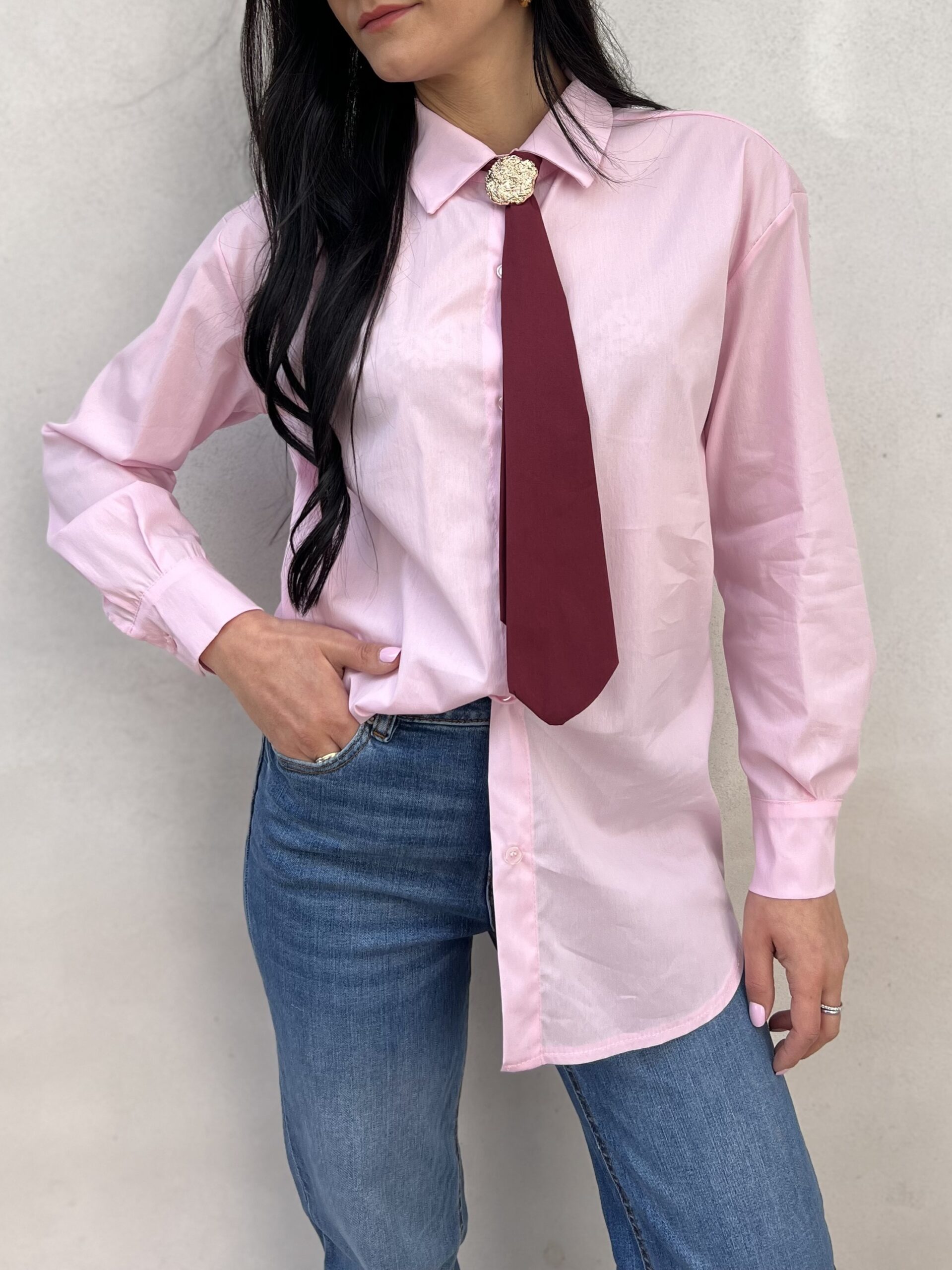 Camicia lunga in cotone elasticizzato con dettaglio cravatta a contrasto e spilla removibili. Modello in taglia unica, veste fino alla L. Composizione: 70% cotone, 28% nylon 2% elastan.