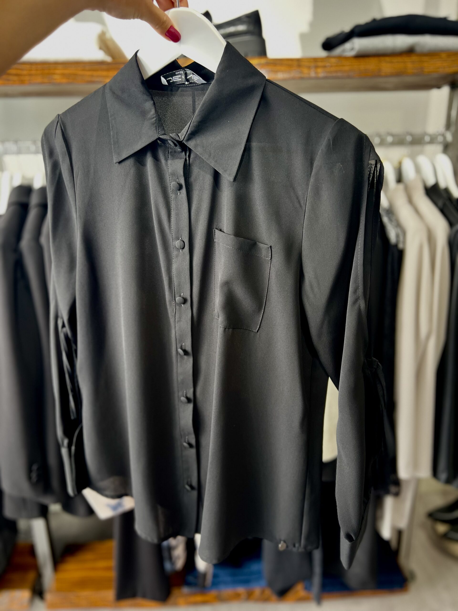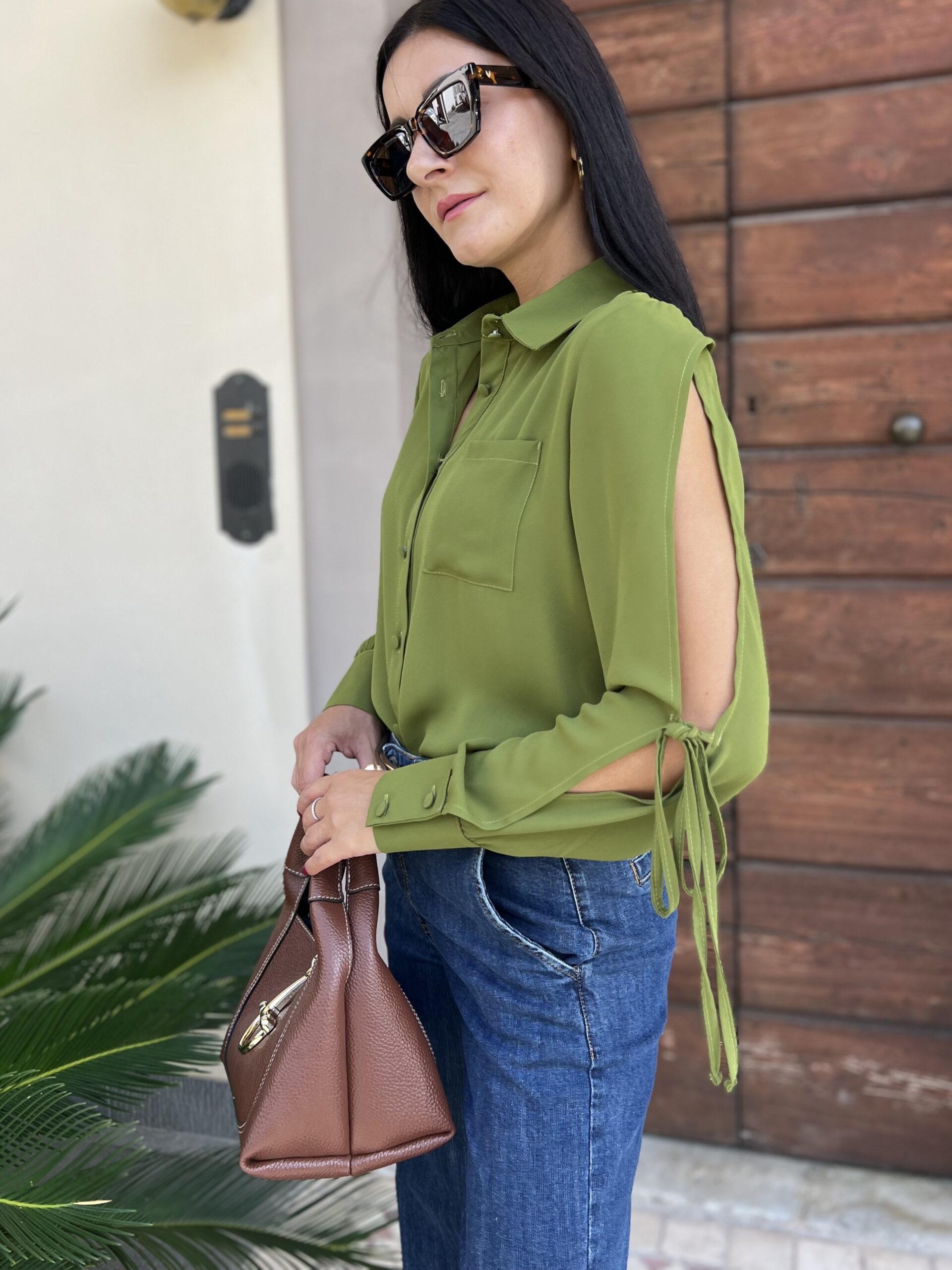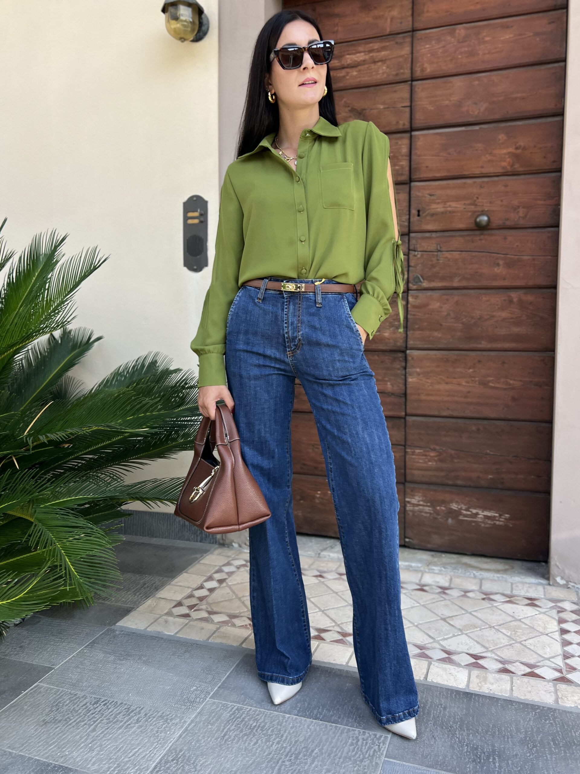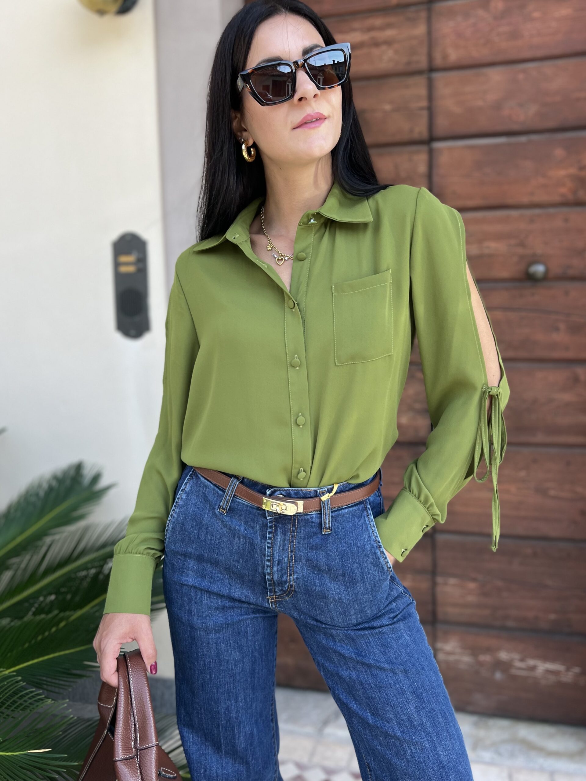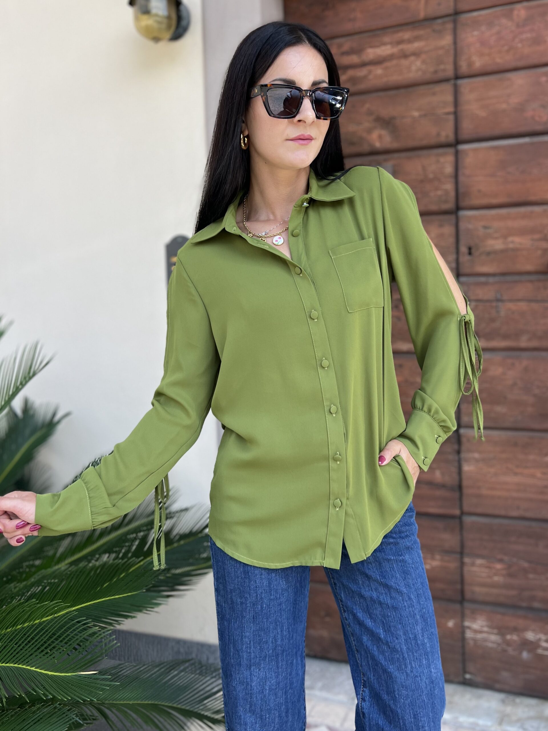Camicia con colletto classico lunga fino al fianco. Modello dal taglio leggermente sfiancato, manica cut-out con dettaglio fiocchetti.