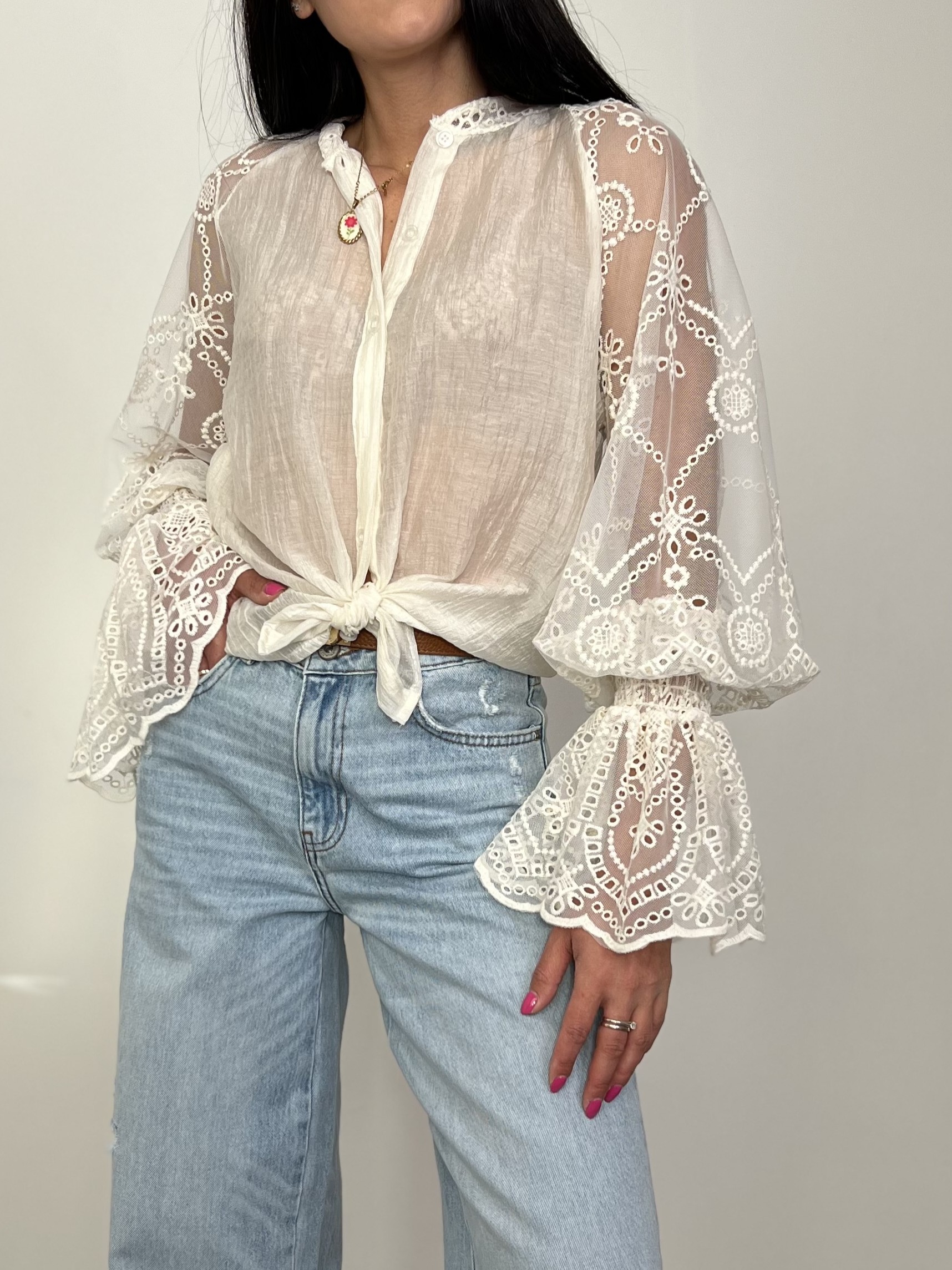 Camicia con colletto alla coreana e manica ampia con polsino a calla in pizzo. Taglia unica, veste fino alla L, composizione : 90% lyocell 10% pl.