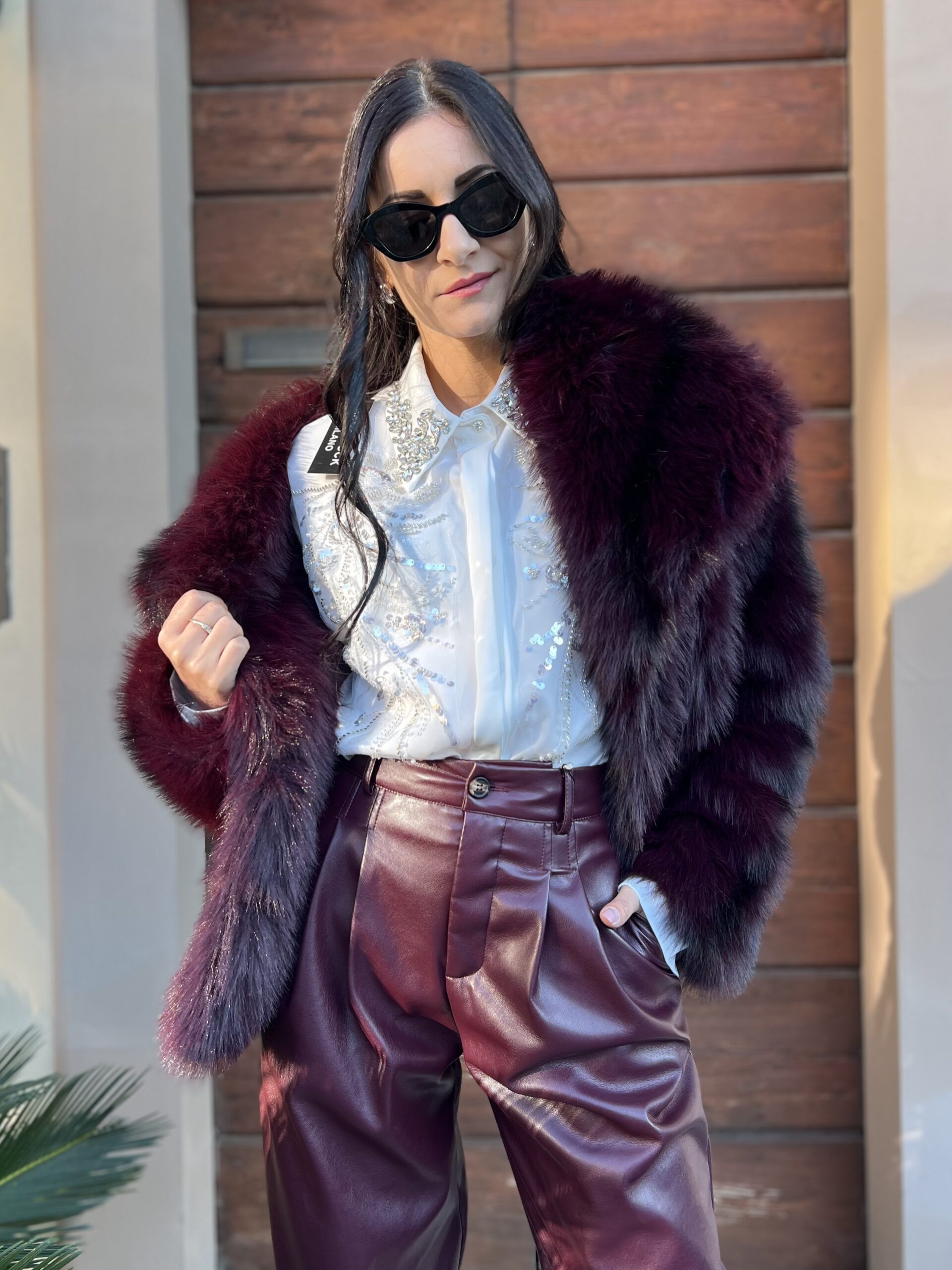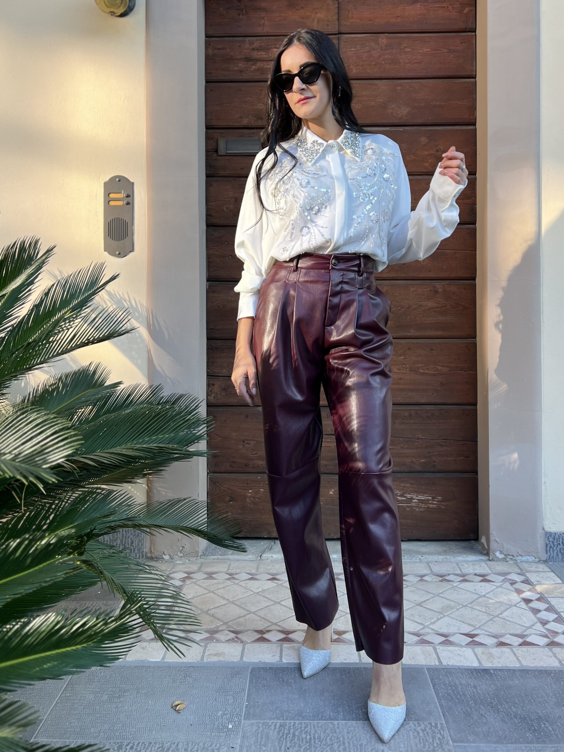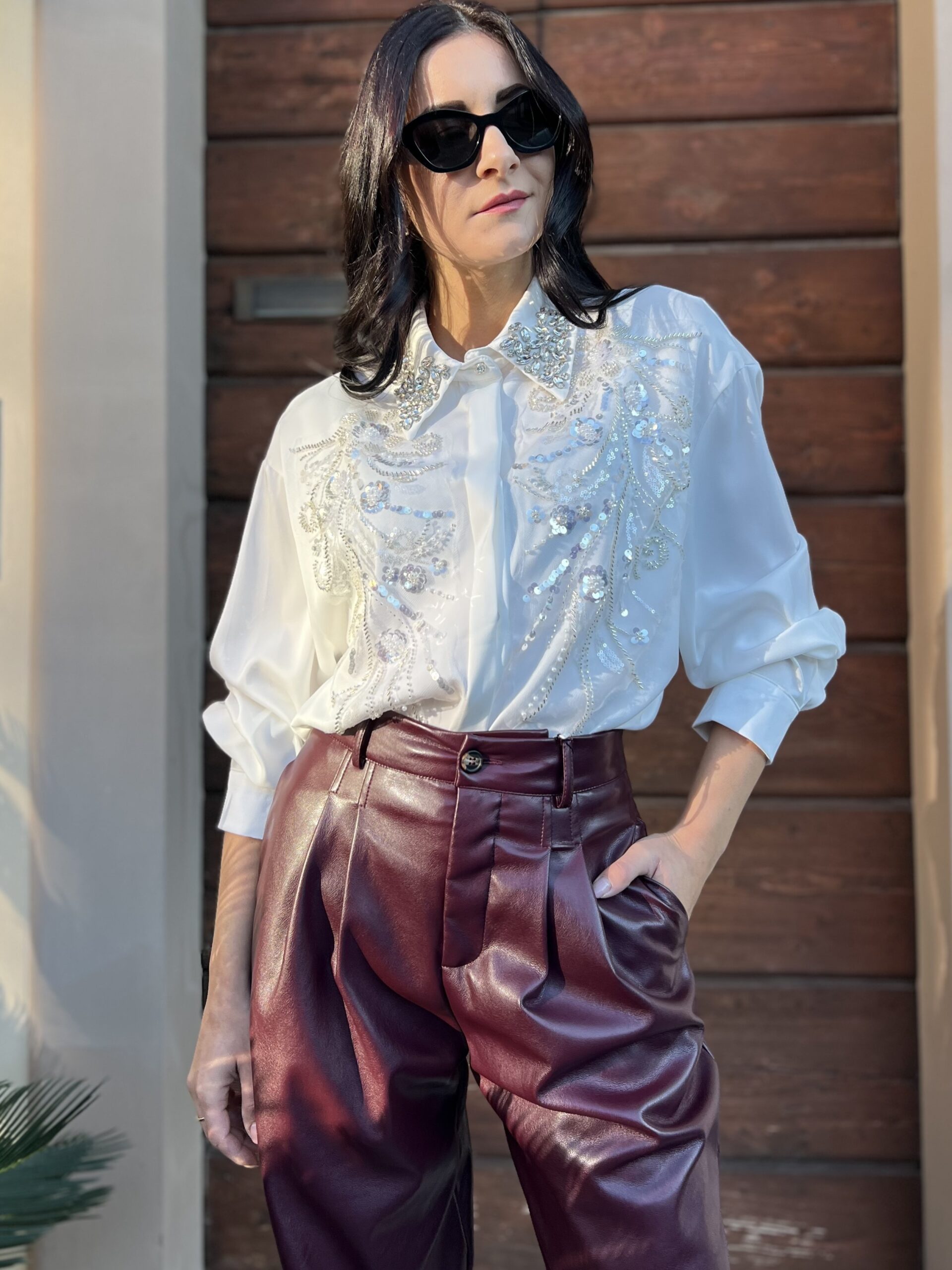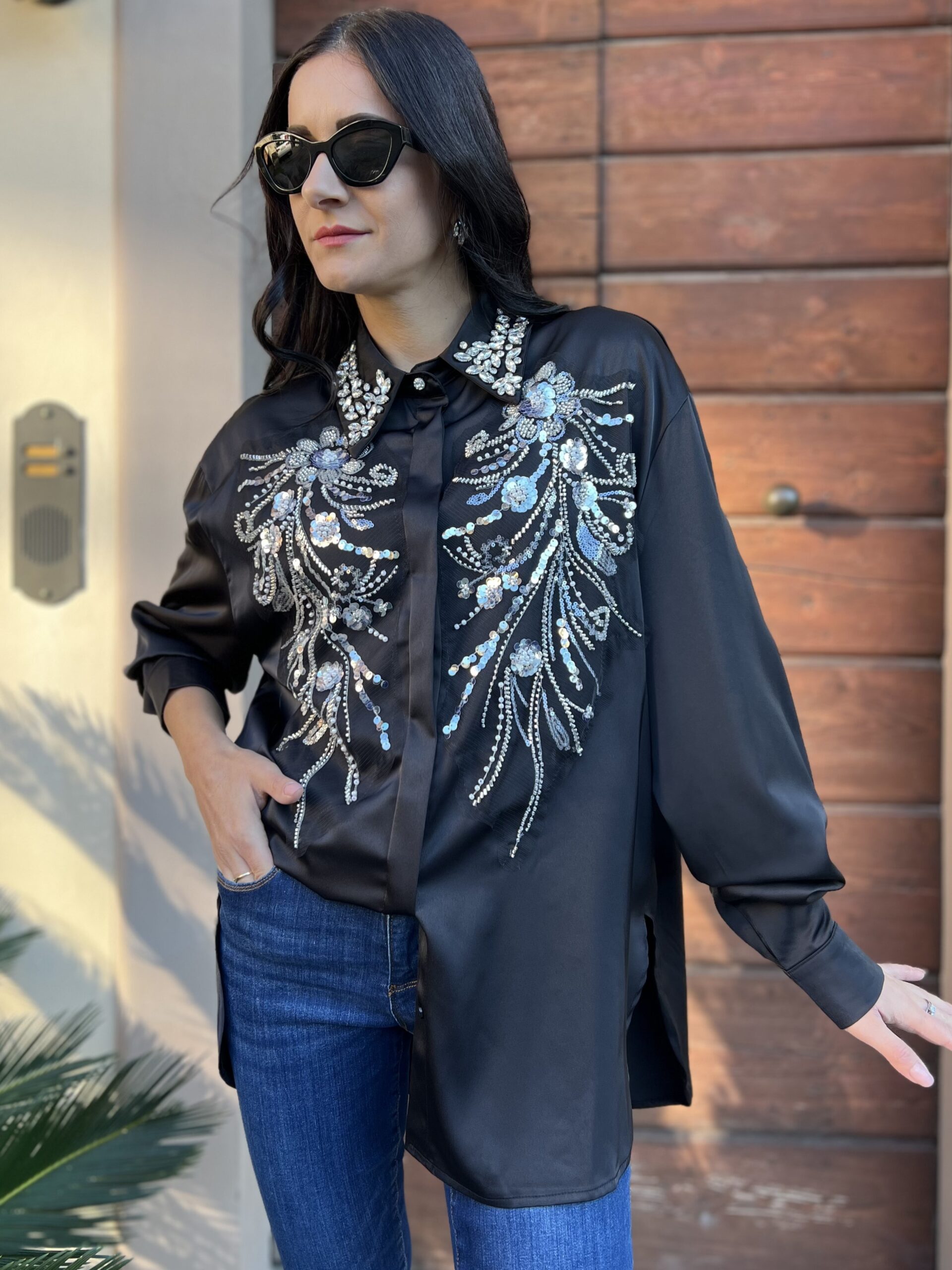 Camicia in raso di viscosa, modello oversize con spacco laterale. Colletto classico e dettaglio applicazioni strass e paillettes. Taglia unica veste fino alla XL.