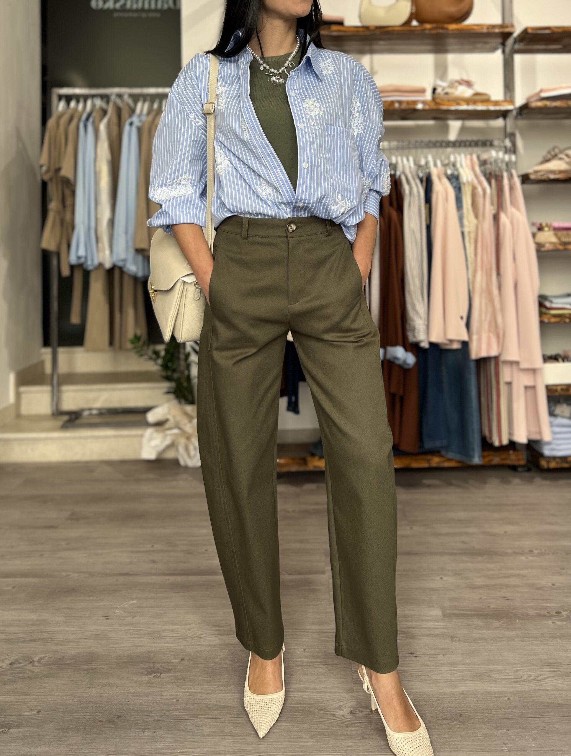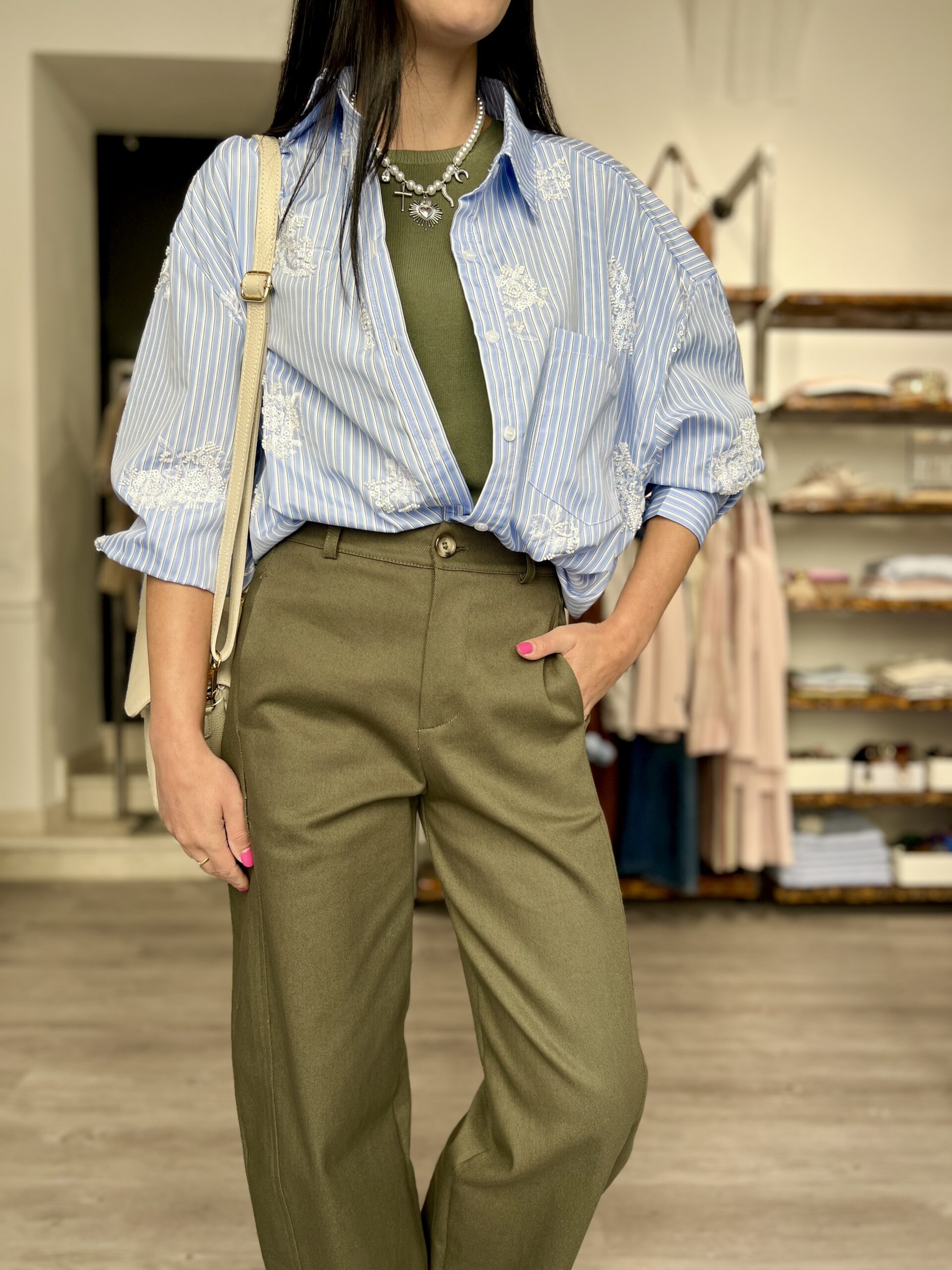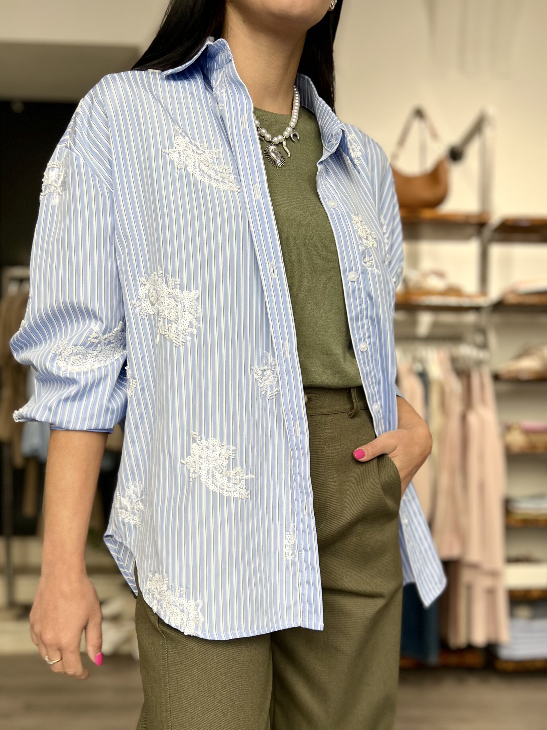 Camicia over rigata con dettaglio ricamo e perline. Composizione: 20% cotone 80% pl.  Taglia unica veste fino alla XL.