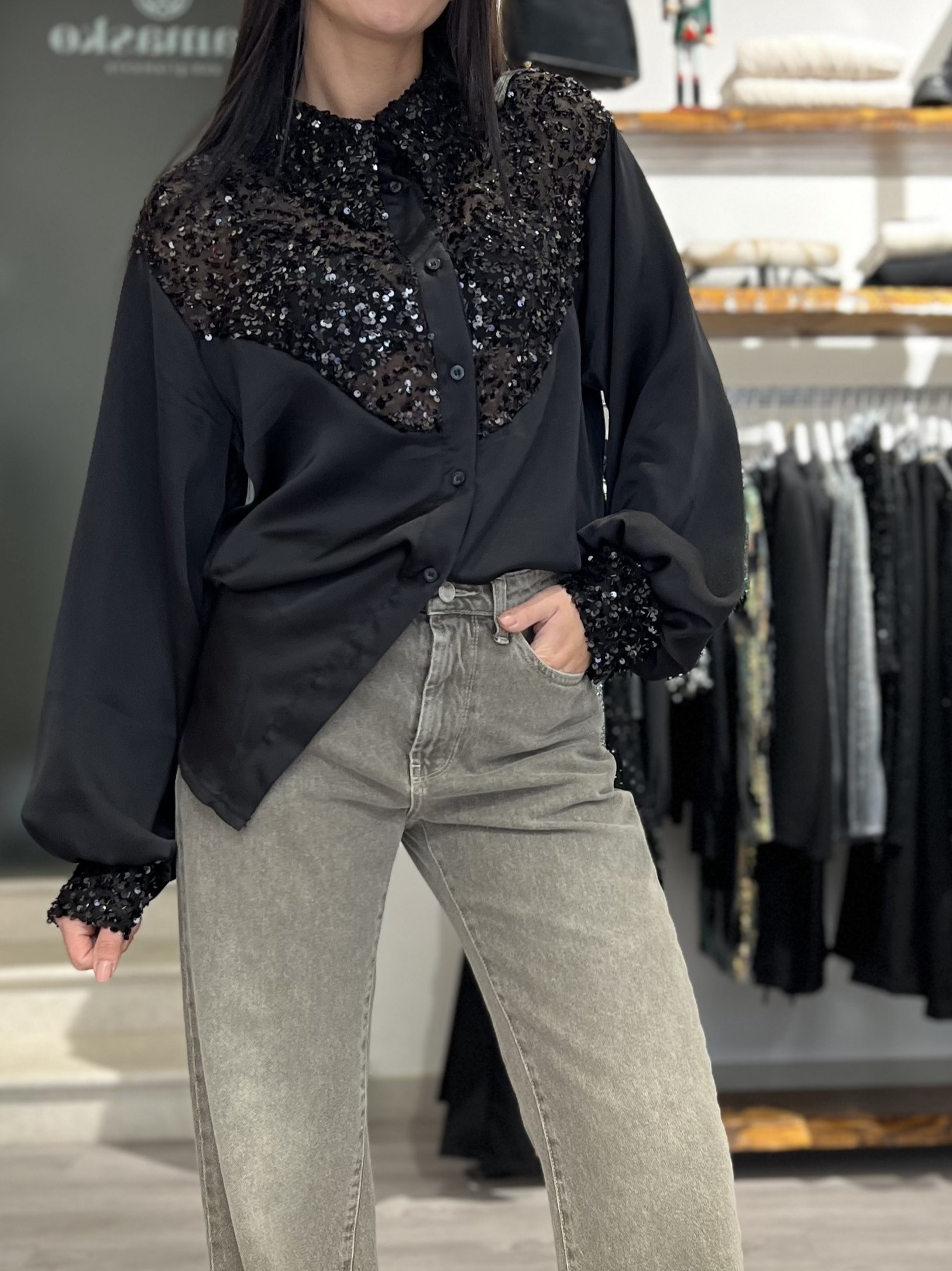 Camicia over in raso con paillettes. Modello dal taglio ampio, lungo fino al fianco e manica a sbuffo. Taglia unica veste fino alla 46/48.