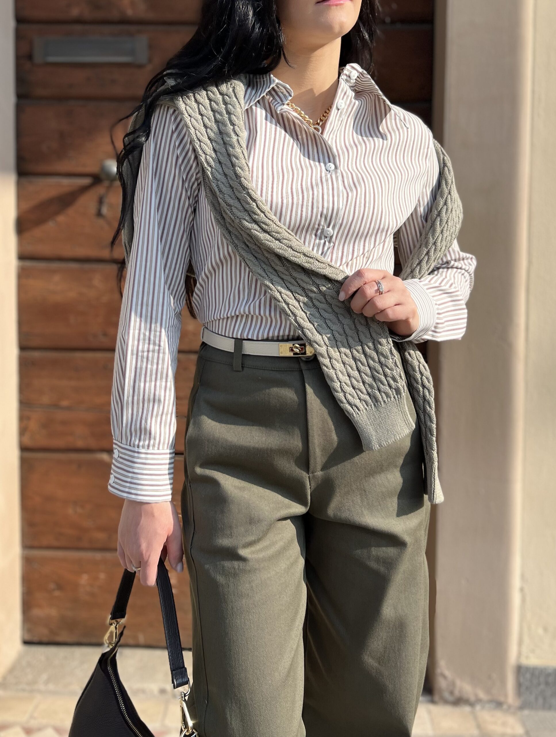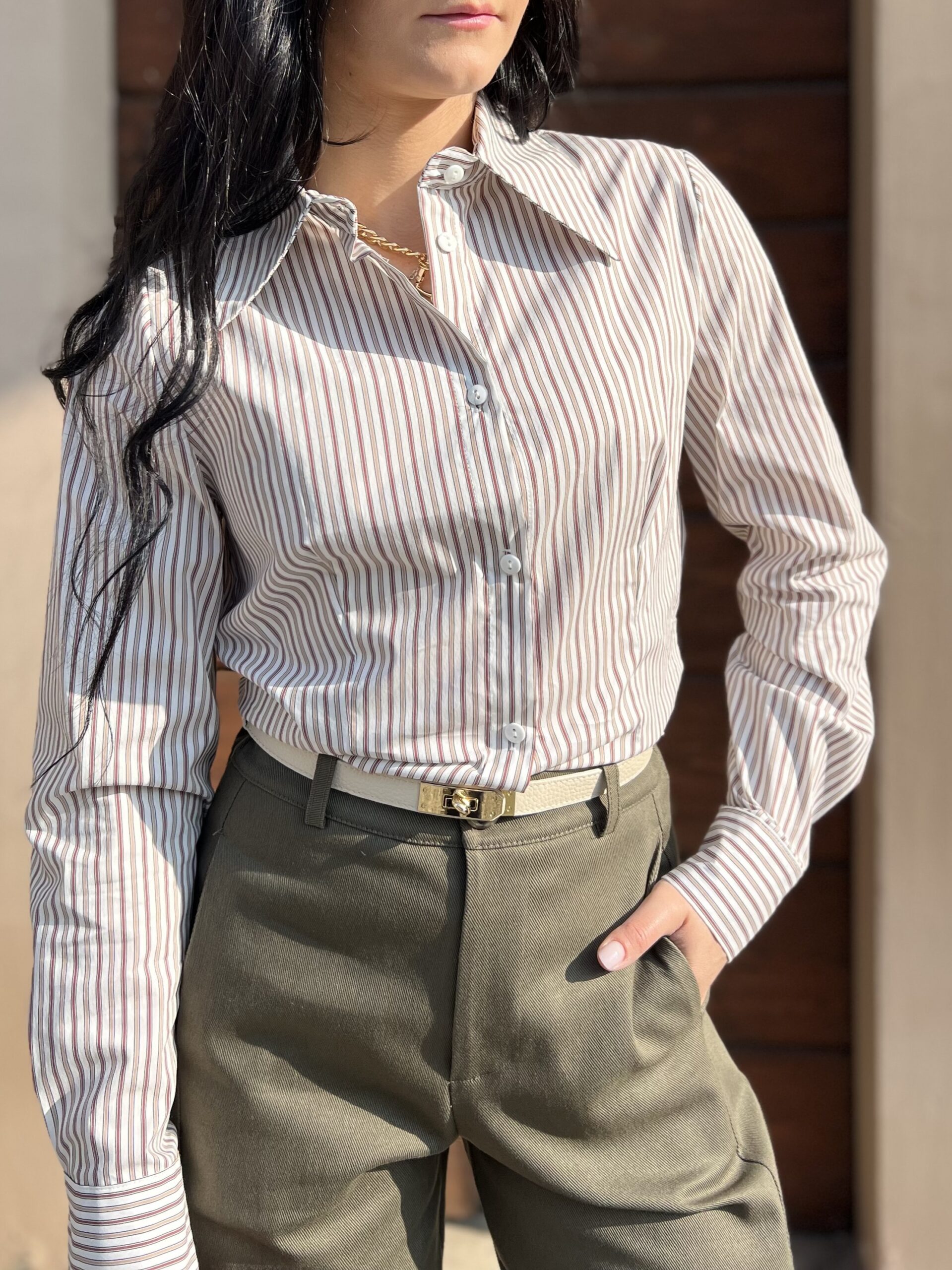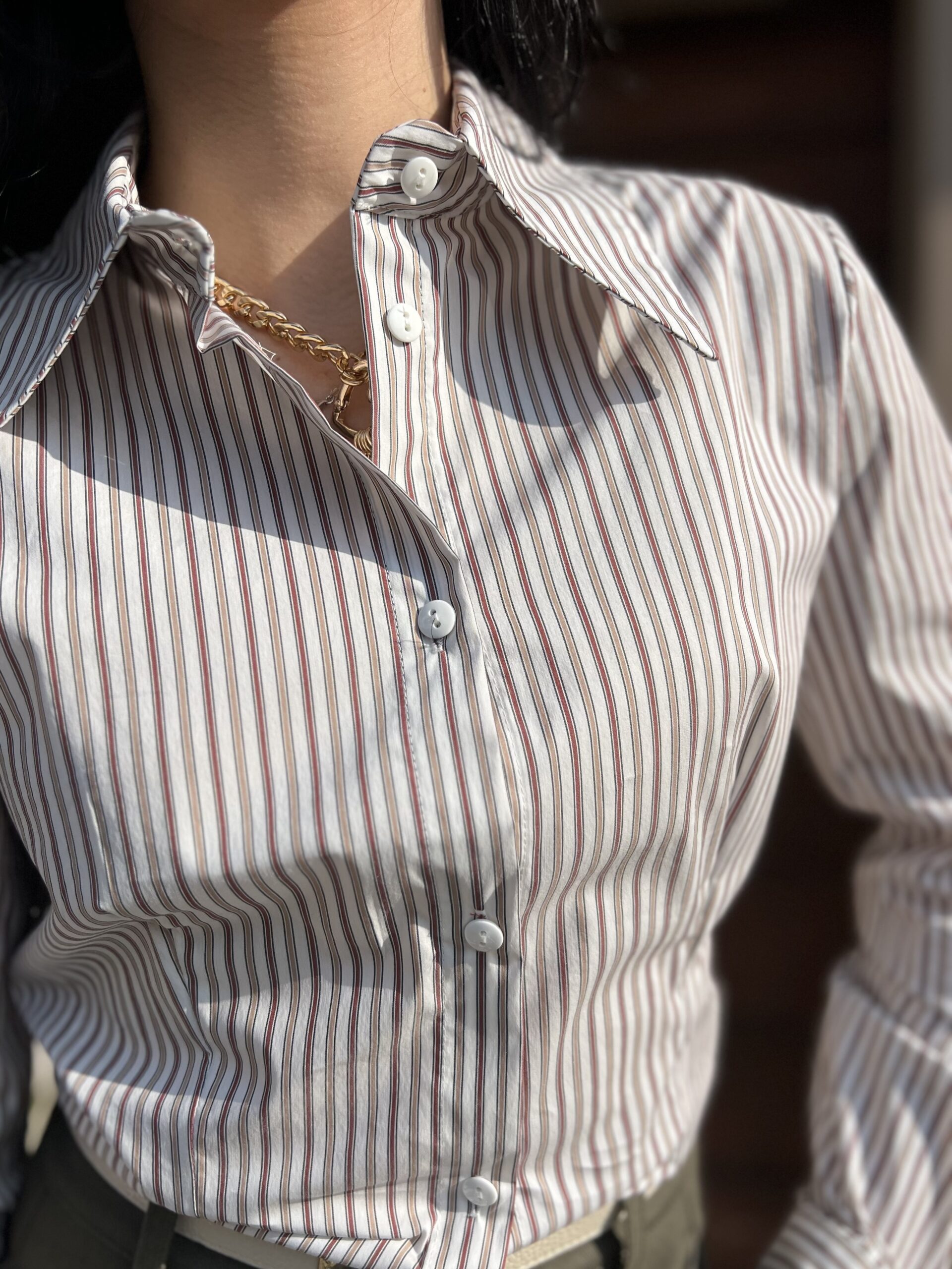 Camicia in cotone, modello classico fiancato con riga sui toni del bordeaux e sabbia su base bianca.
