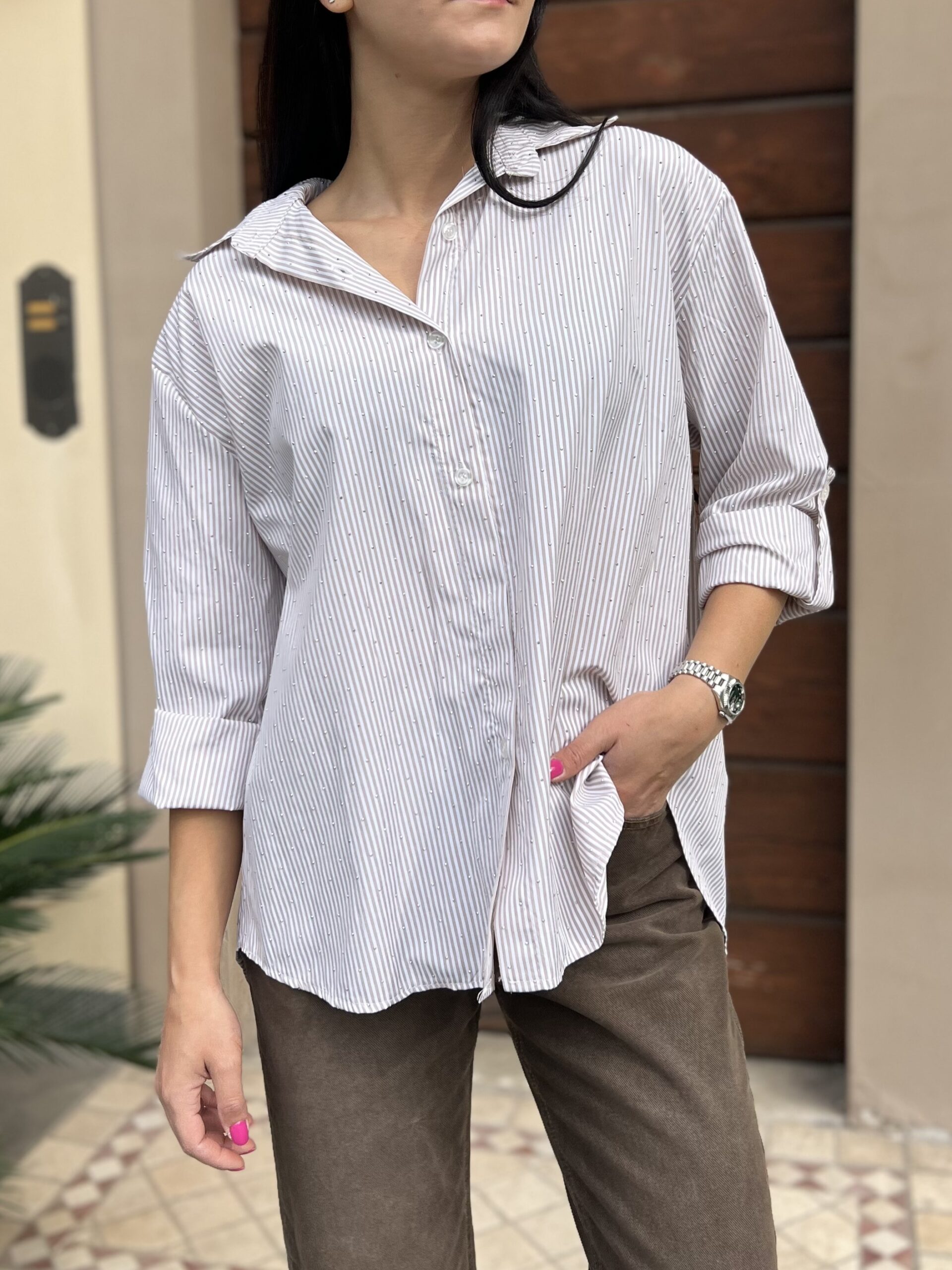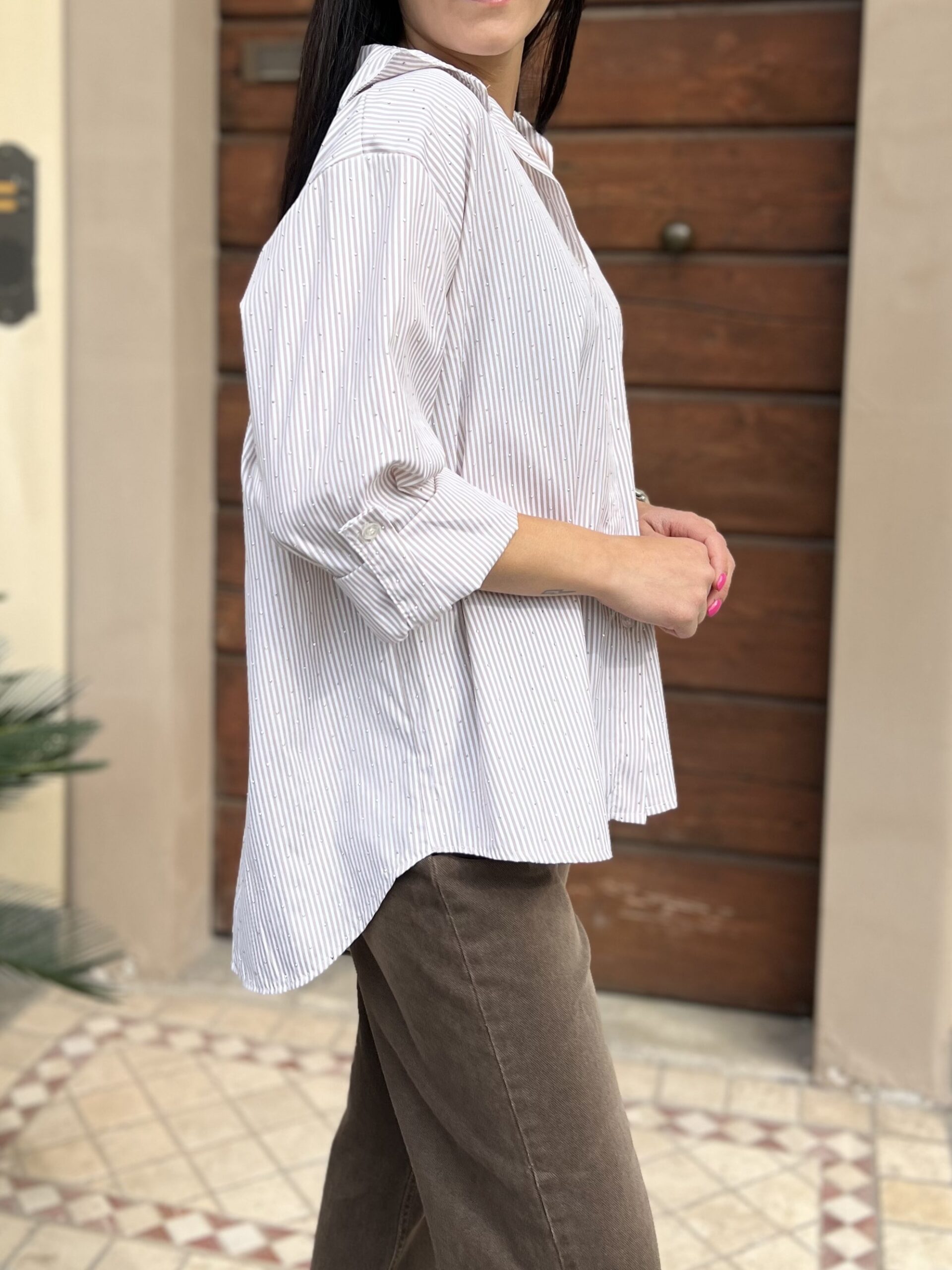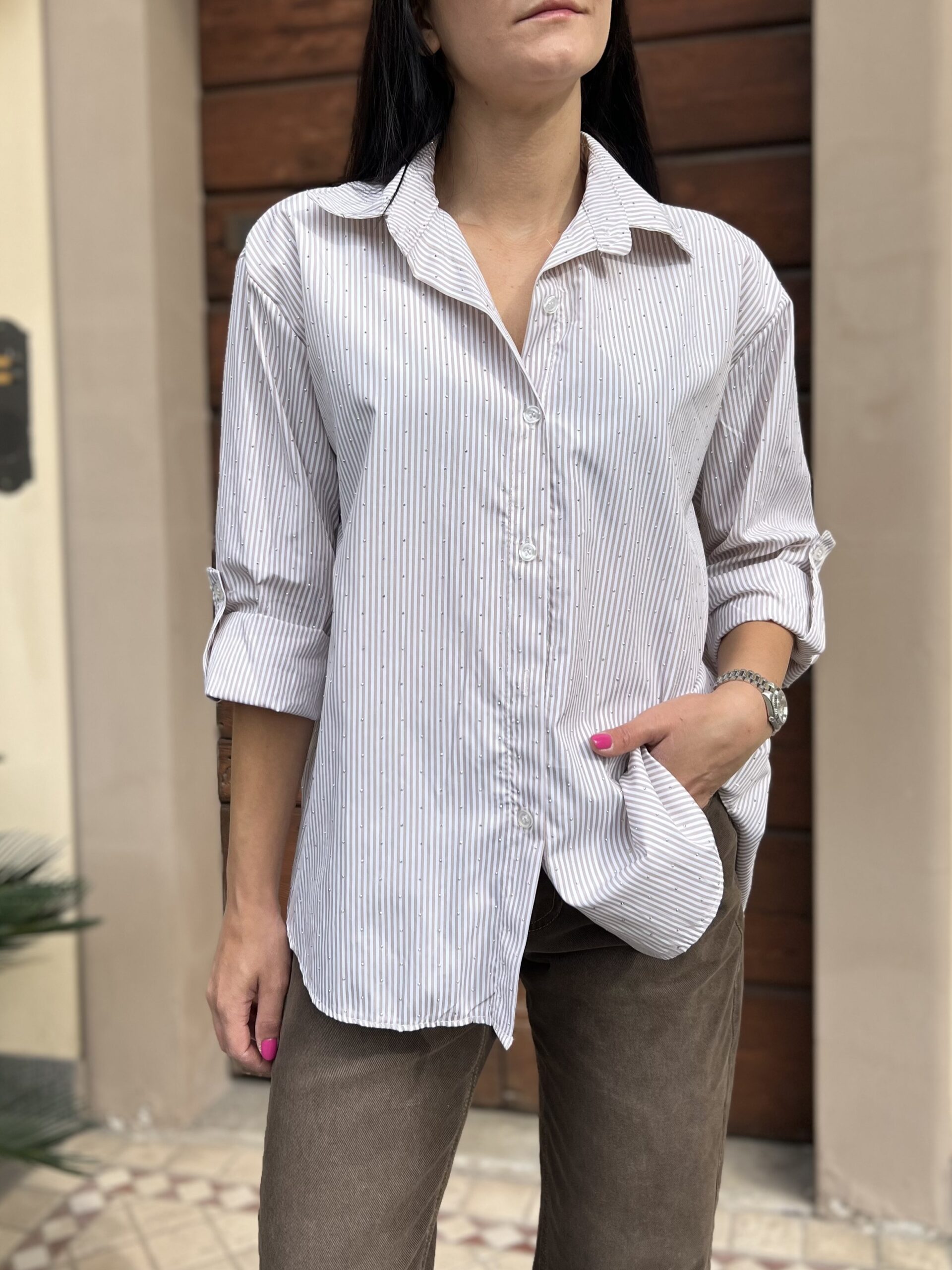 Camicia over con colletto classico e strass applicati. Modello leggermente più lungo sul retro con manica lunga e bottoncino per fermarla a 3/4. Taglia unica veste fino alla 48, composizione 65% cotone 35% pl.