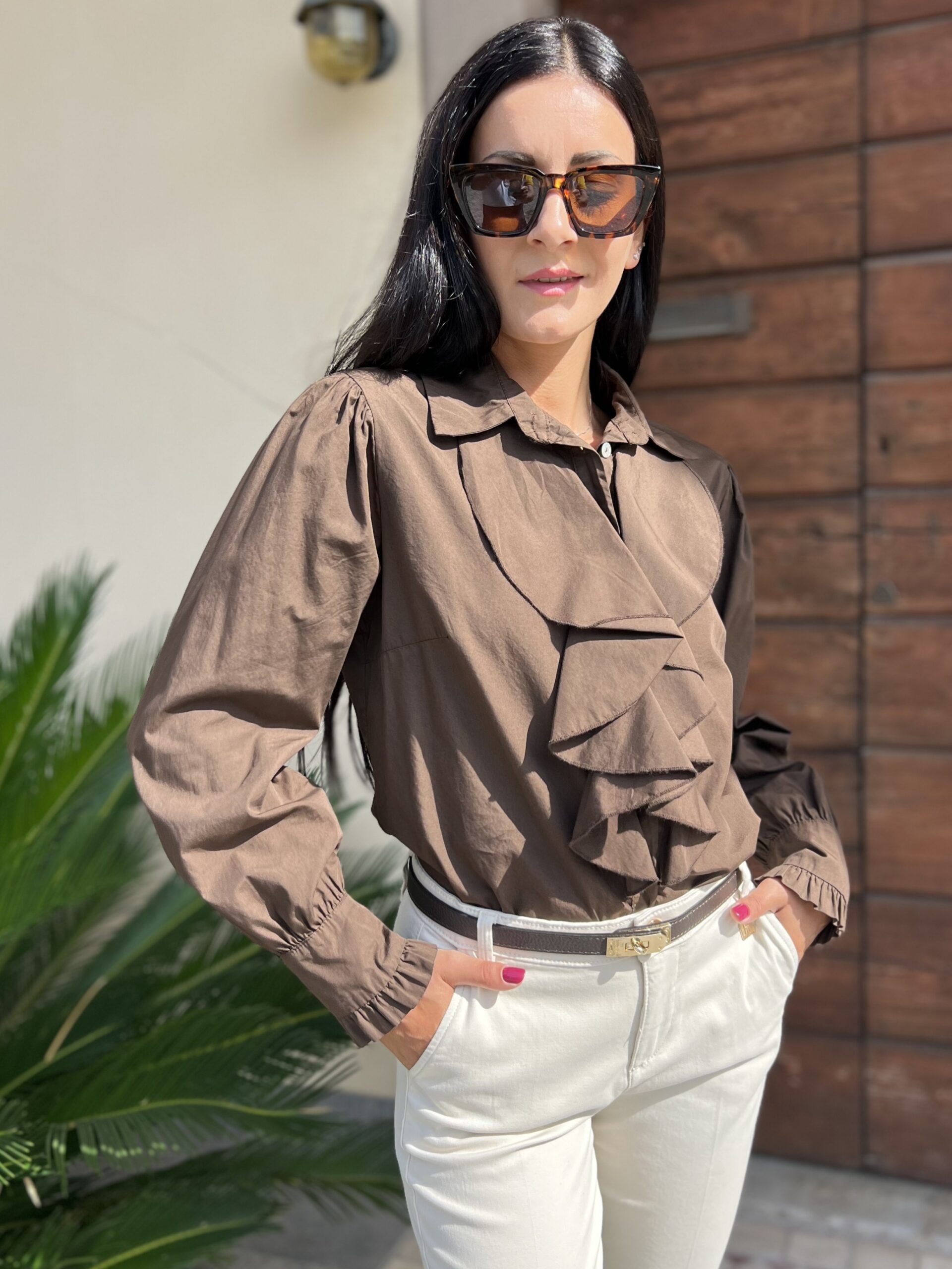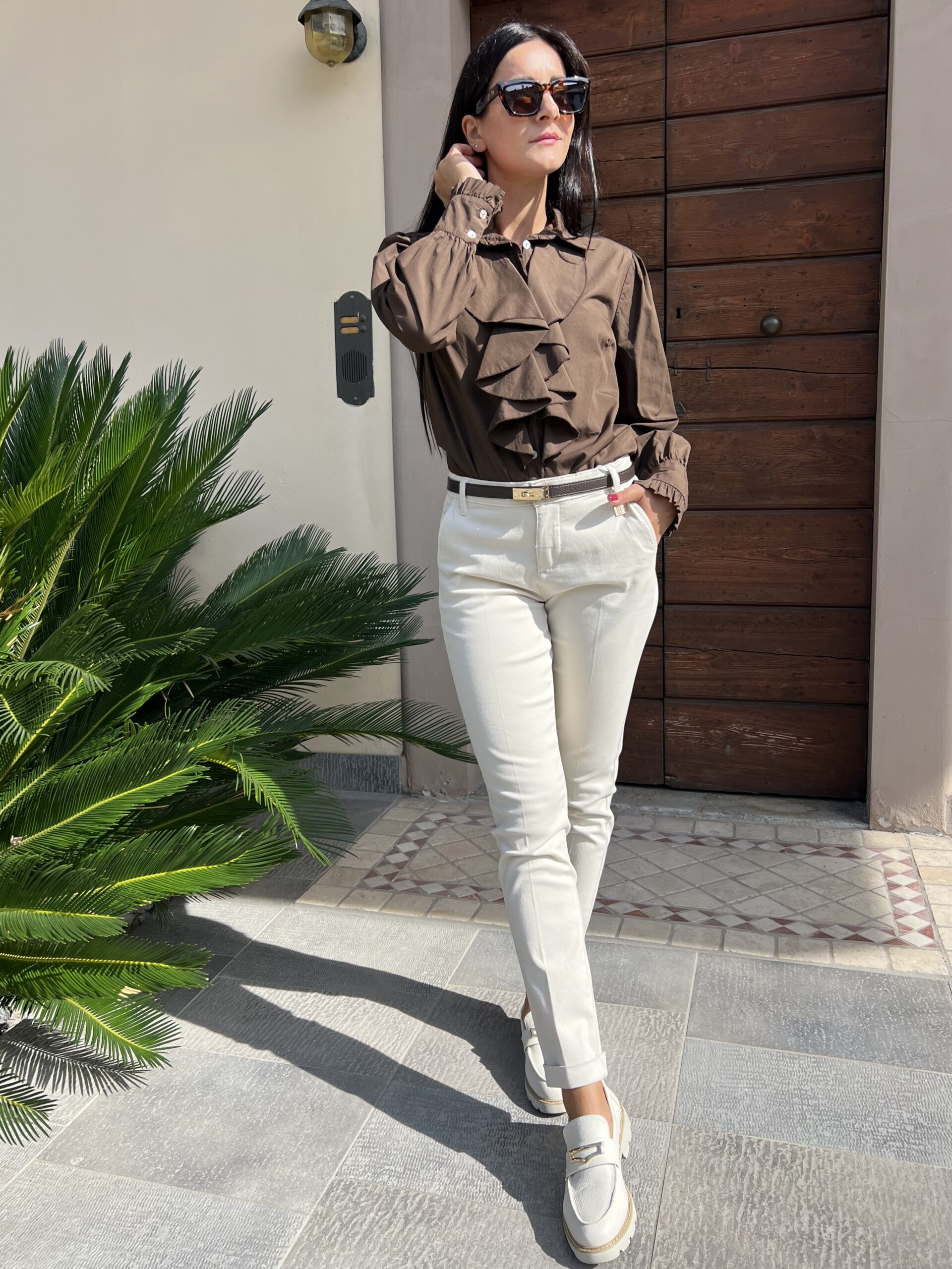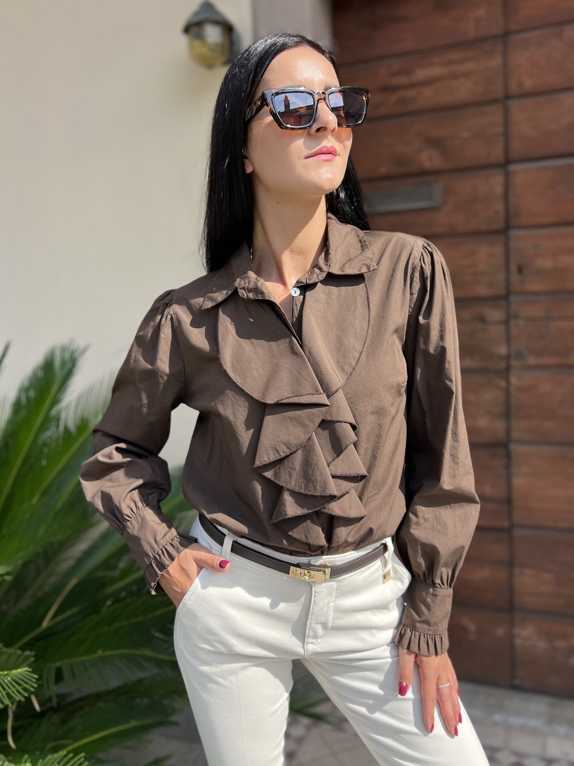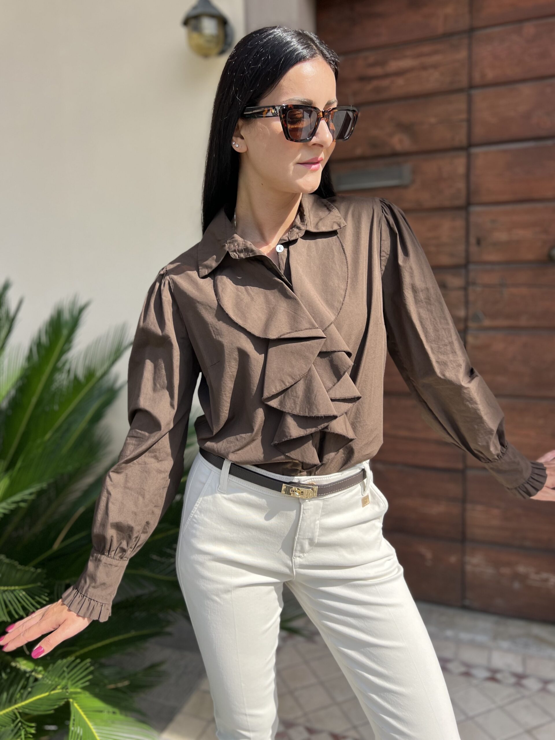 Camicia in cotone con colletto classico e rouches su tutta l’abbottonatura. Modello dal taglio dritto e morbido, manica leggermente a sbuffo e polsino con plissé. Taglia S per 38/42 e M per 44/46.