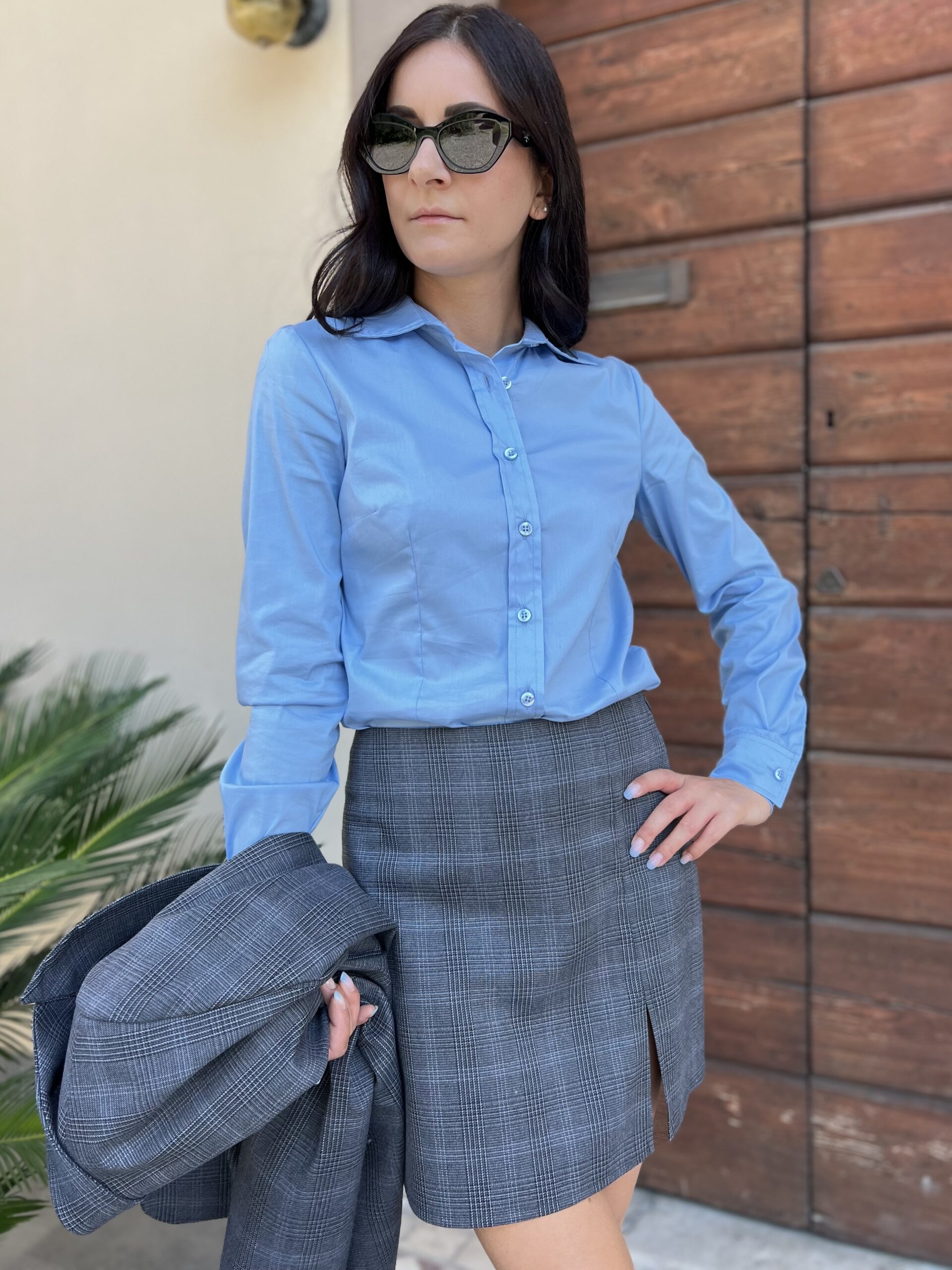 Camicia in cotone con colletto classico dalla linea slim e sfiancata. Veste poco, taglia 40 per xs, taglia 42 per s e 44 per m.