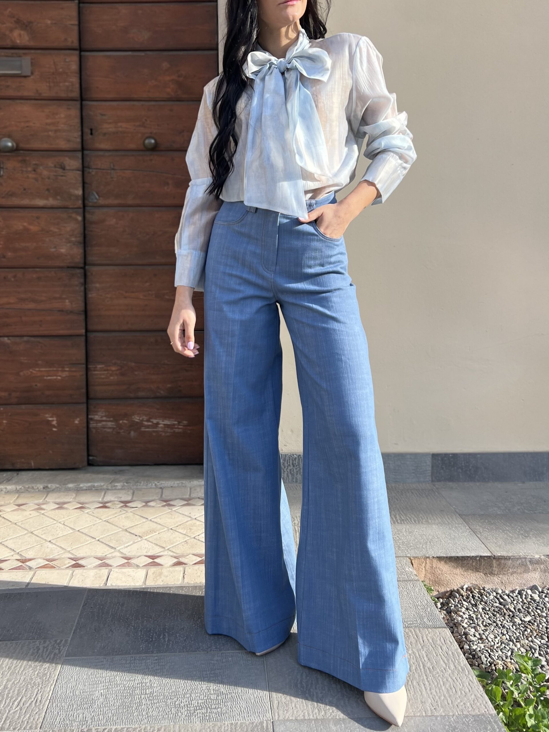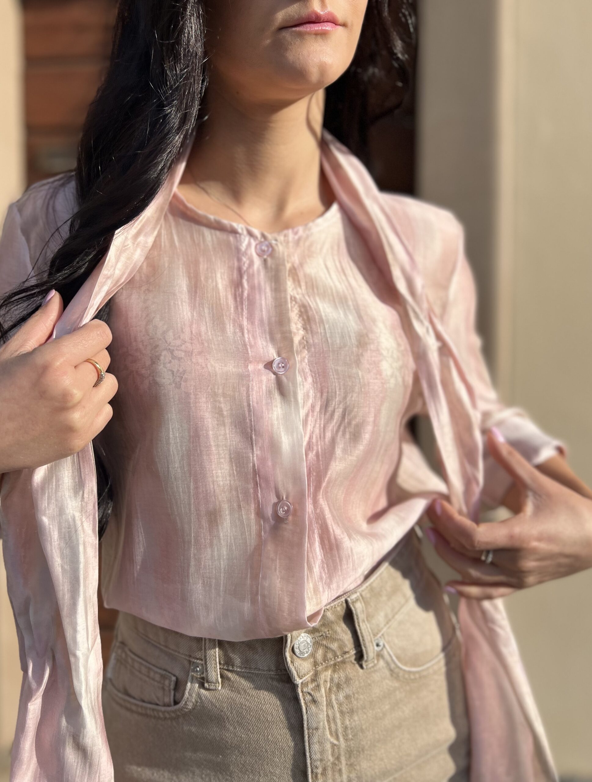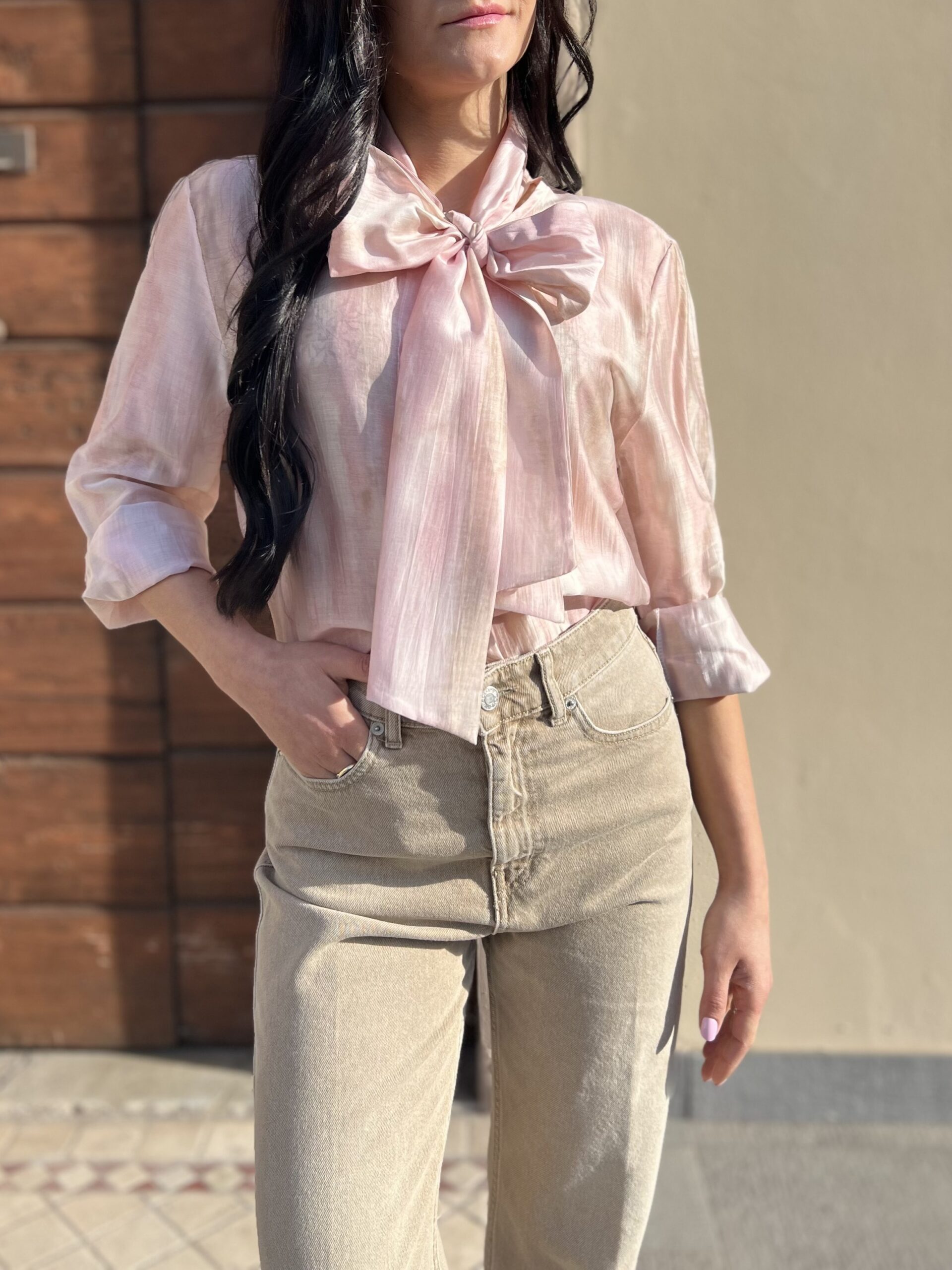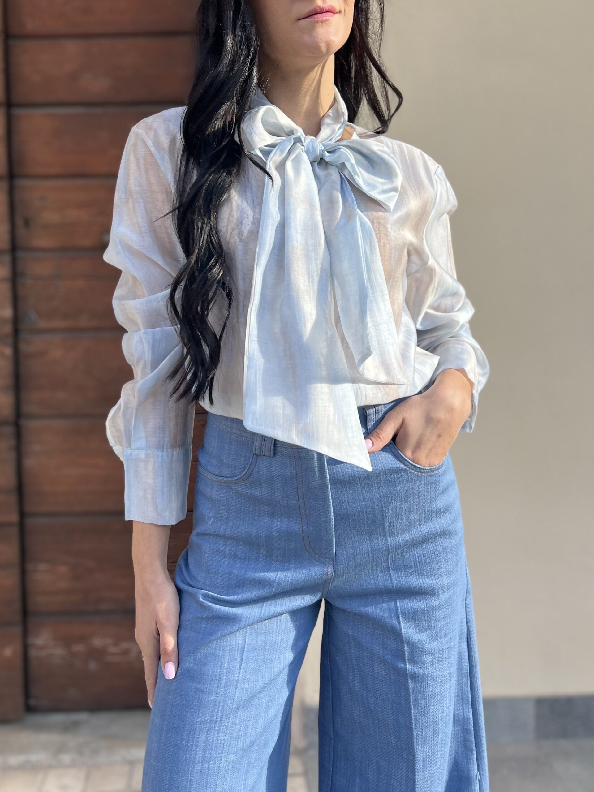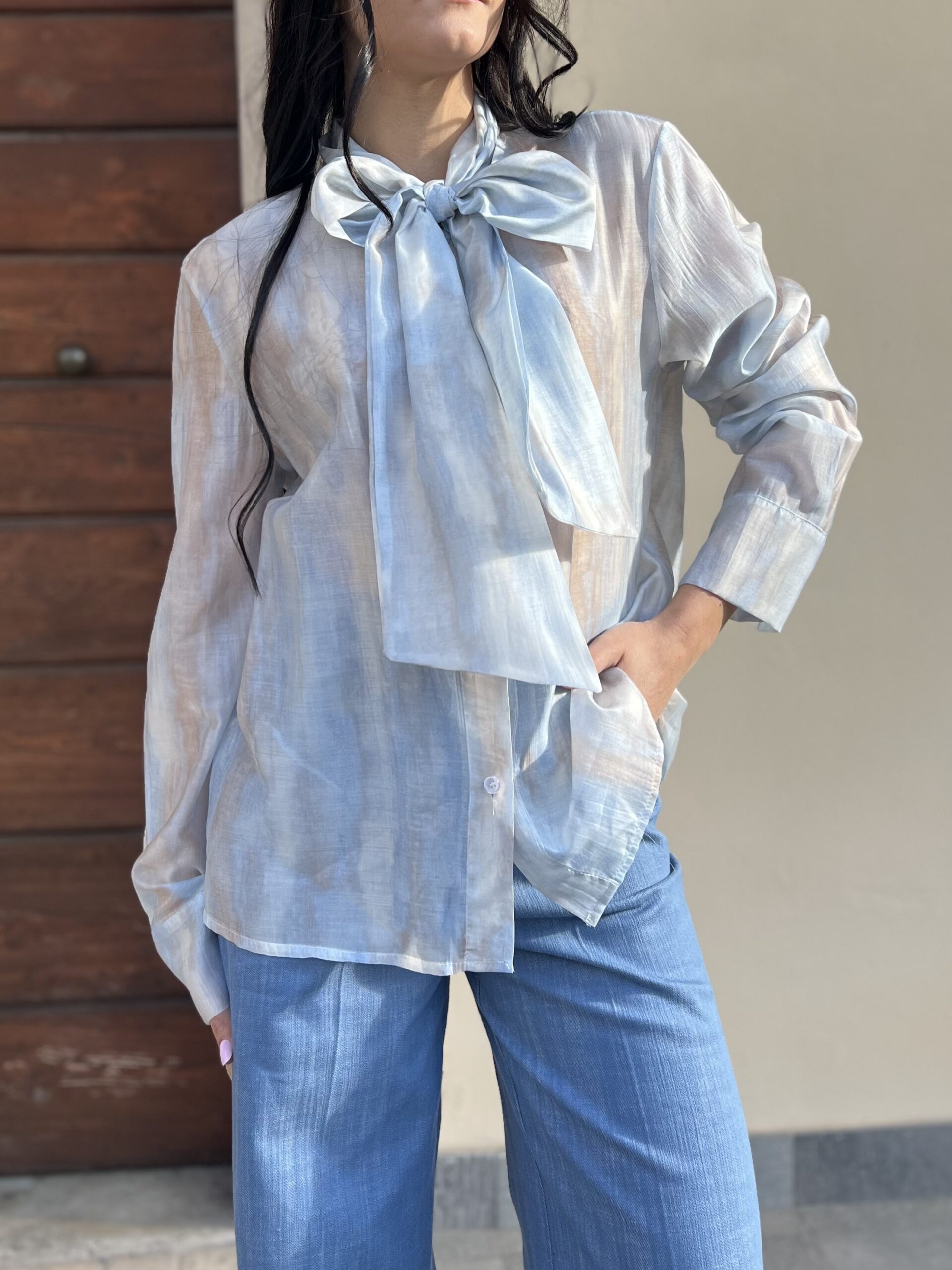Camicia dal taglio dritto e ampio, modello girocollo con fiocco. Taglia unica veste fino alla 46. Composizione: 75% tencel, 25% nylon.