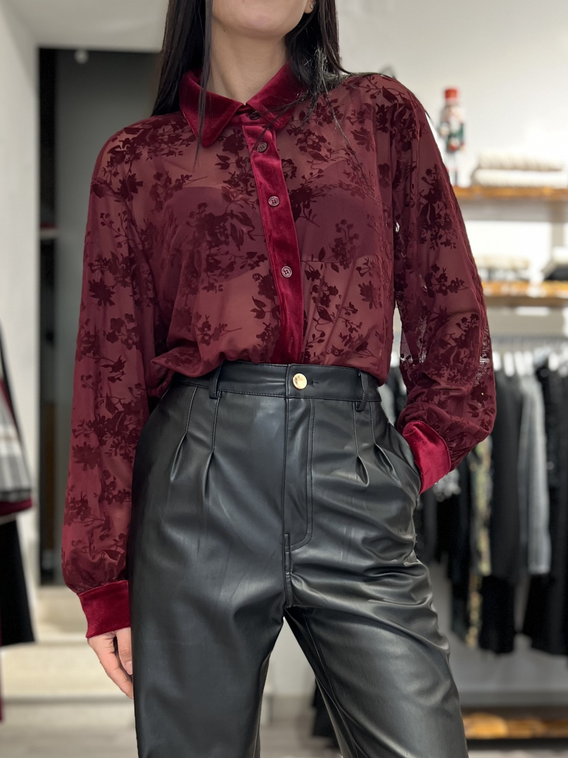 Camicia con colletto e polsini in velluto. Modello classico dalla vestibilità morbida, ricamata. Taglia unica veste fino alla 44.