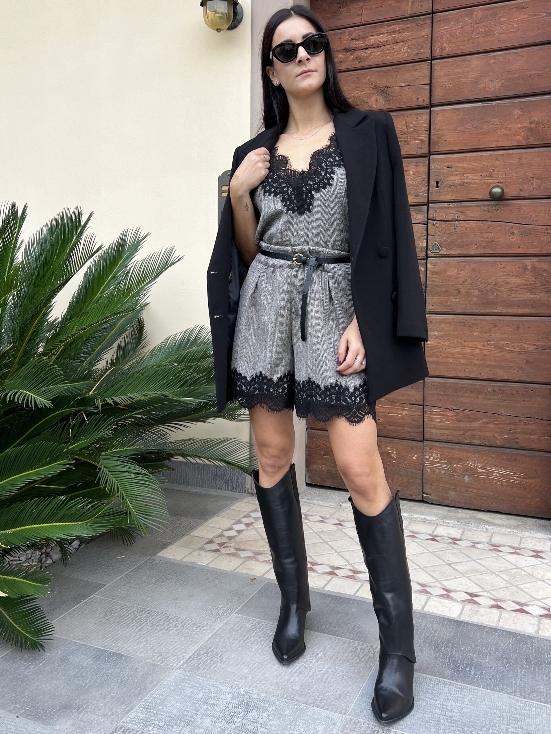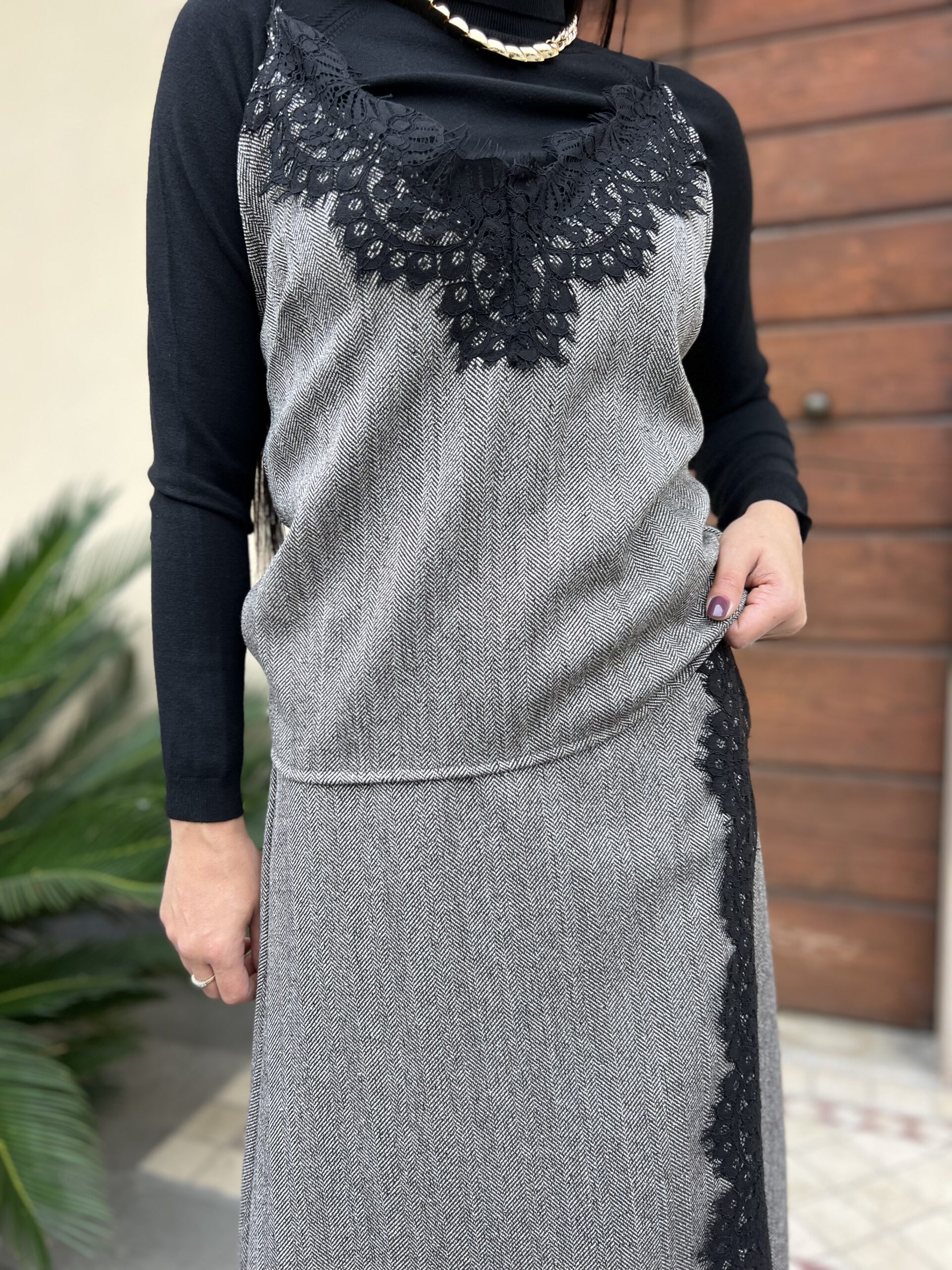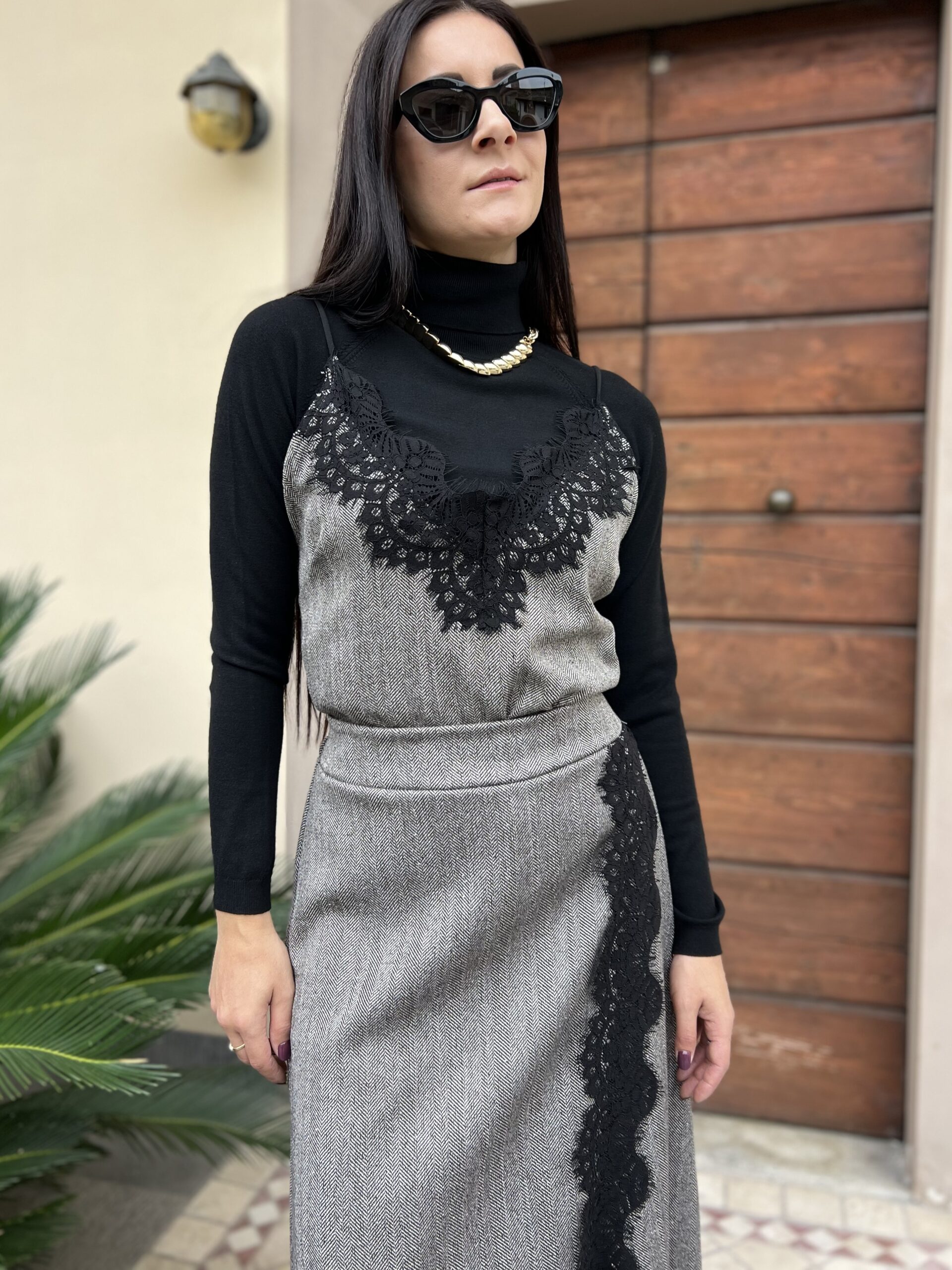 Canotta con spallino sottile e inserto in pizzo. Elastico sul retro, taglia unica veste fino alla M.Tessuto spigato, una mista viscosa, calda e strutturata.