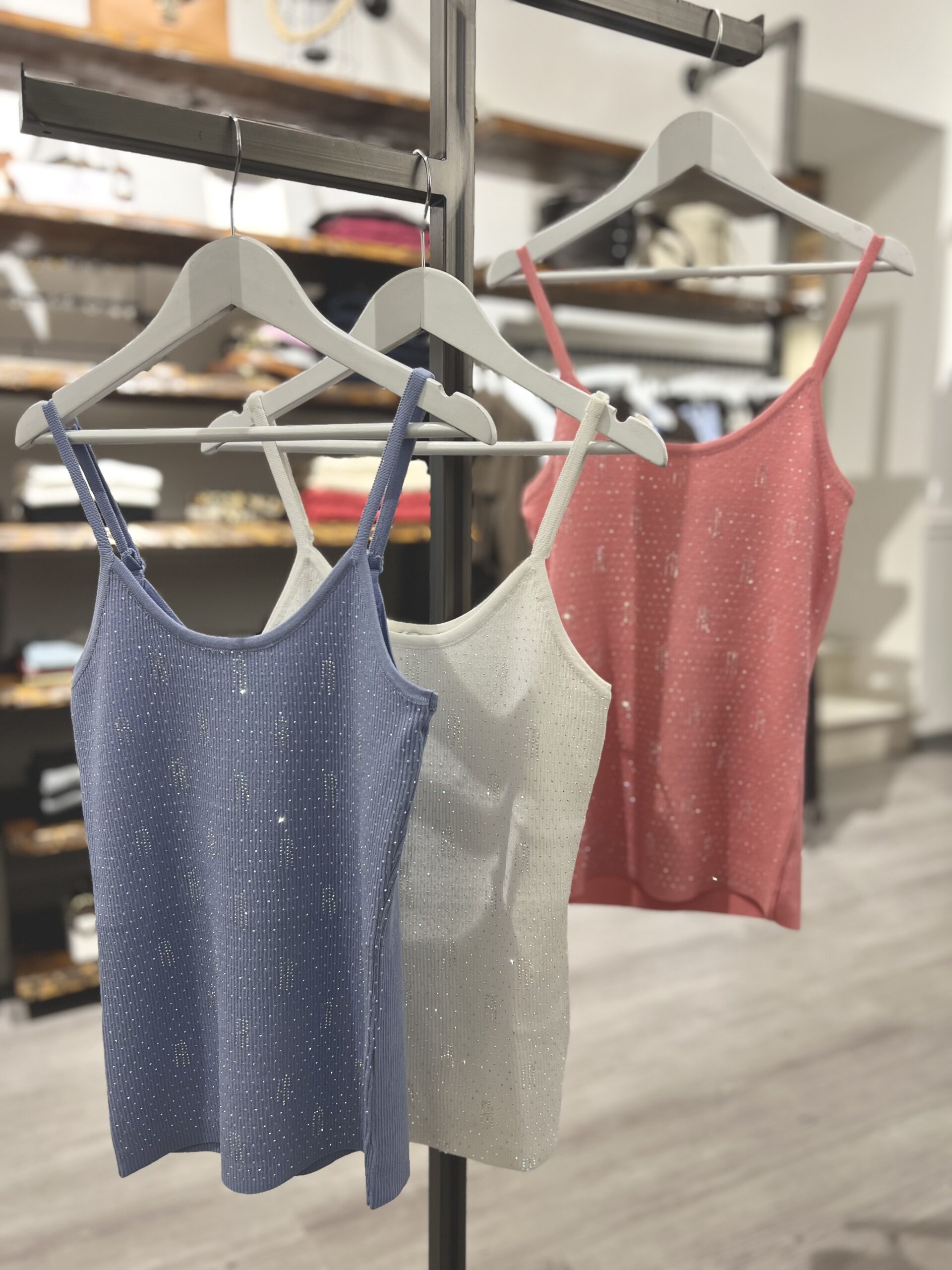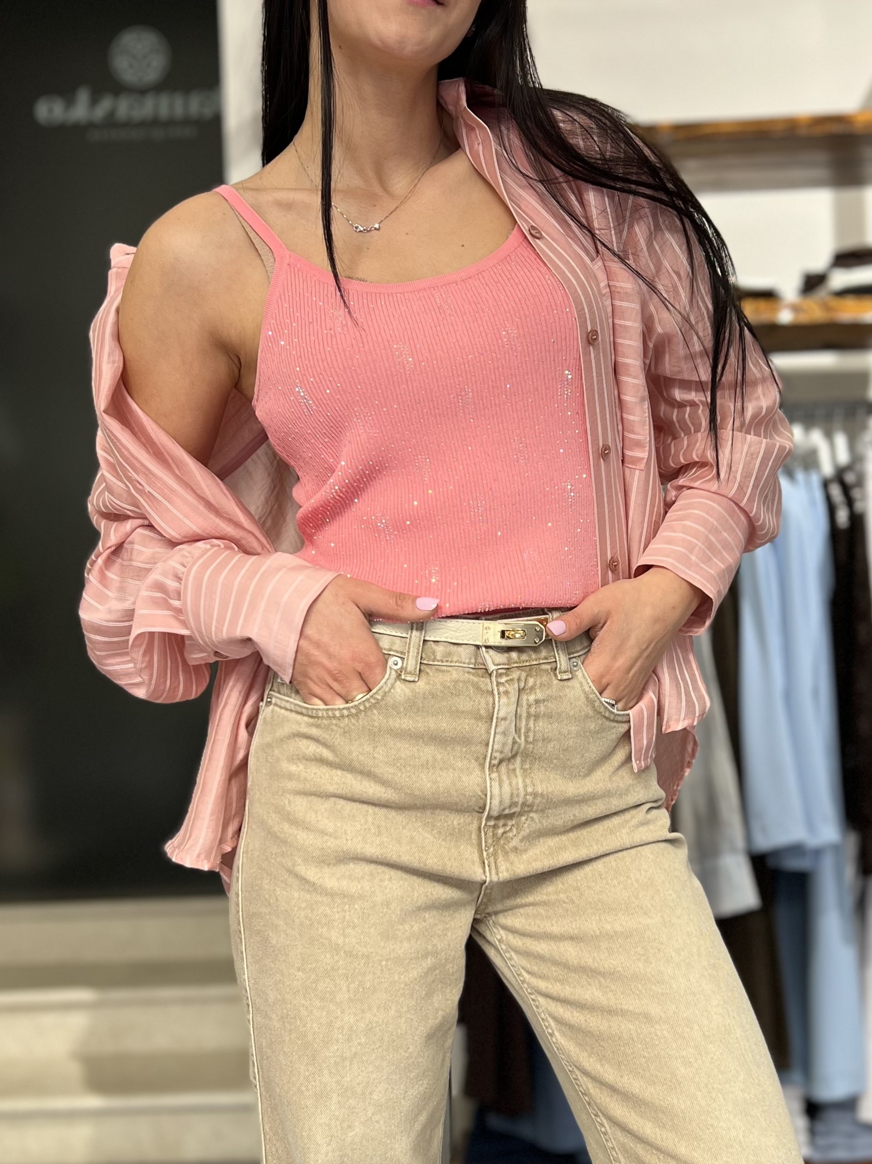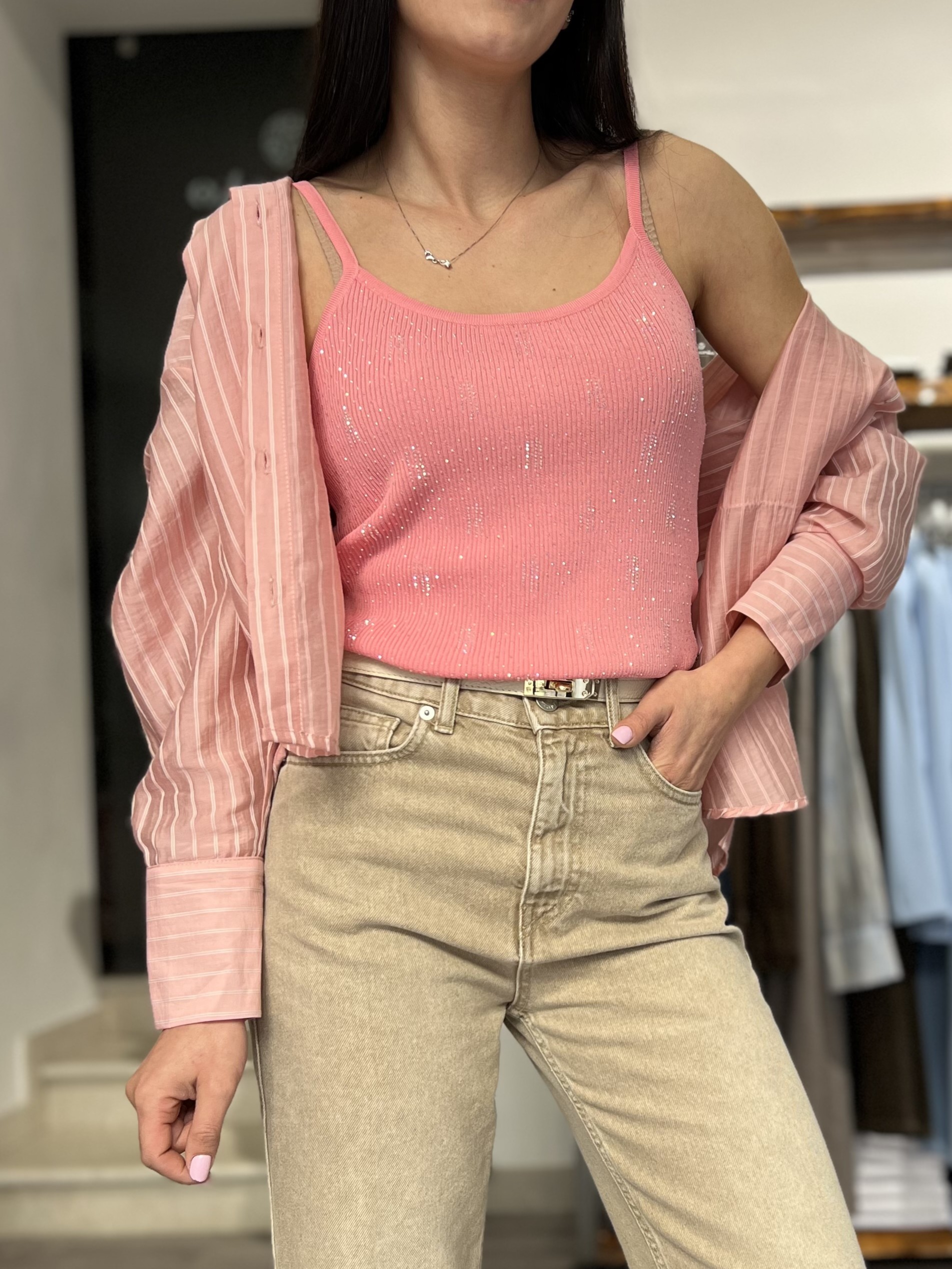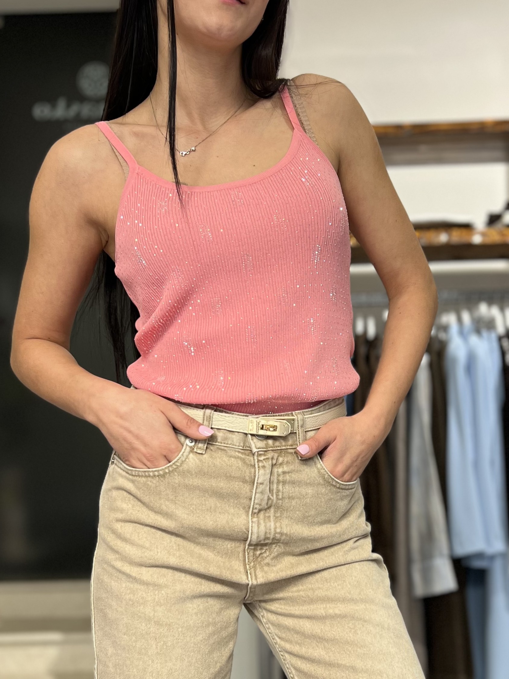 Canotta a costine con spallino regolabile e strass applicati. Composizione: 65% viscosa 35% poliammide.