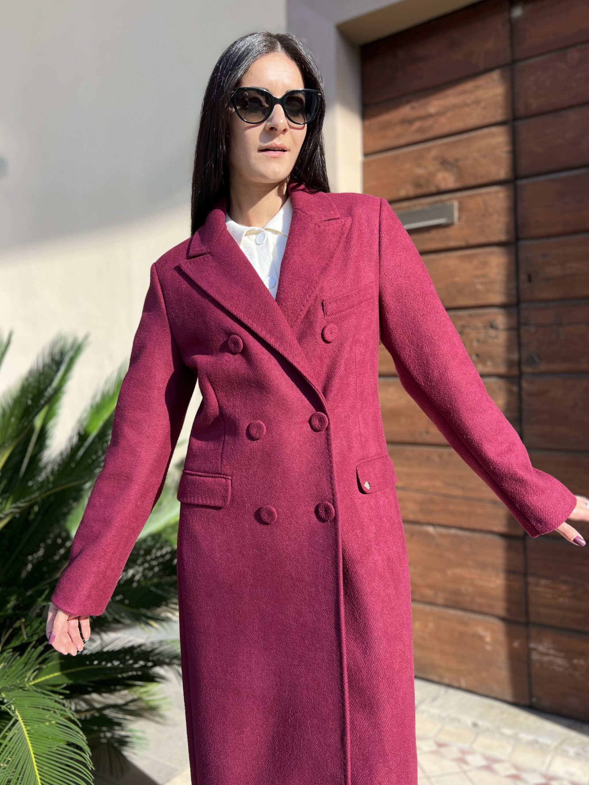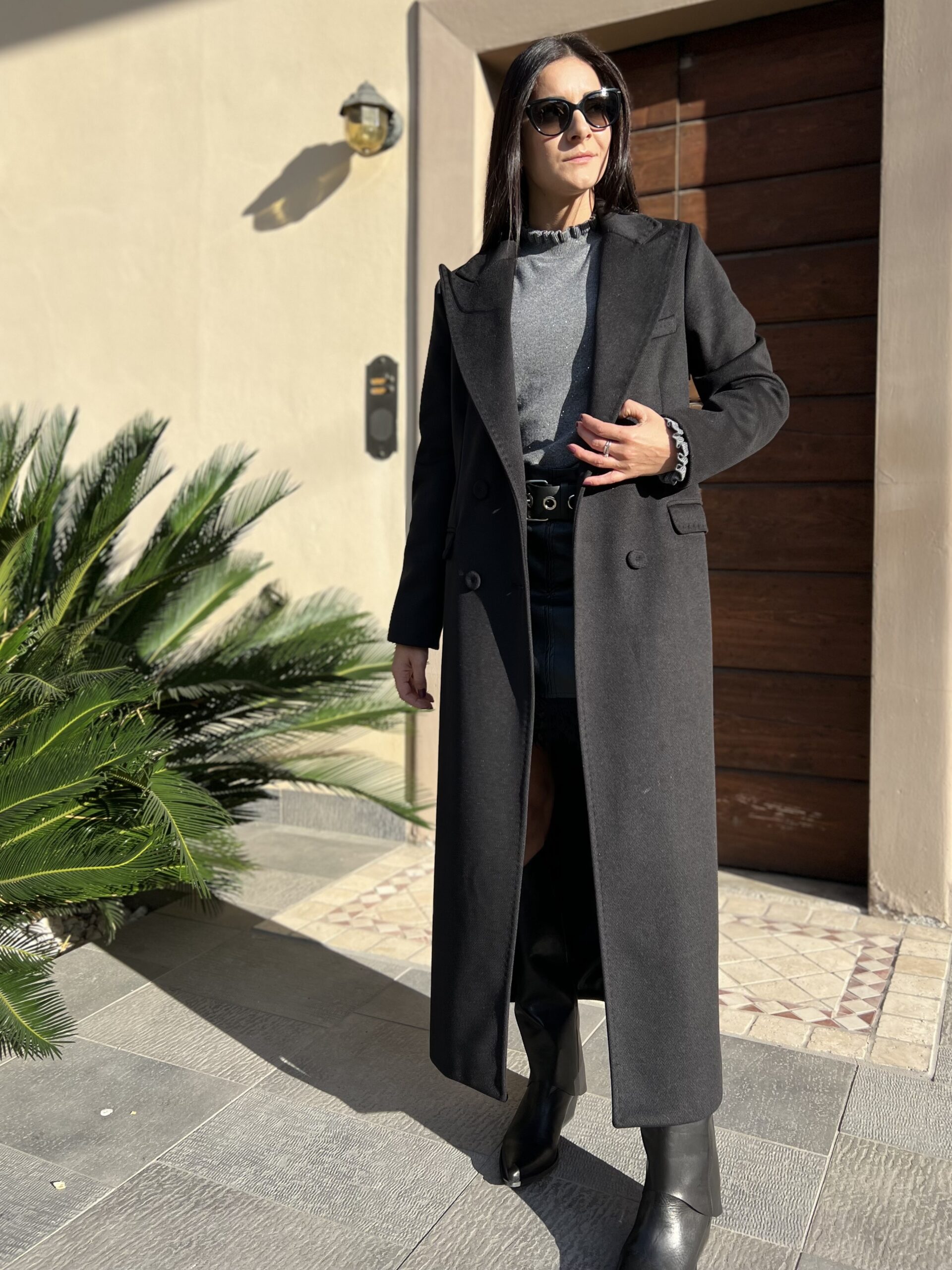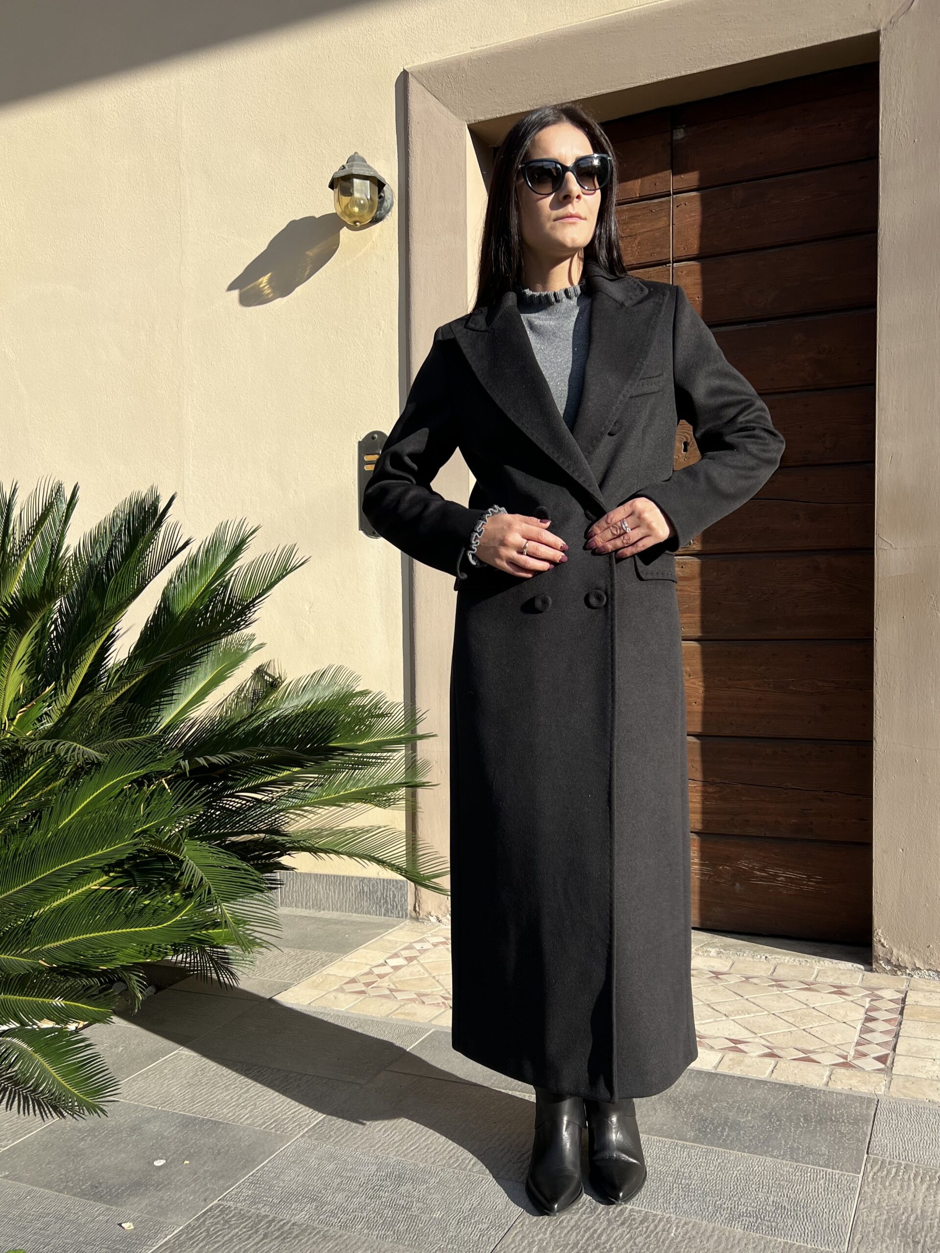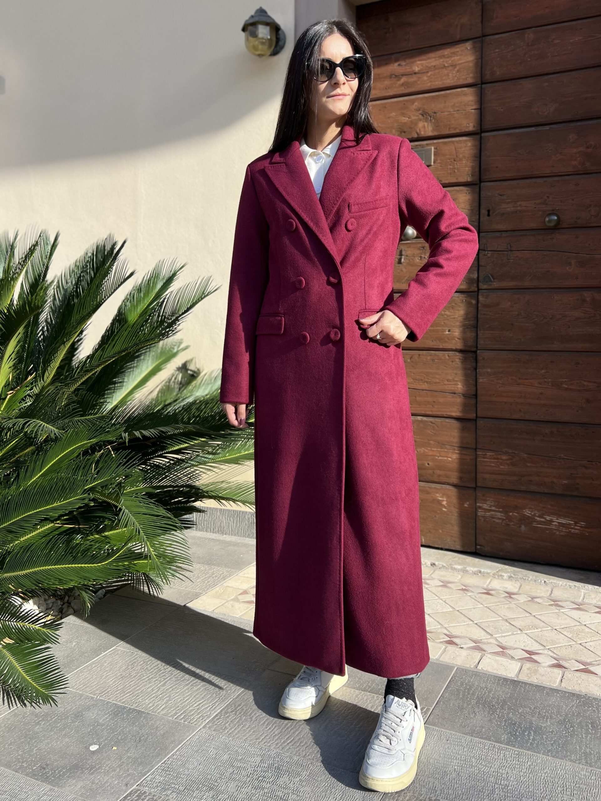 Cappotto lungo doppiopetto con revers classico e chiusura bottoni. Modello foderato dal taglio leggermente sfiancato e tasche laterali. Tessuto morbidissimo al tatto in misto viscosa. Taglia XS per 40, S per 42 e M per 44.