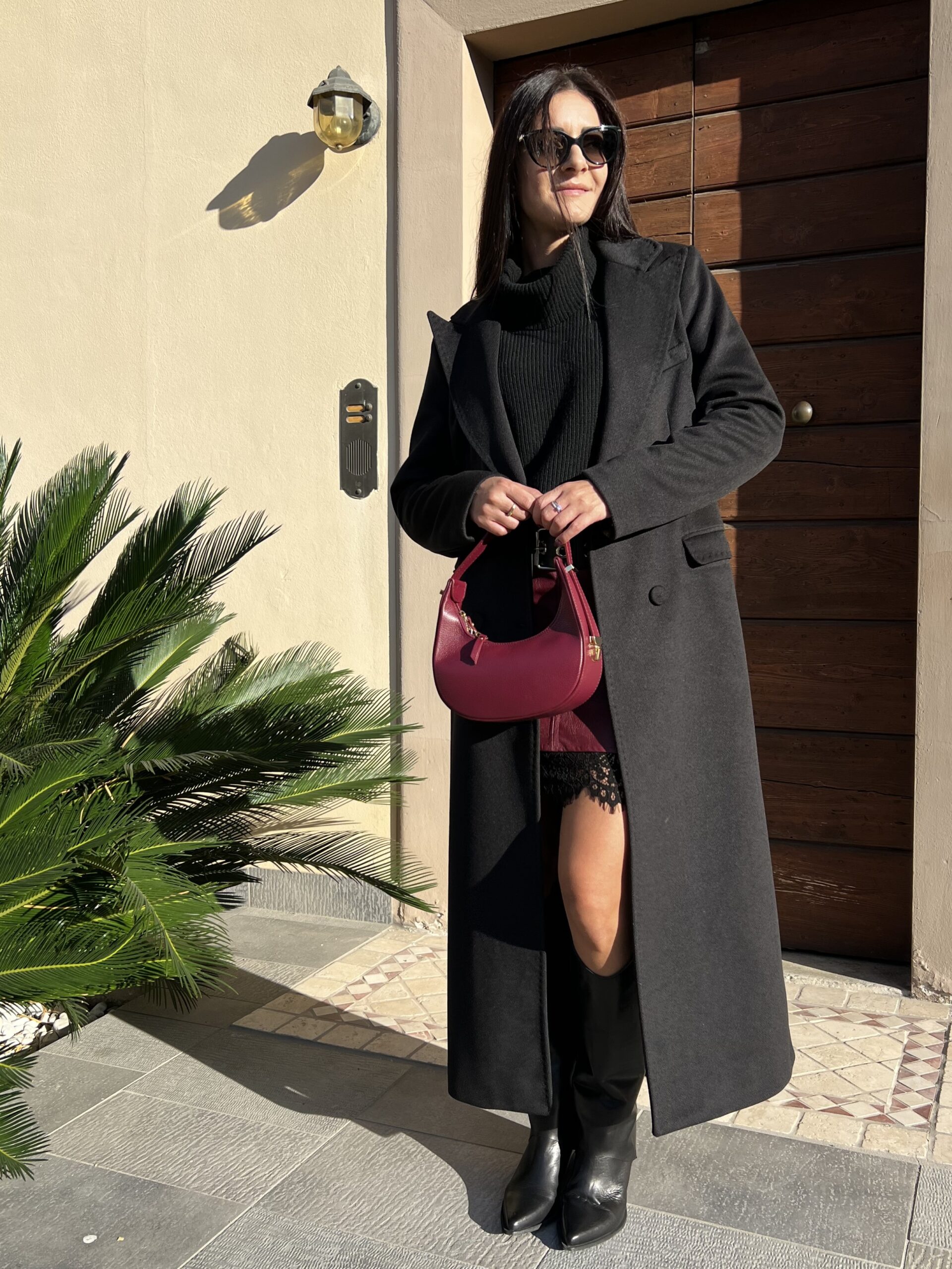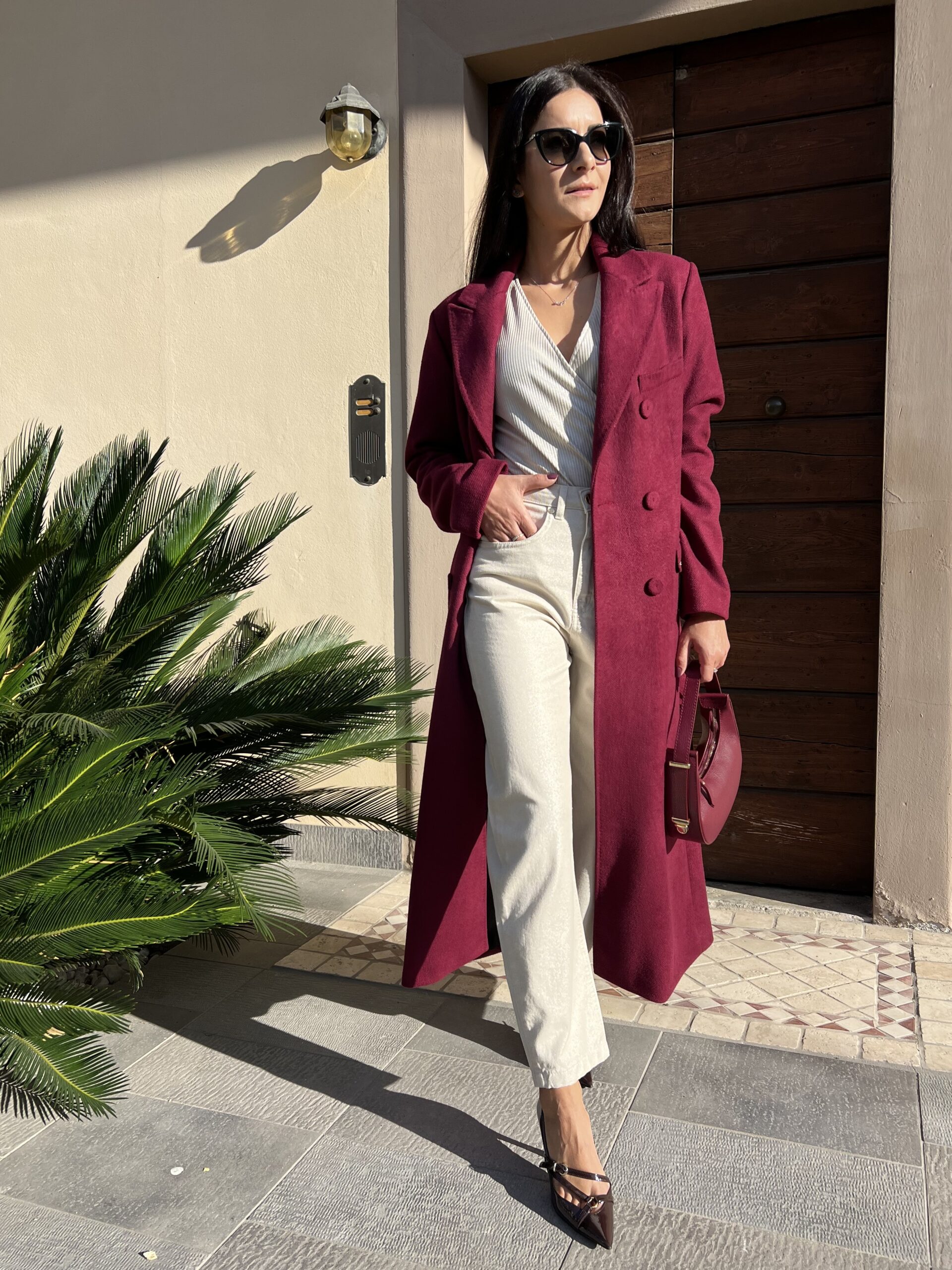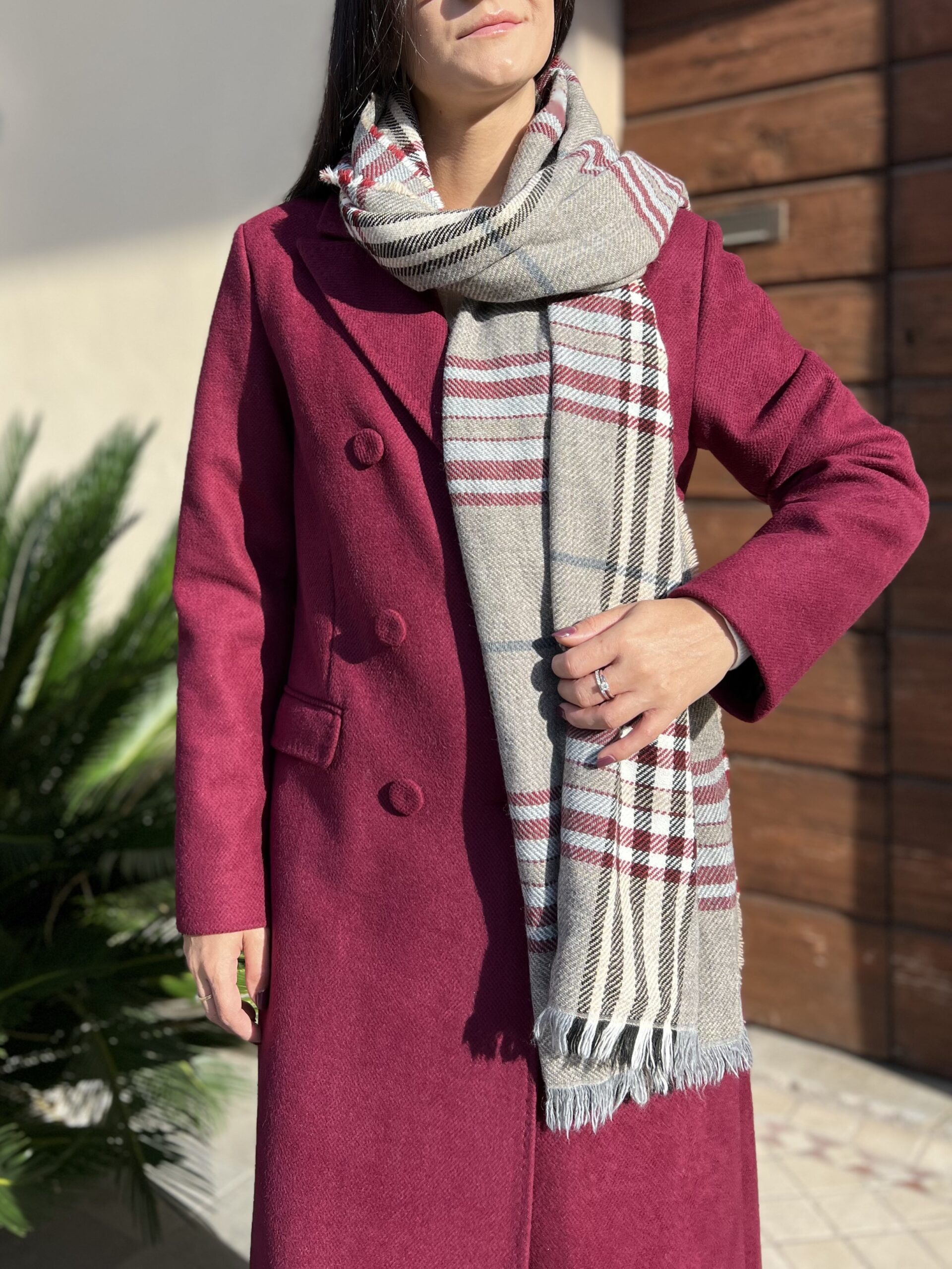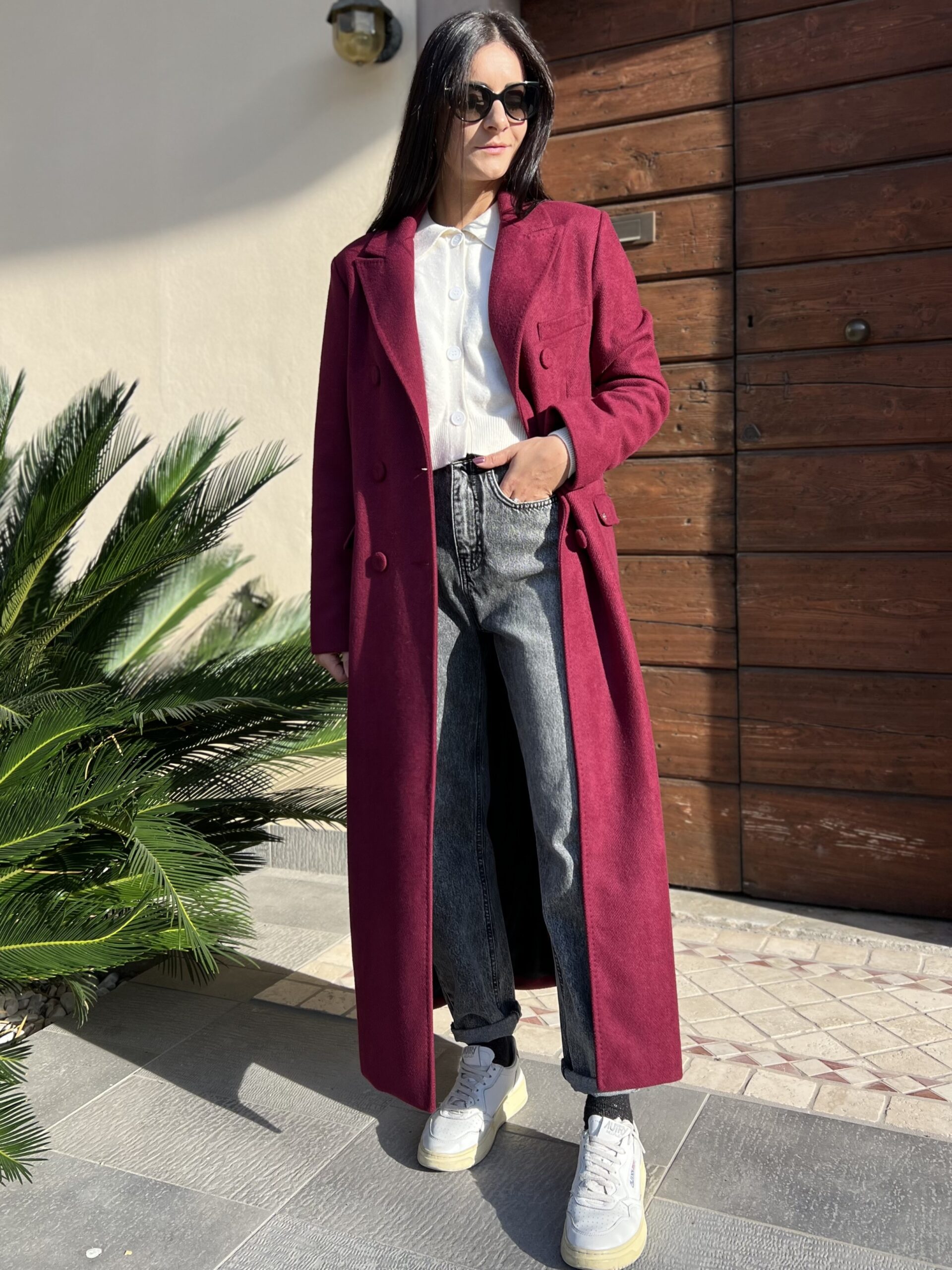 Cappotto lungo doppiopetto con revers classico e chiusura bottoni. Modello foderato dal taglio leggermente sfiancato e tasche laterali. Tessuto morbidissimo al tatto in misto viscosa. Taglia XS per 40, S per 42 e M per 44.