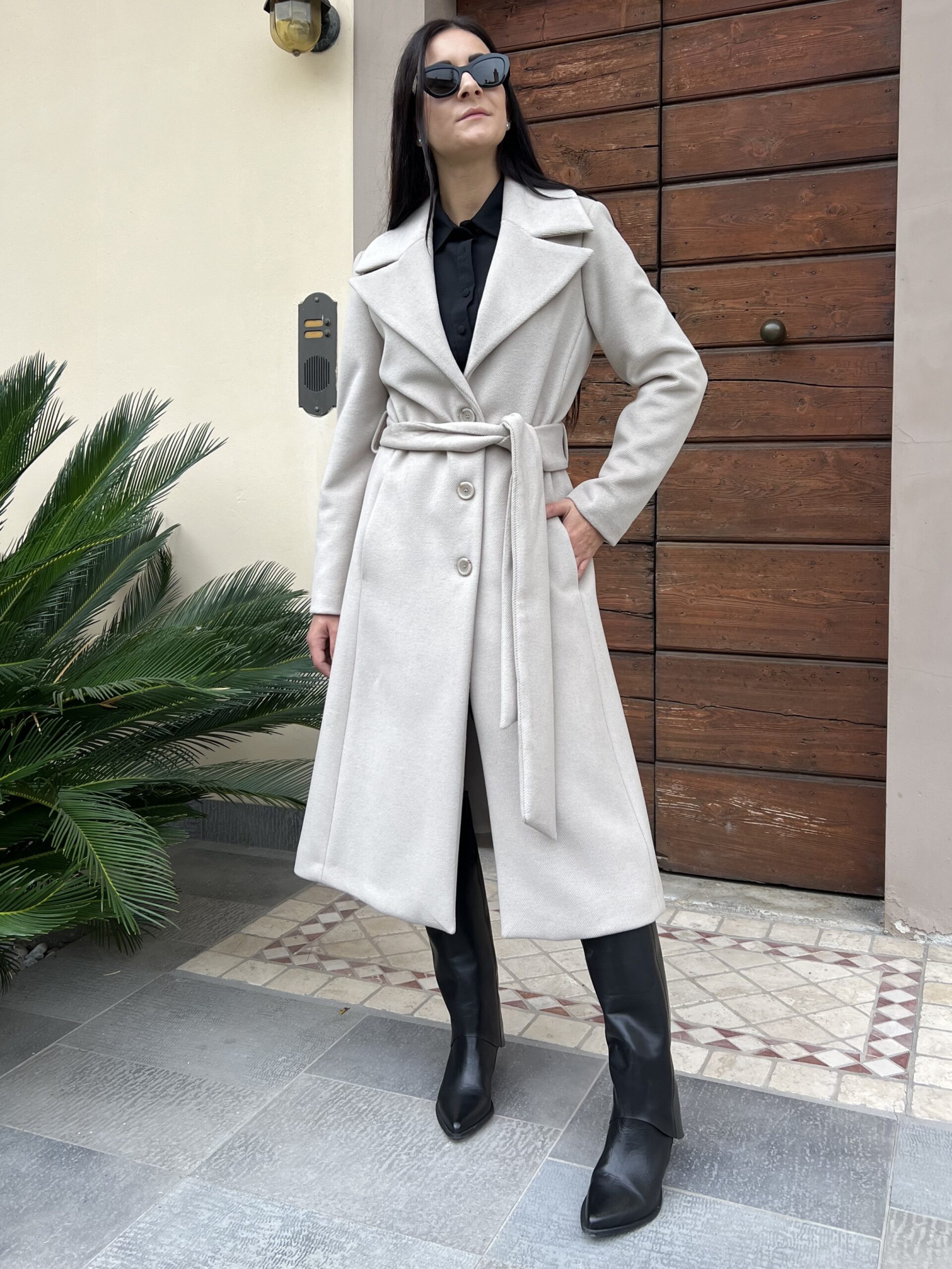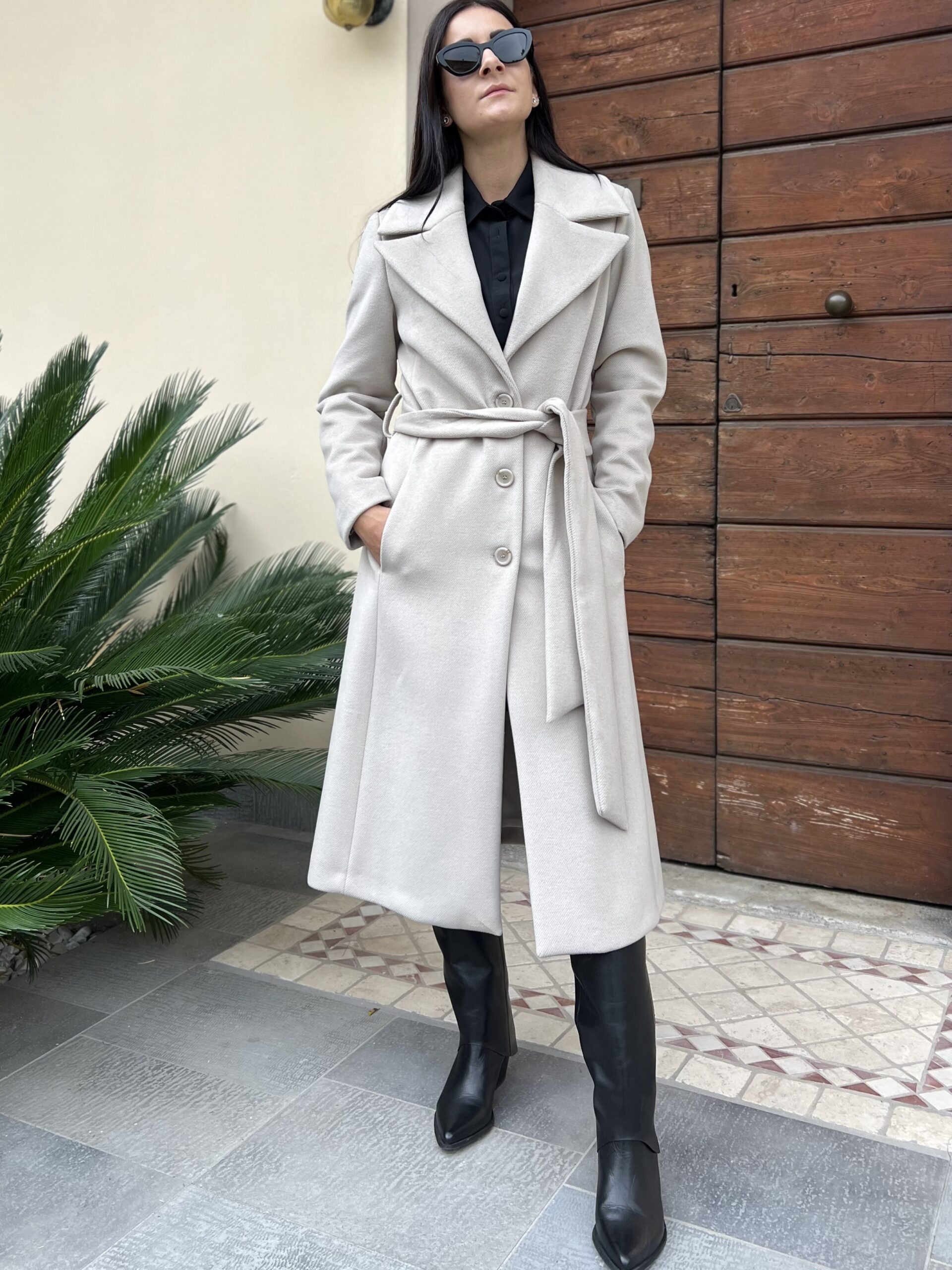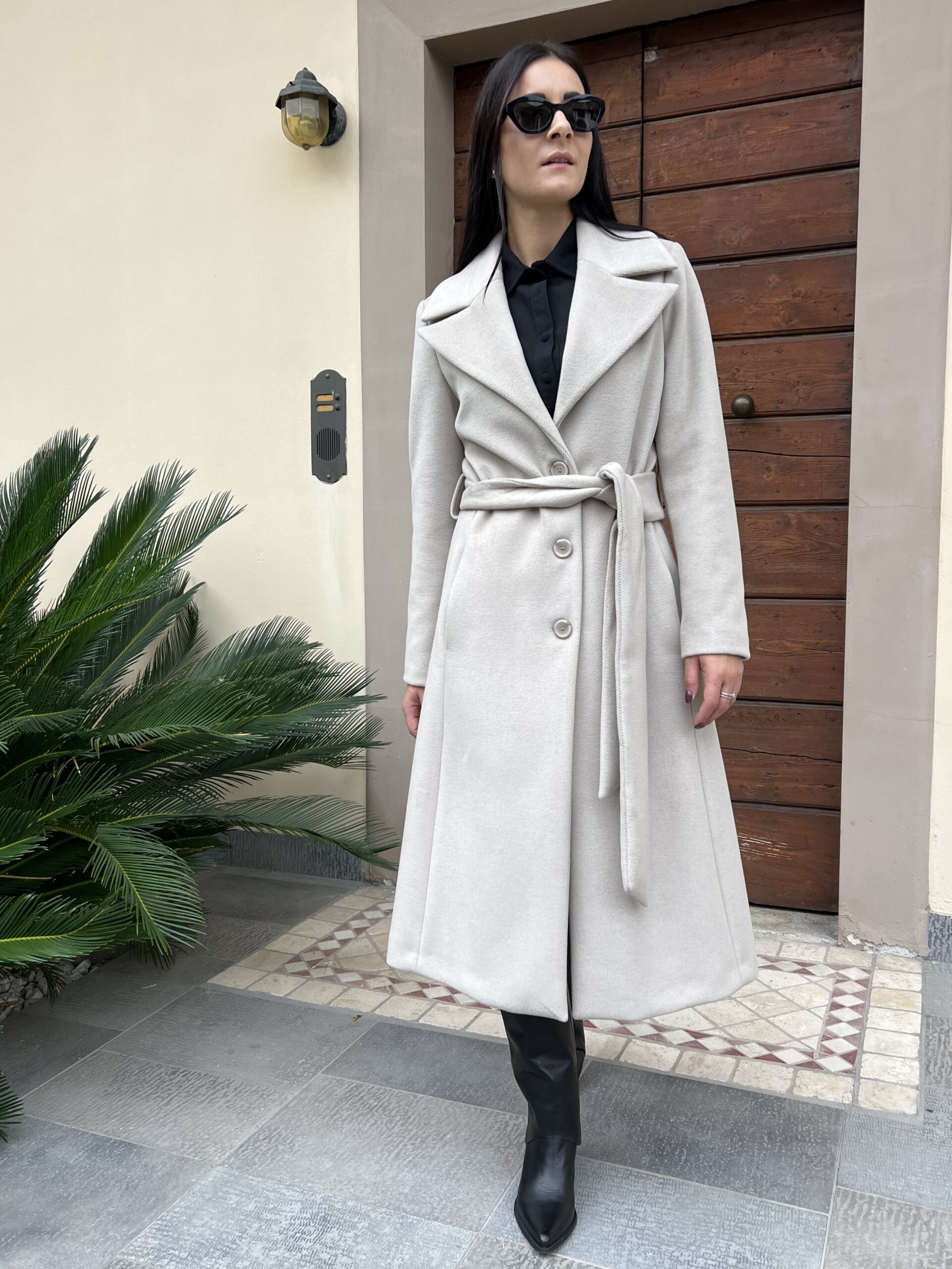 Cappotto lungo monopetto con revers a lancia e chiusura bottoni. Modello foderato con cintura in vita e tasche laterali. Tessuto morbidissimo al tatto in misto viscosa.