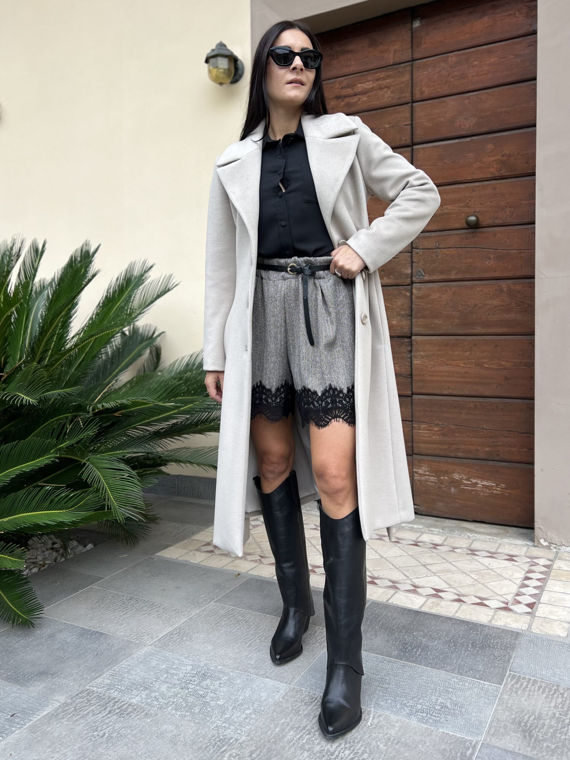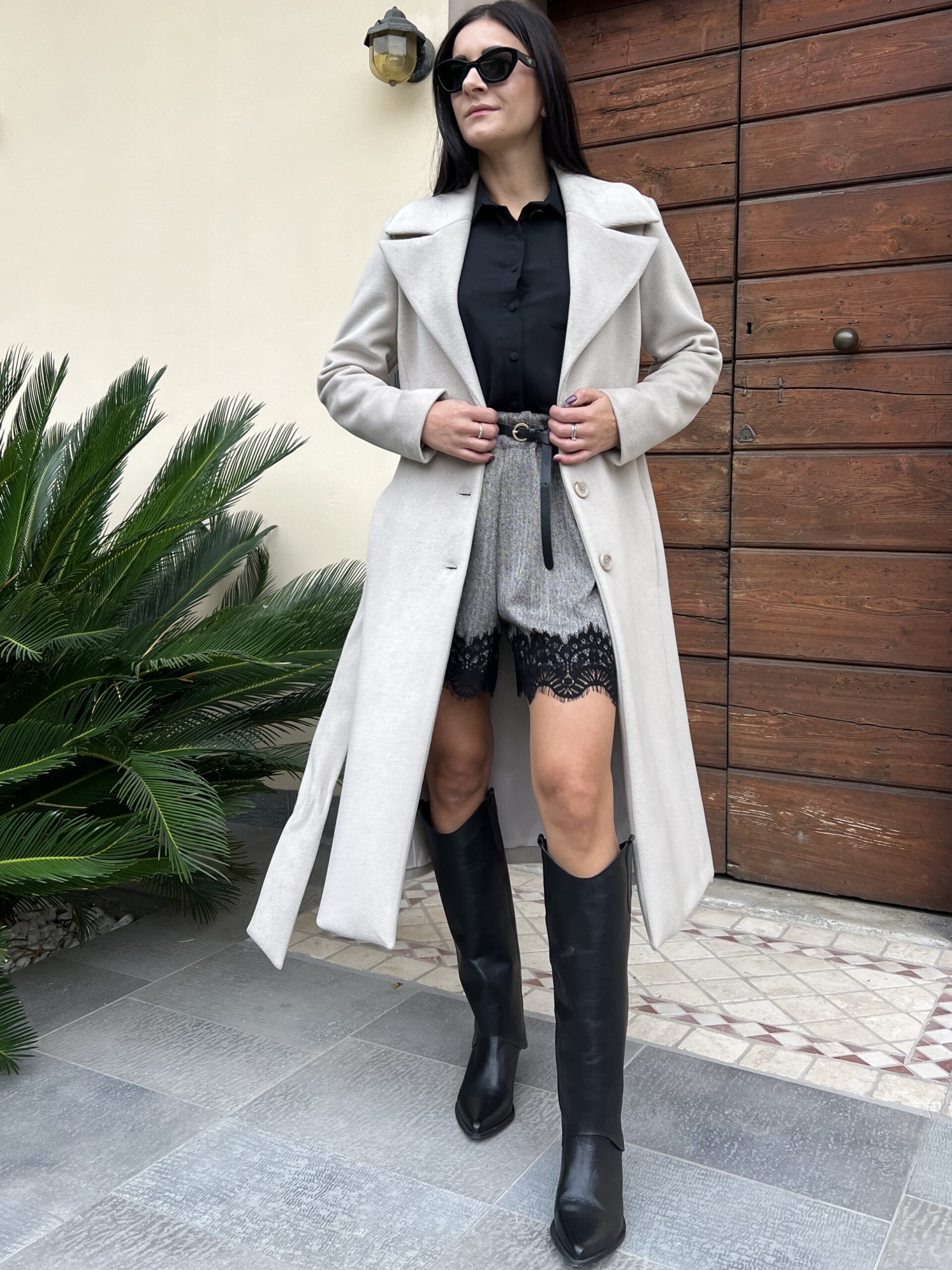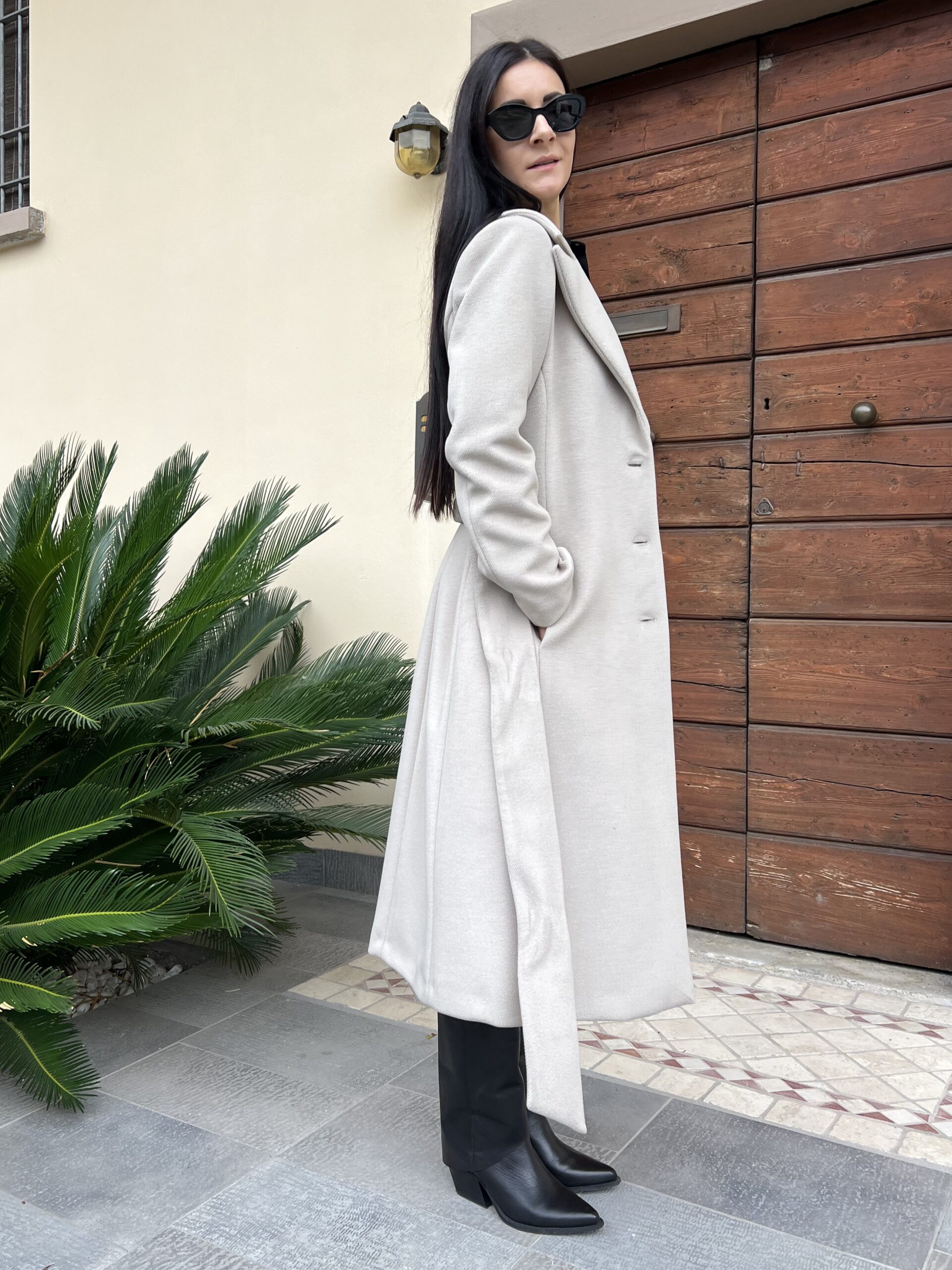 Cappotto lungo monopetto con revers a lancia e chiusura bottoni. Modello foderato con cintura in vita e tasche laterali. Tessuto morbidissimo al tatto in misto viscosa.