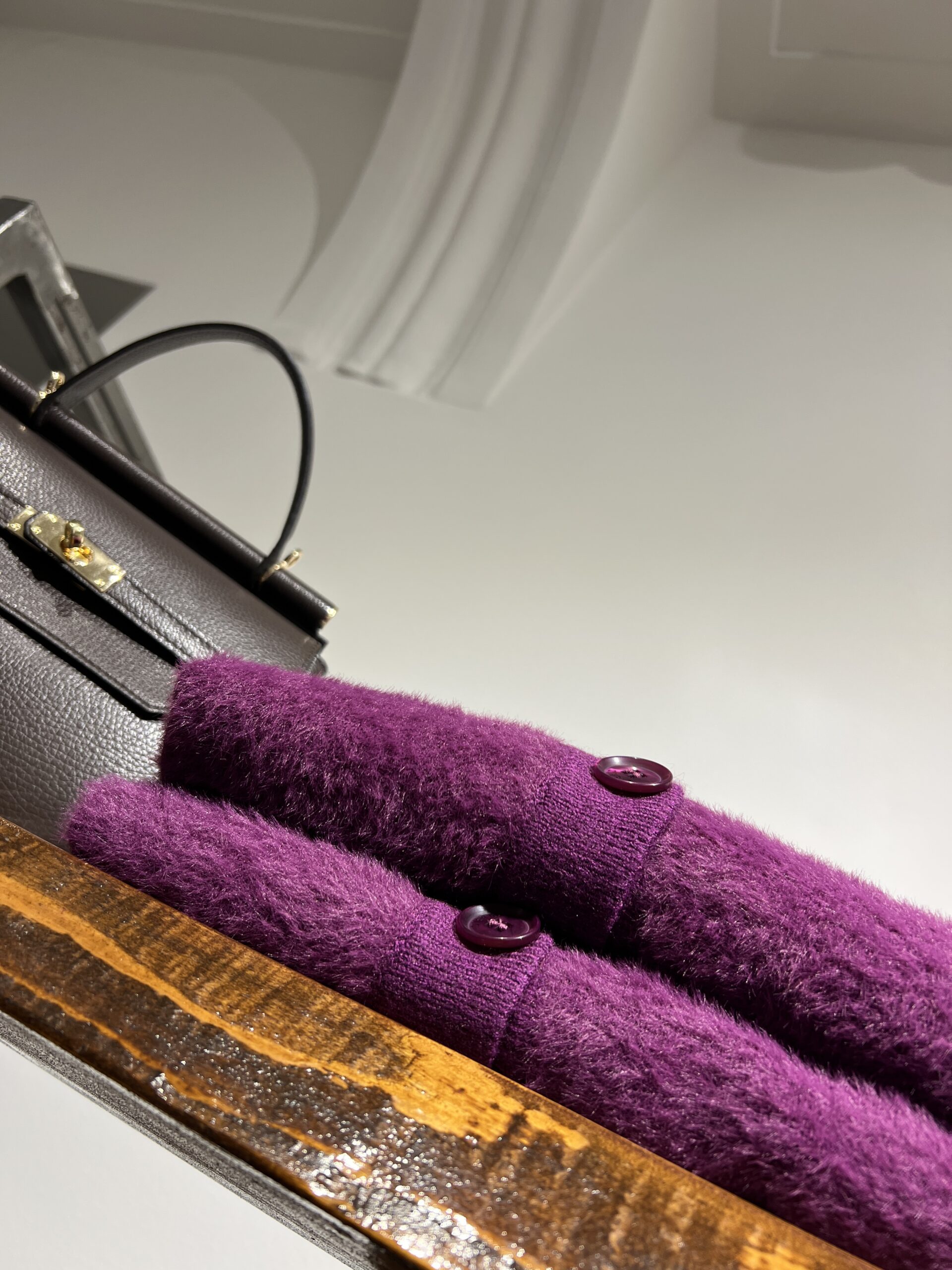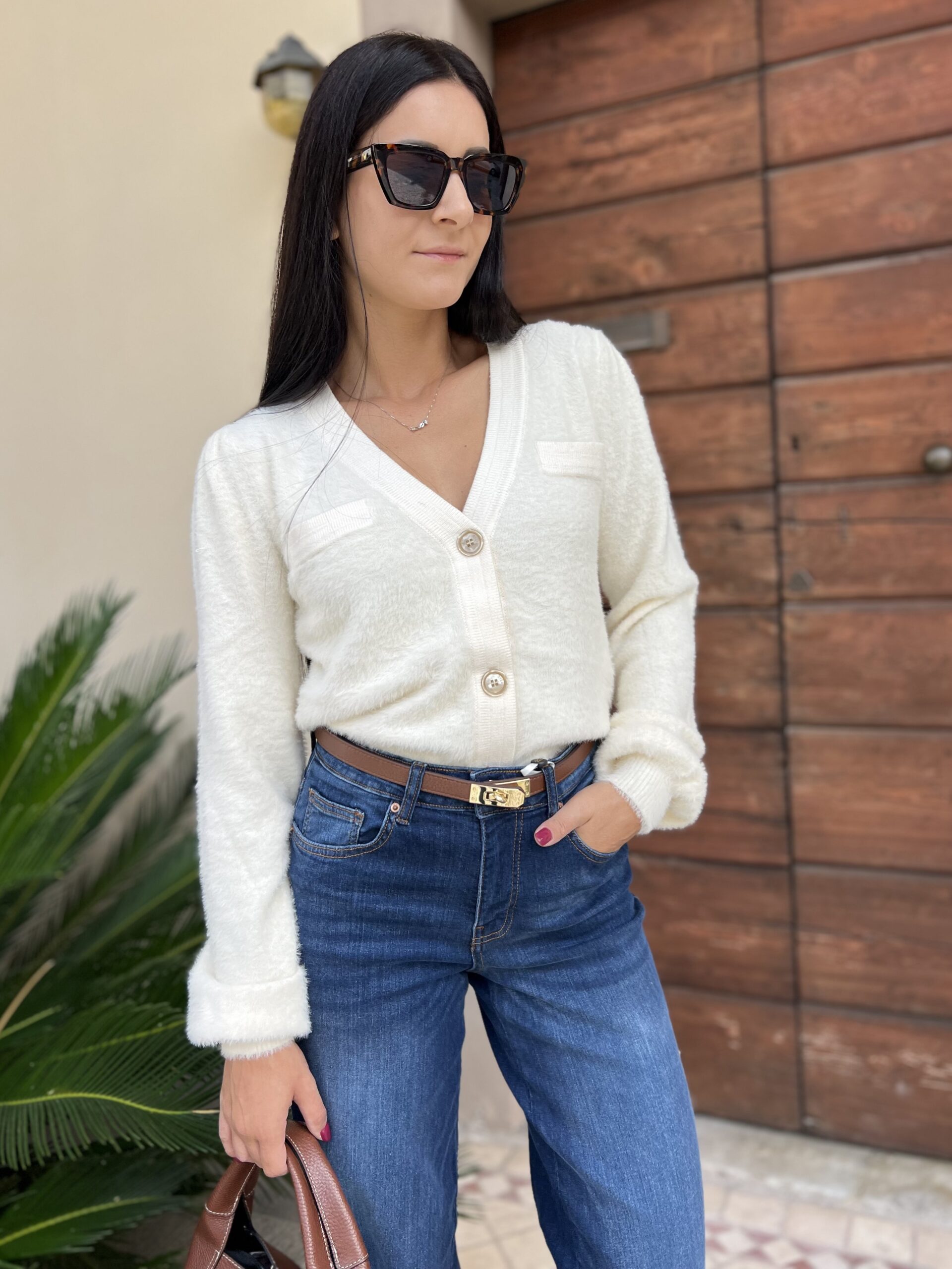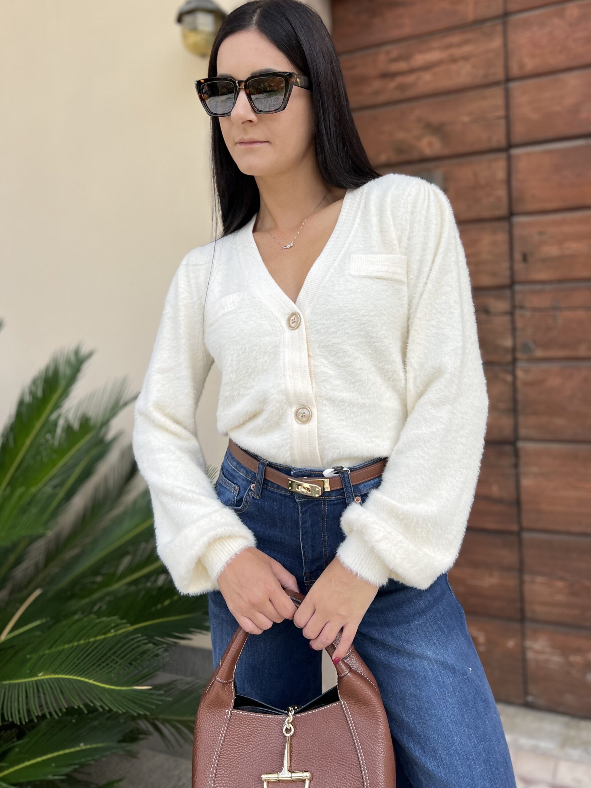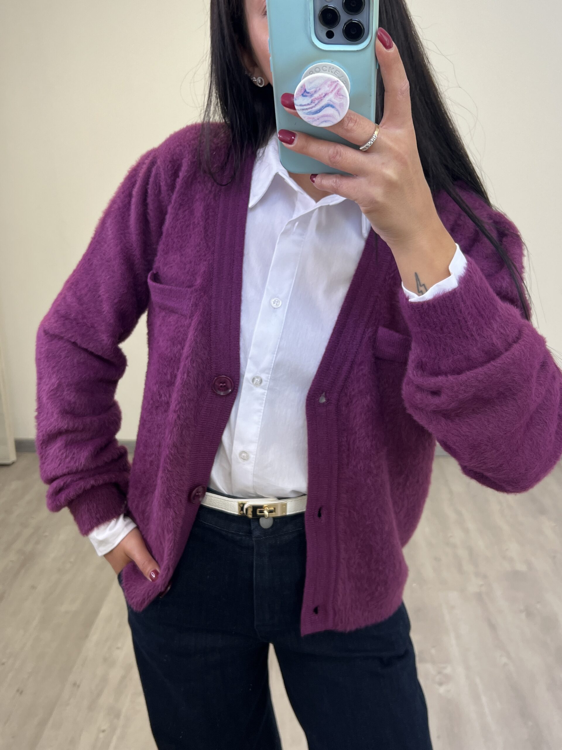 Cardigan dalla linea morbida con scollo a V e manica leggermente a sbuffo. La taglia M veste fino alla 46.
