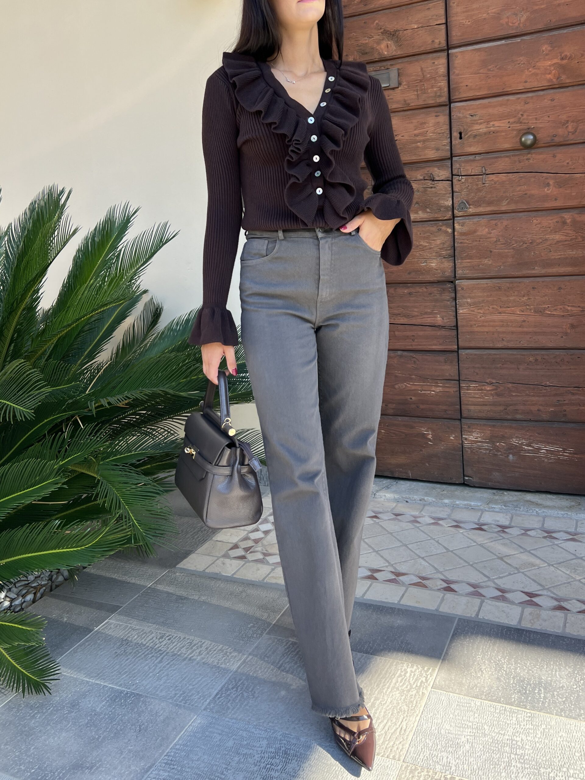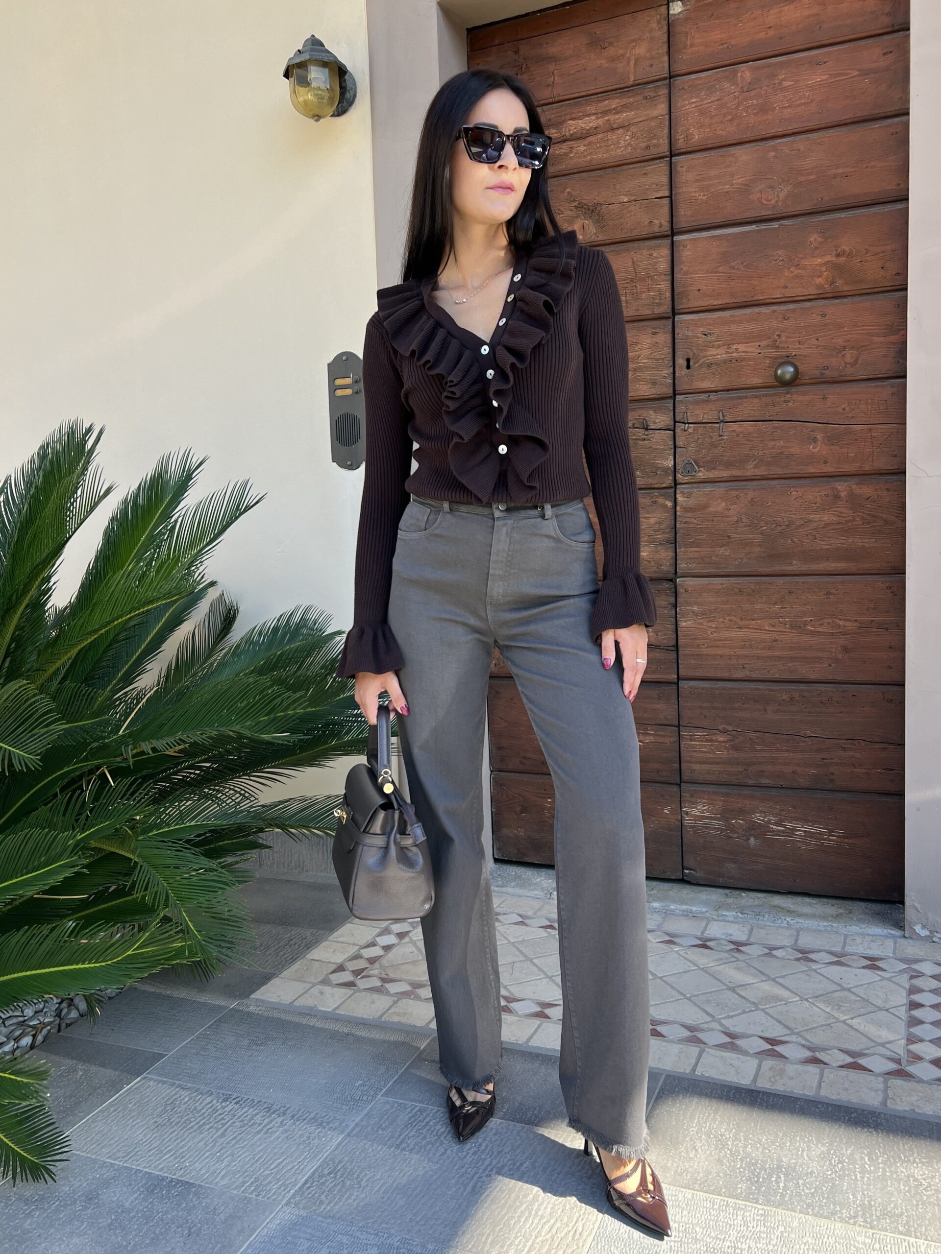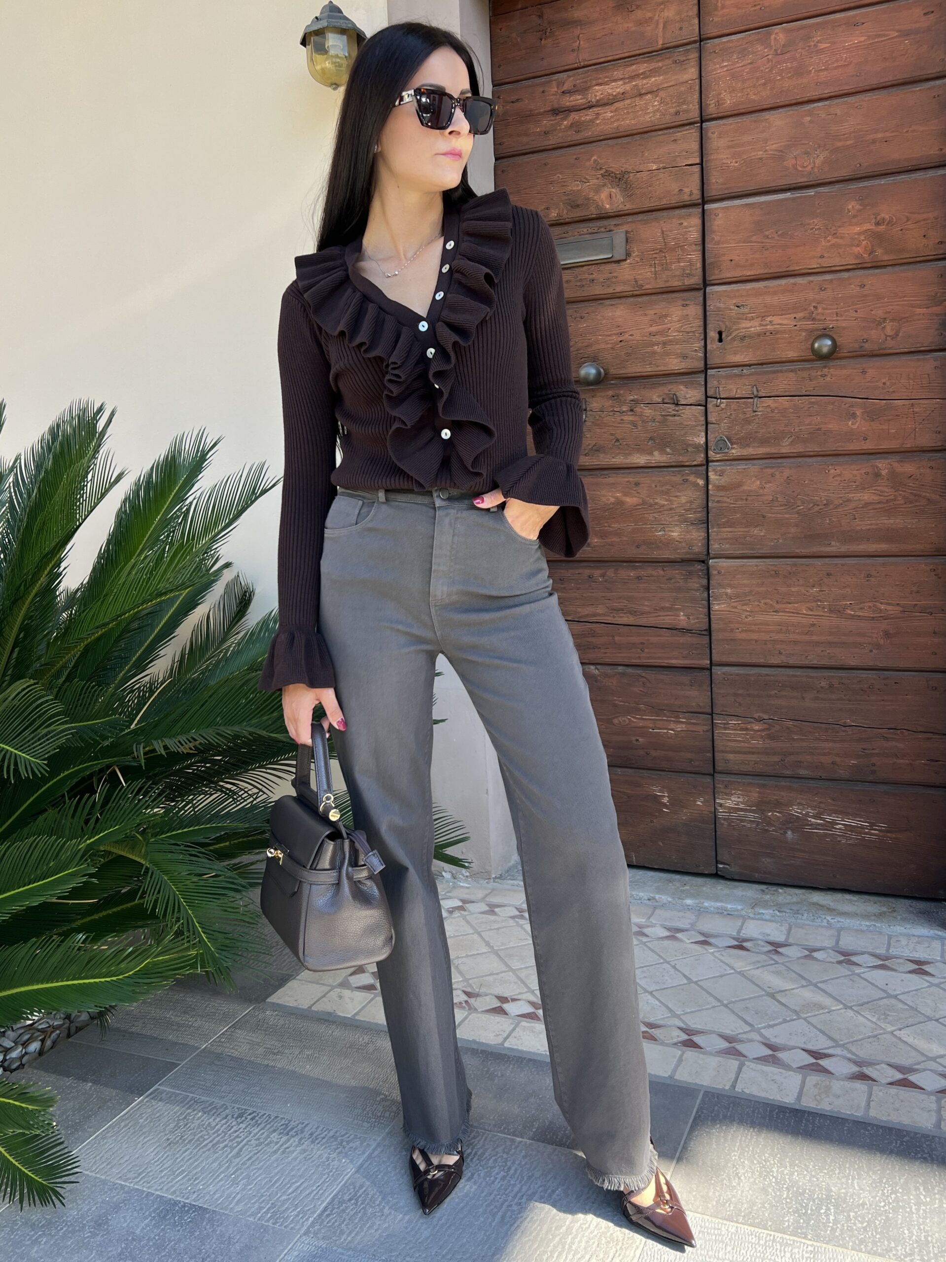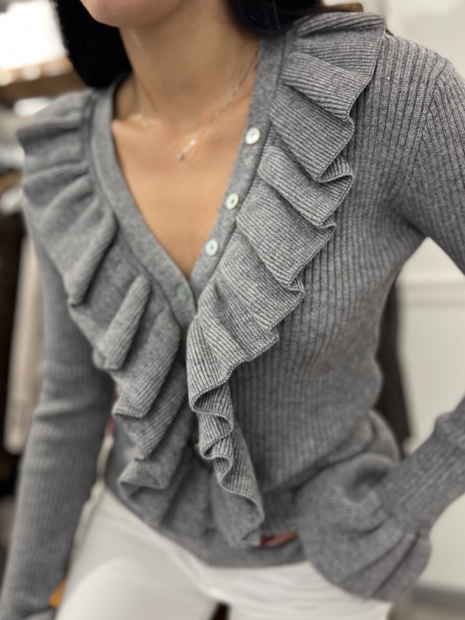 Cardigan con scollo a V e bottoni in madreperla. Modello slim elasticizzato, lungo fino al fianco, lavorato a coste con dettaglio volant e polsino a campanella. Taglia Unica veste fino alla L.