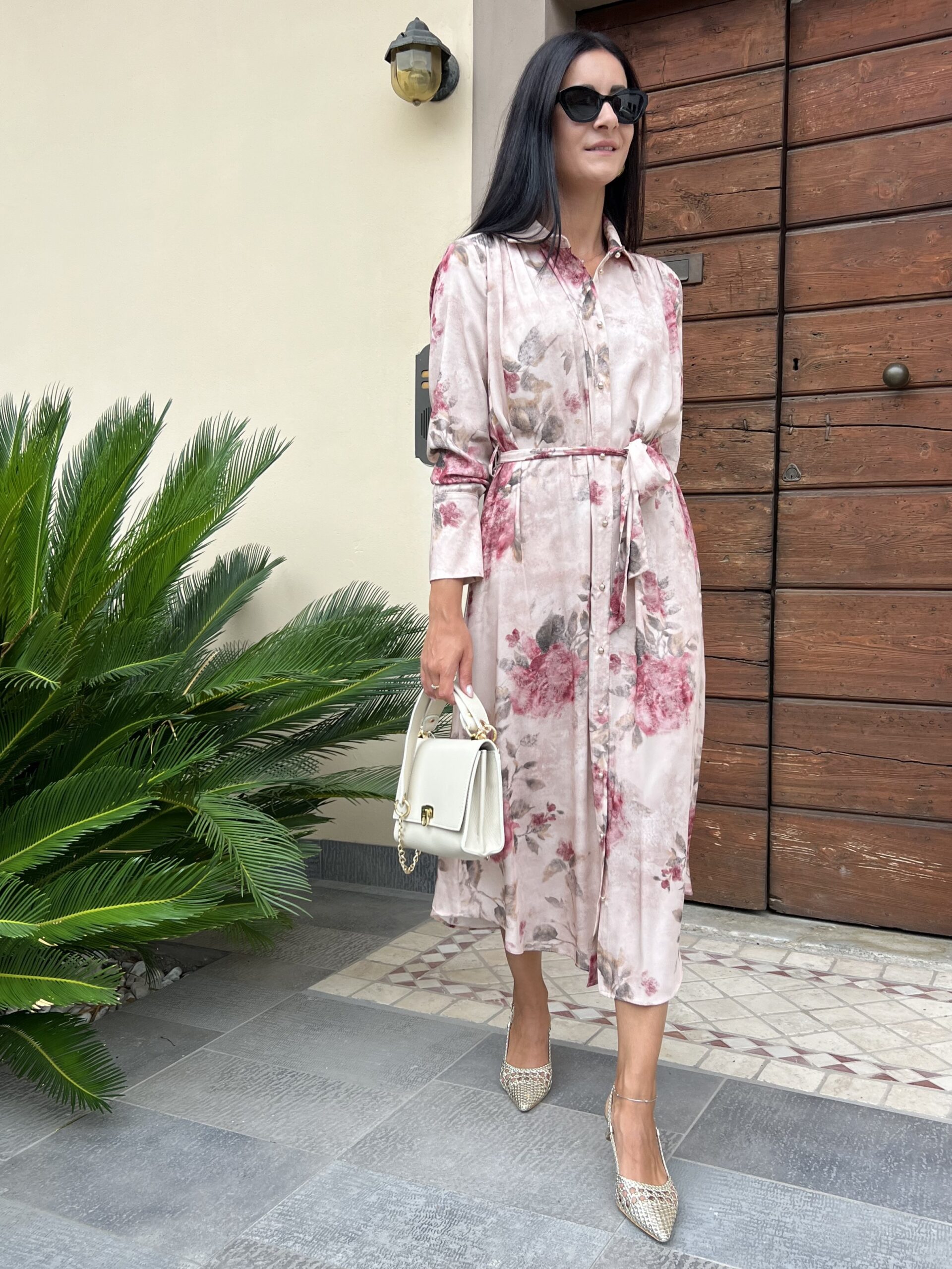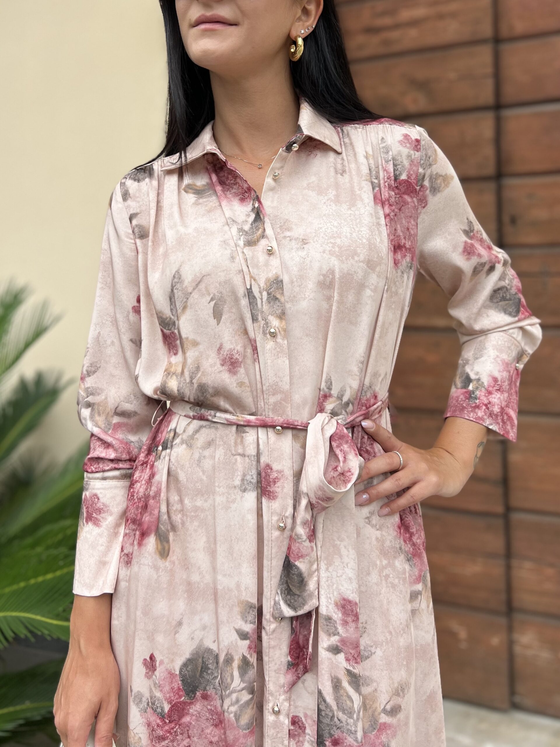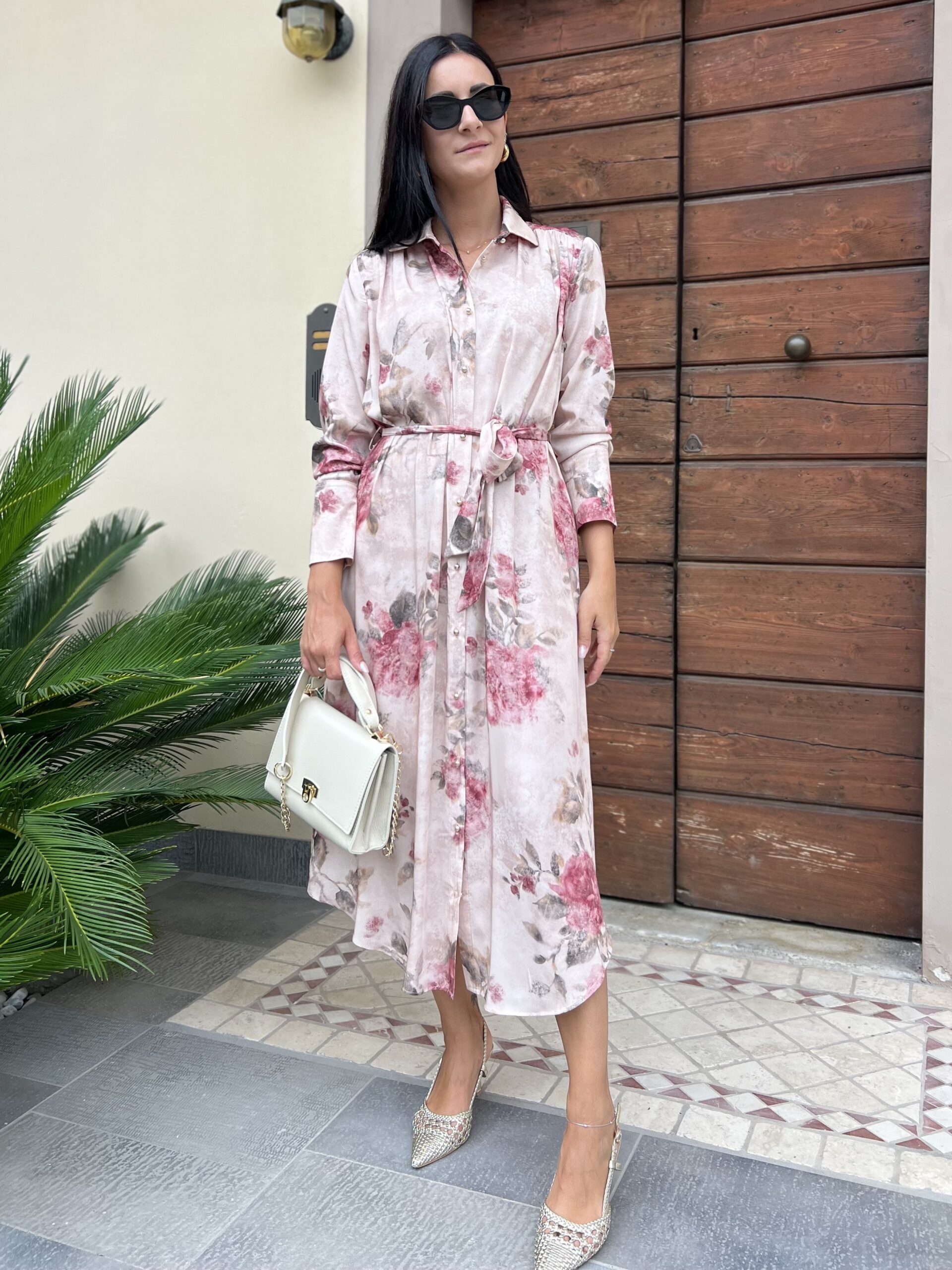 Abito in raso di viscosa, modello chemisier con colletto classico e manica regolare con polsino alto. Dettaglio bottoni oro e fusciacca inclusa nello stesso tessuto. Taglia S per 38/42 e M per 42/44.