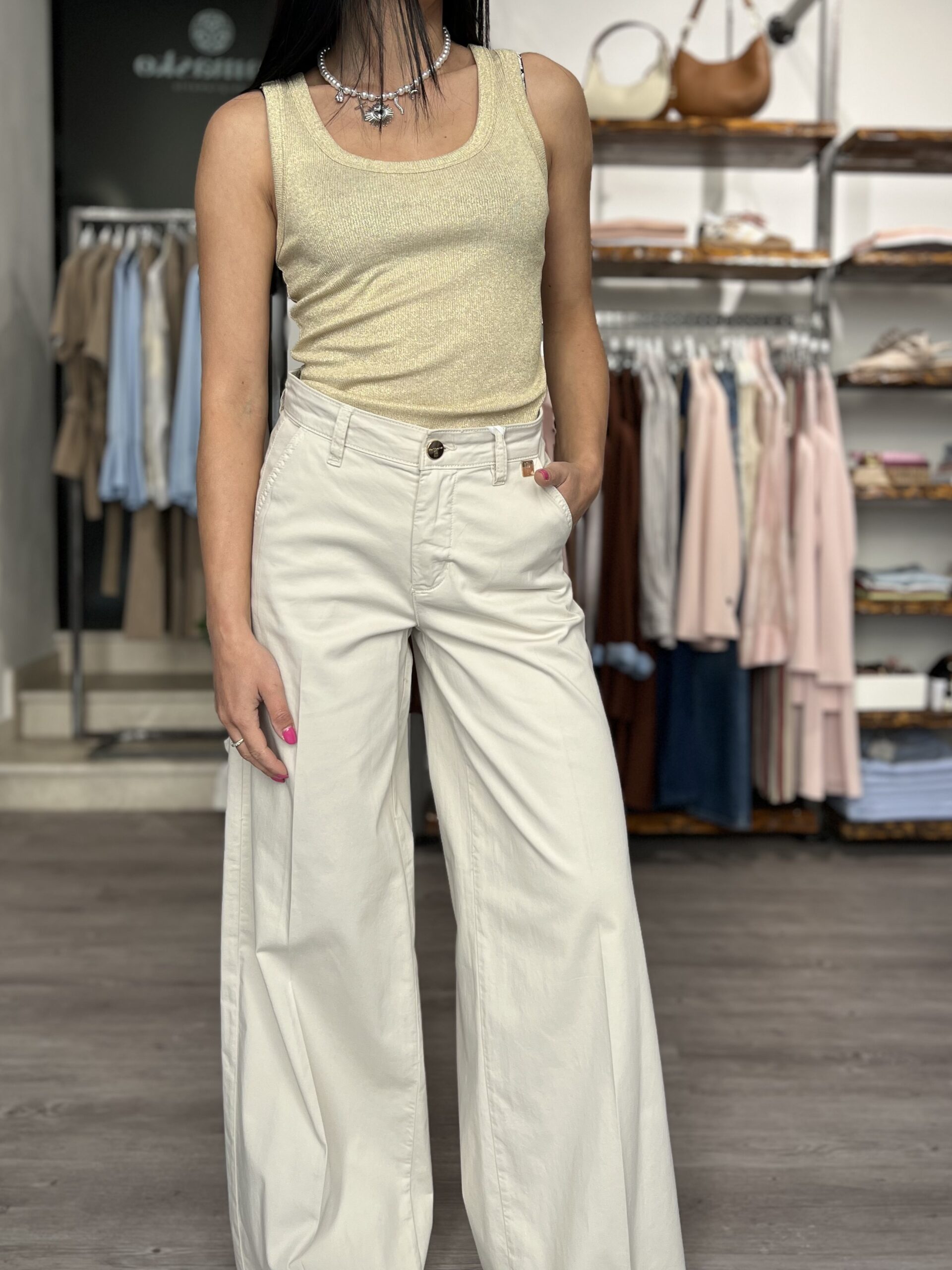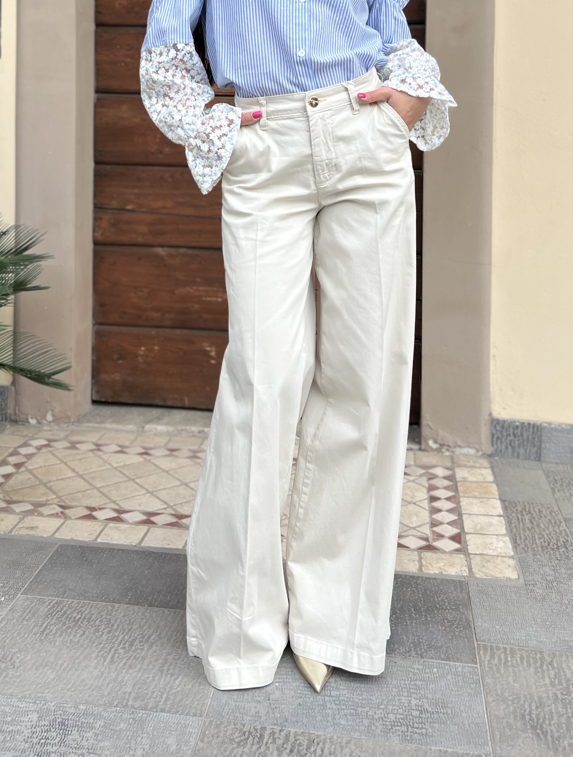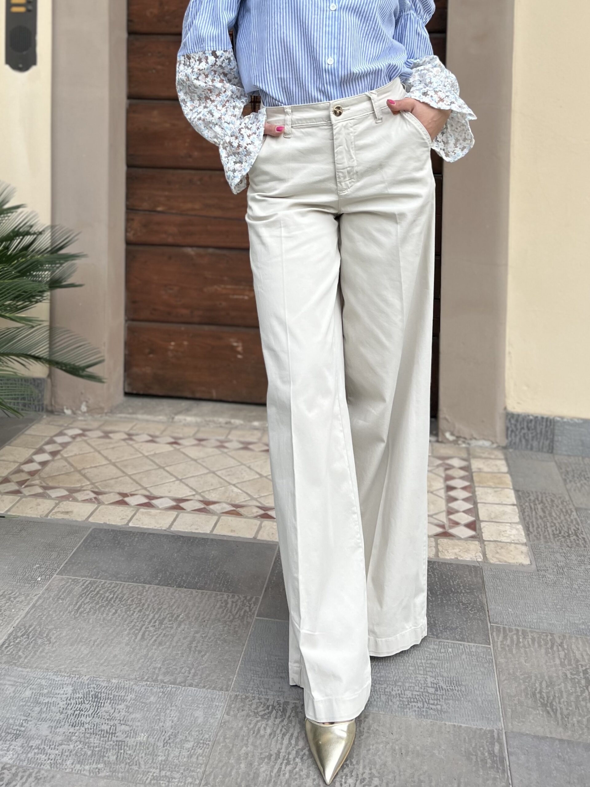 Pantalone in cotone leggero, modello classico chino a palazzo, a vita alta con tasche laterali, chiusura con zip e bottone.