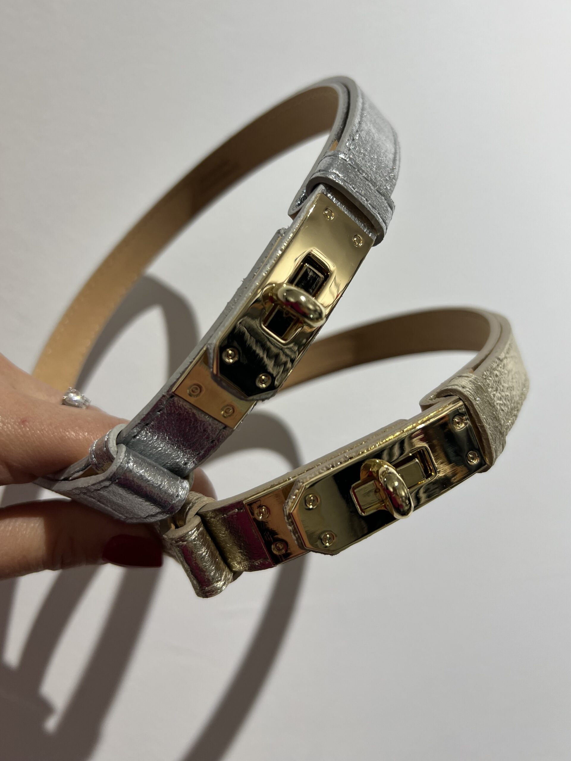 Cintura in vera pelle laminata, modello regolabile, chiusura con morsetto.