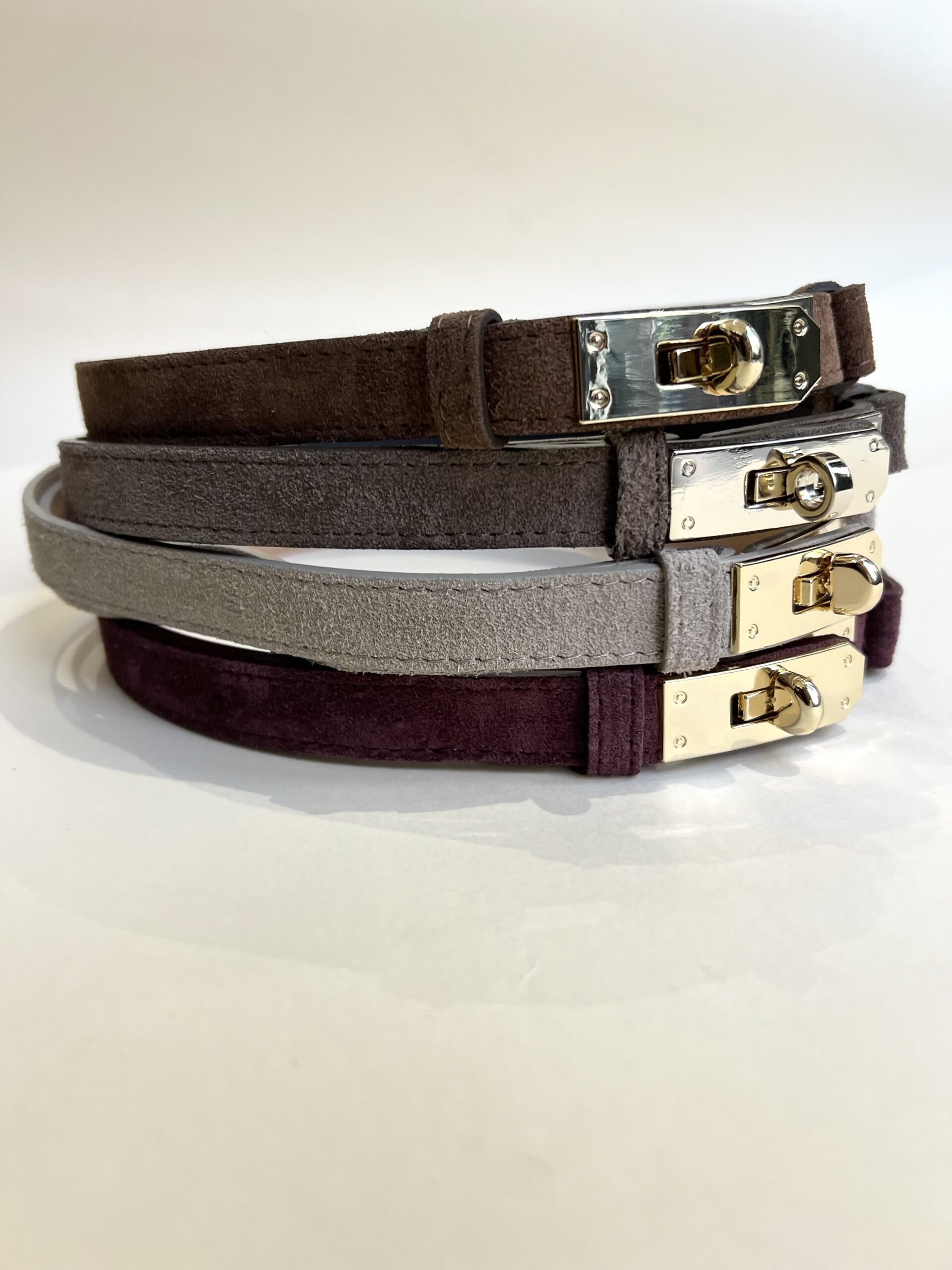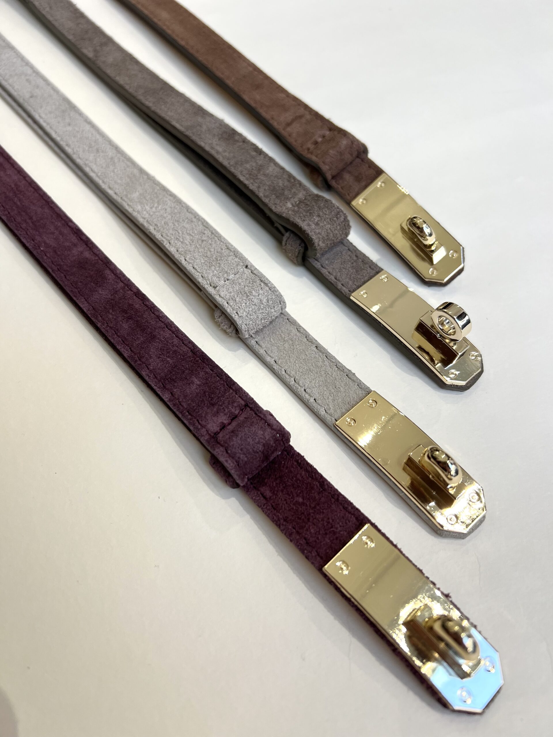 Cintura in vera pelle scamosciata con chiusura morsetto. Modello regolabile.