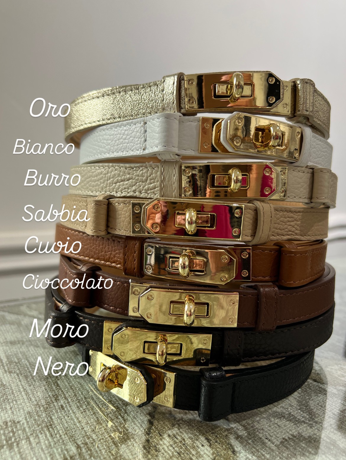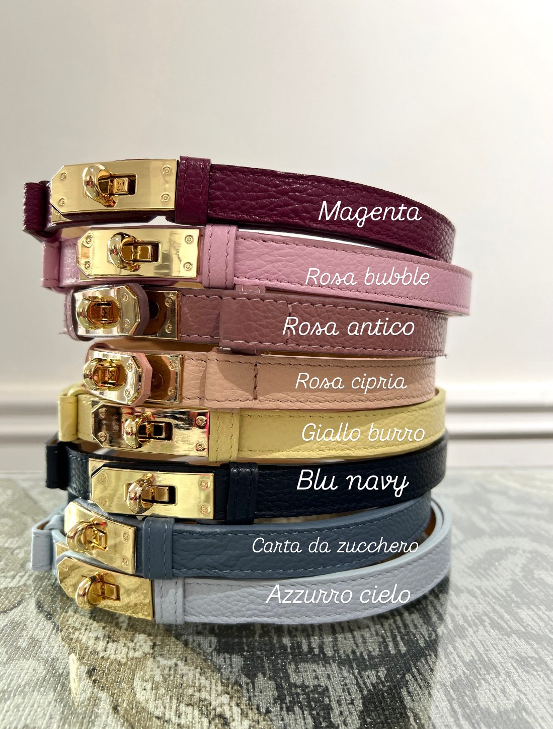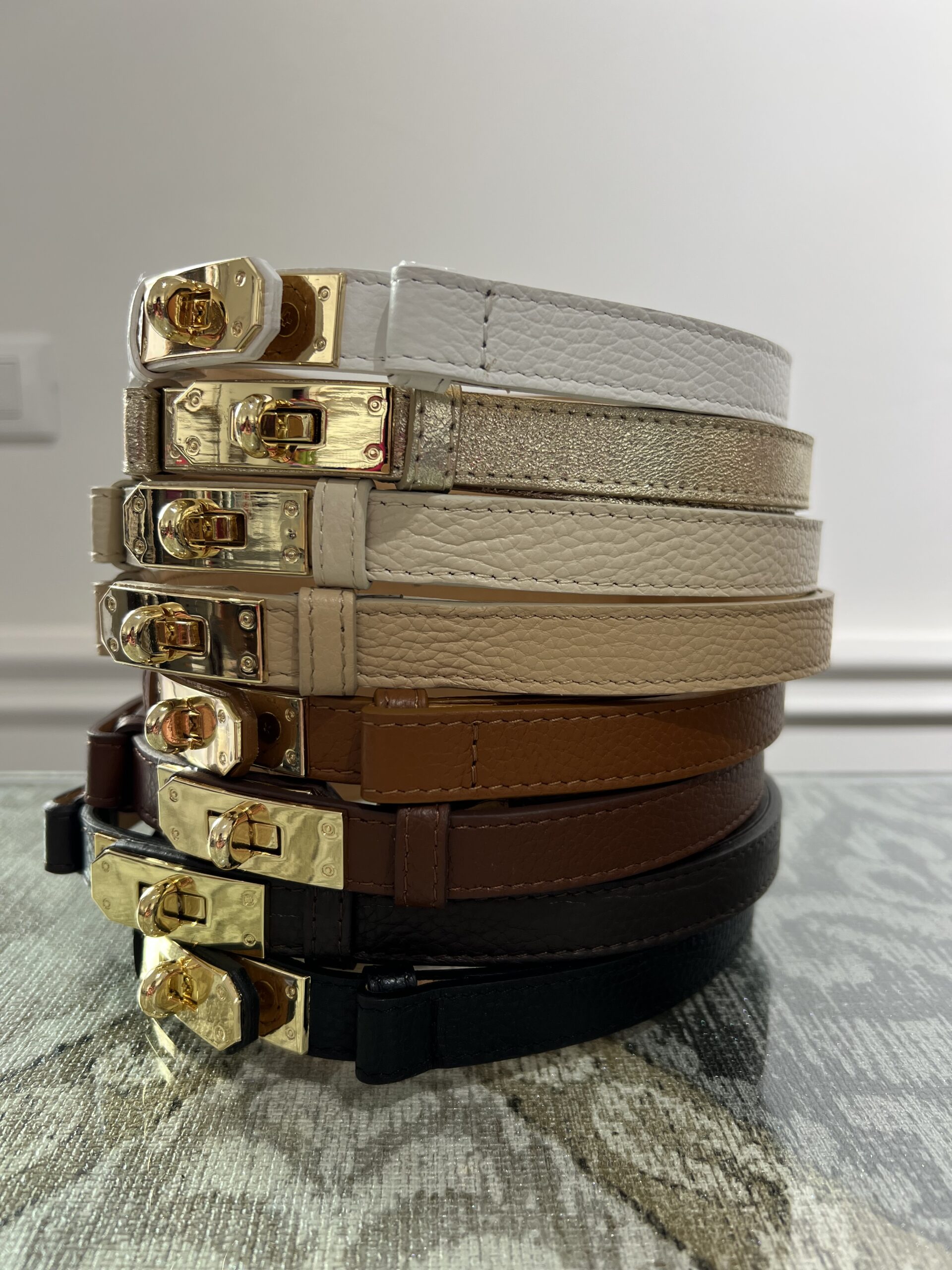 Cintura in vera pelle con chiusura morsetto dorato. Modello regolabile, perfetto per abiti, pantaloni, blazer e cardigan.