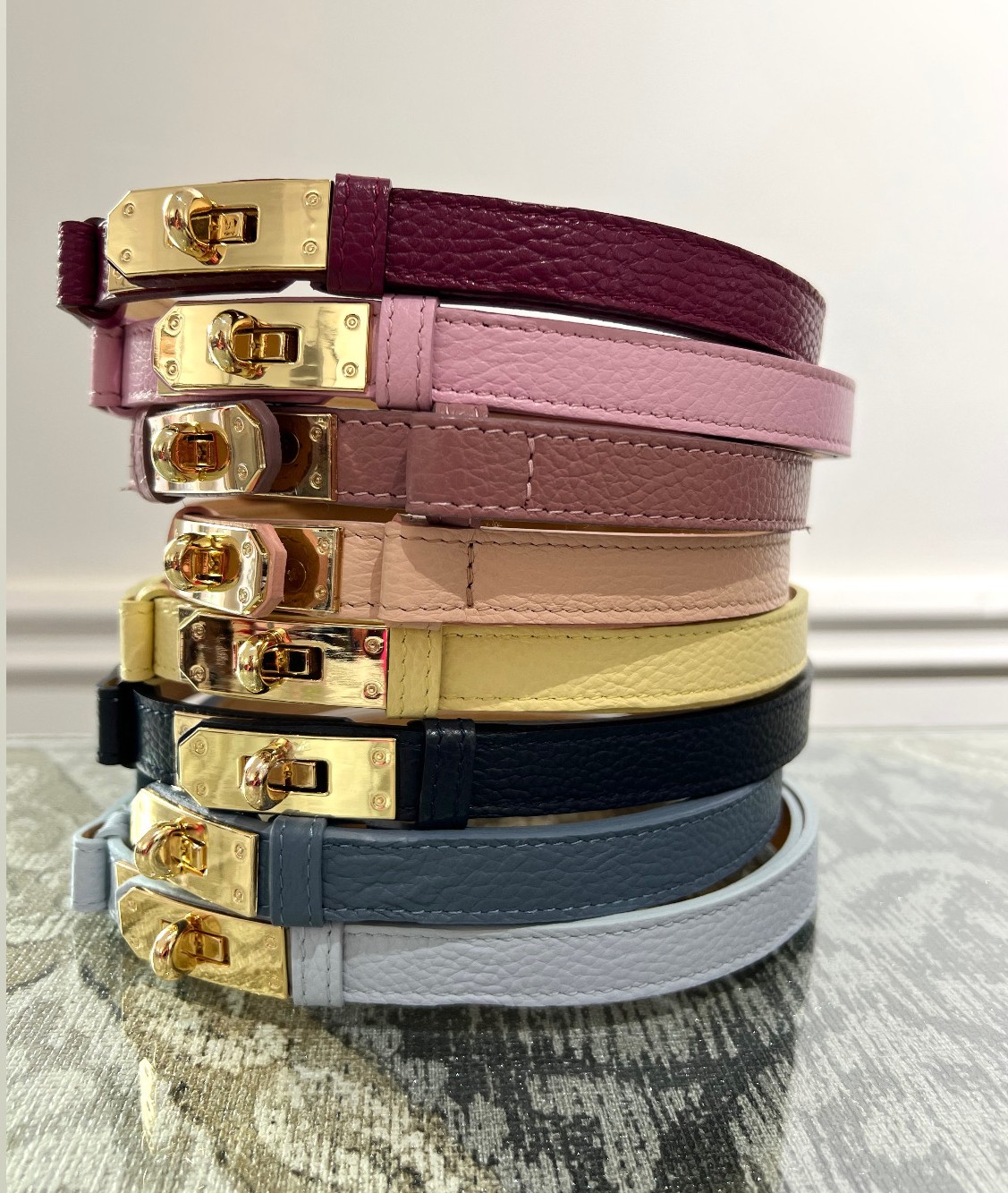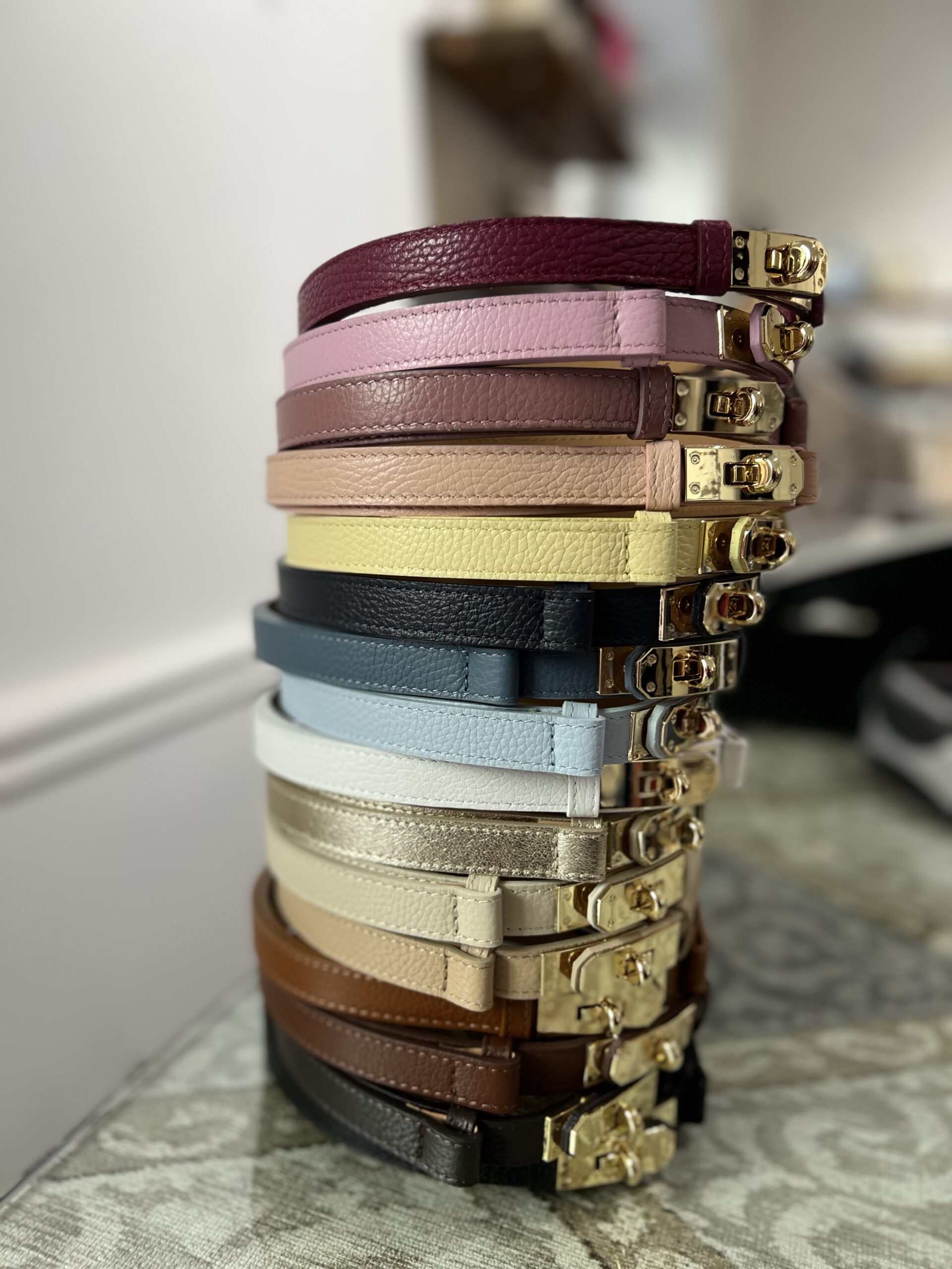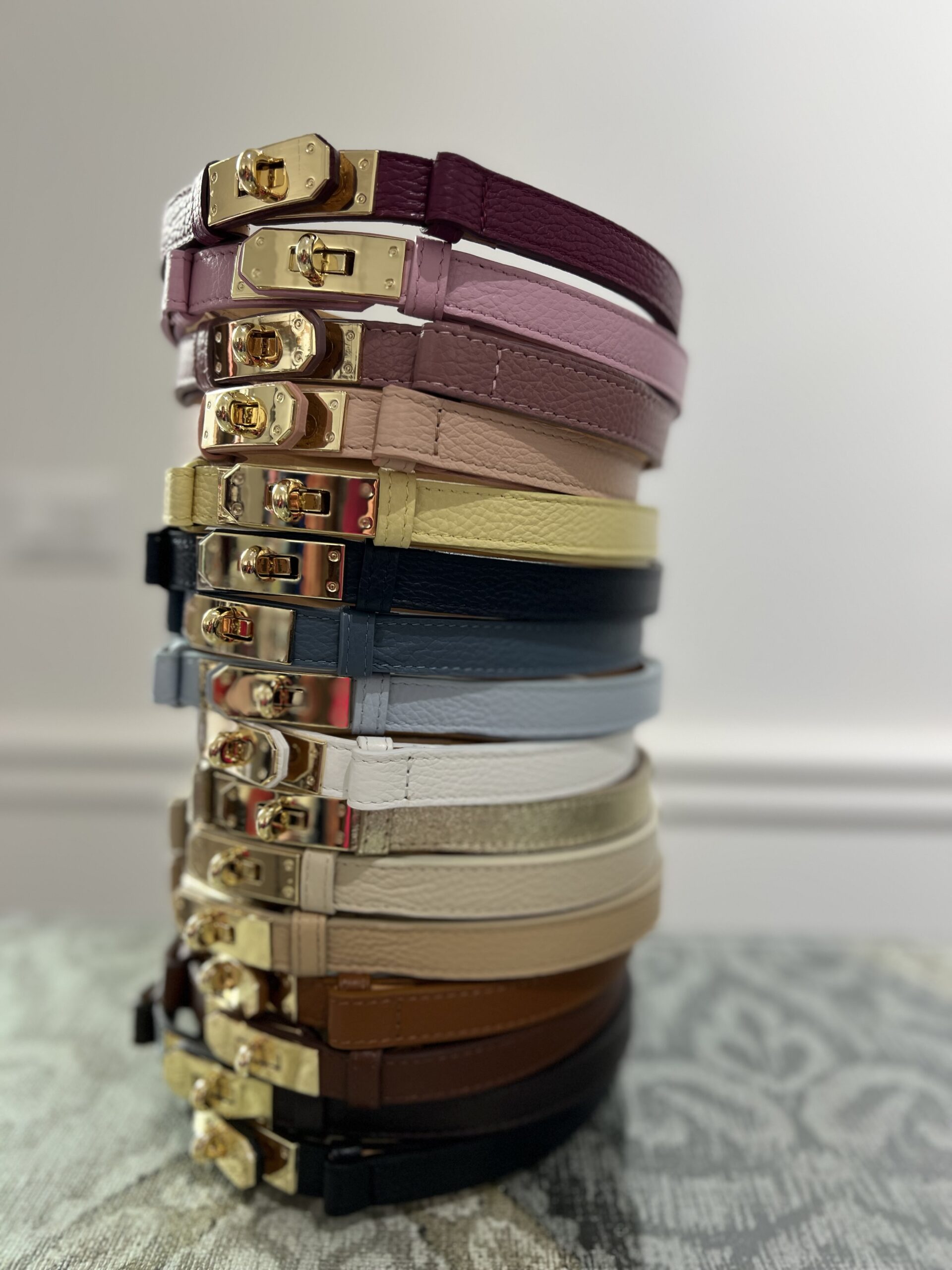 Cintura in vera pelle con chiusura morsetto dorato. Modello regolabile, perfetto per abiti, pantaloni, blazer e cardigan.