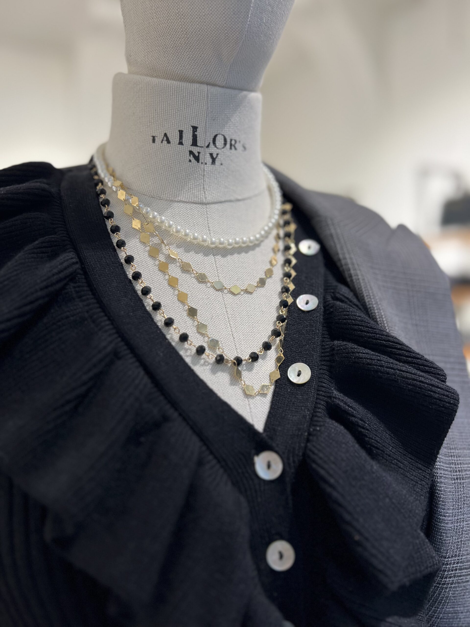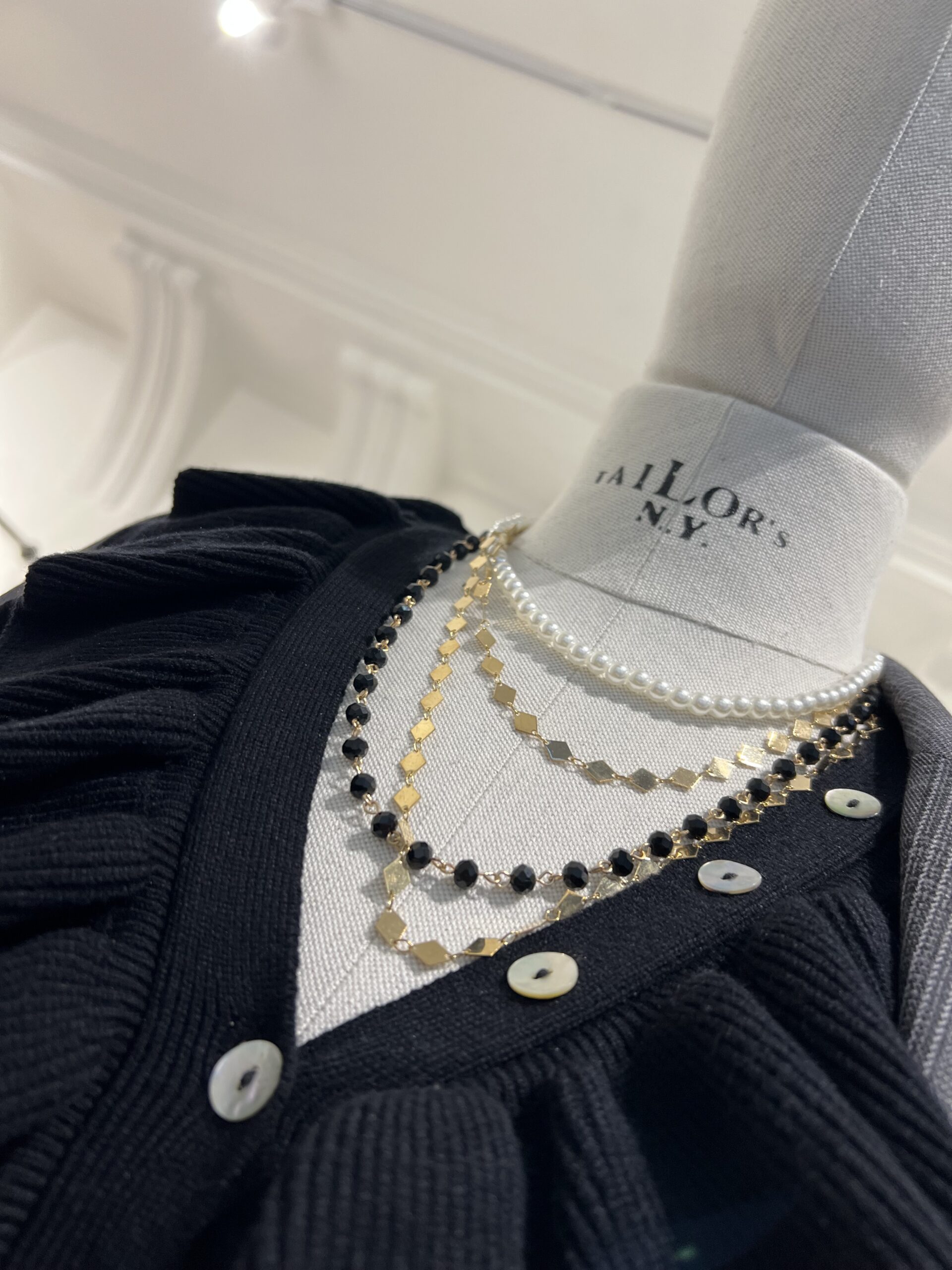 Collana in acciaio, modello triplo filo con pietre e perle. Chiusura regolabile.