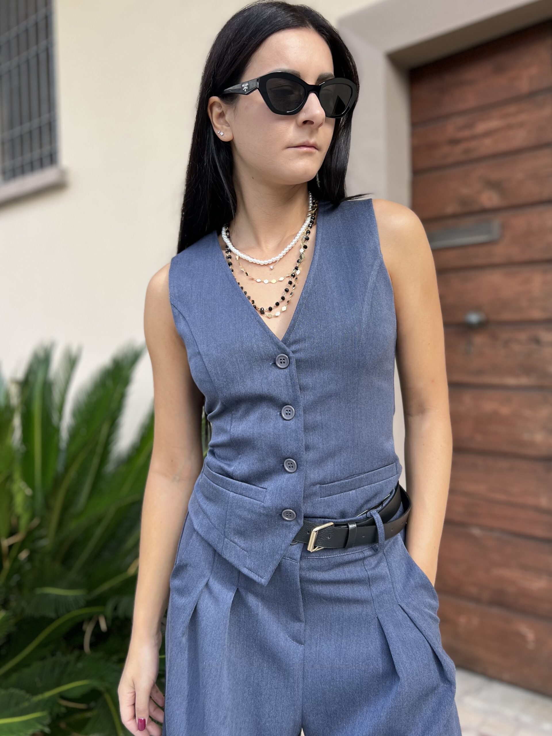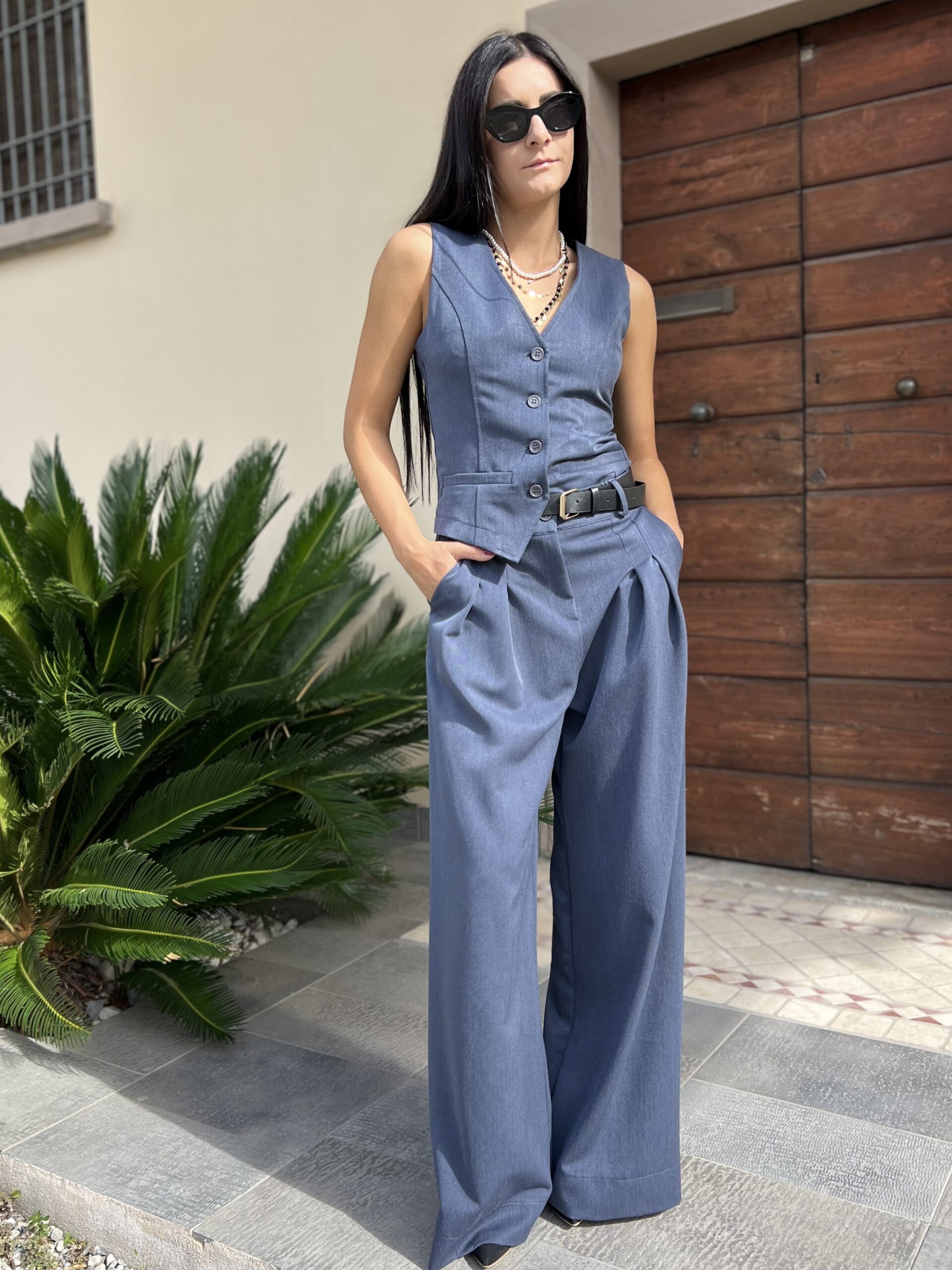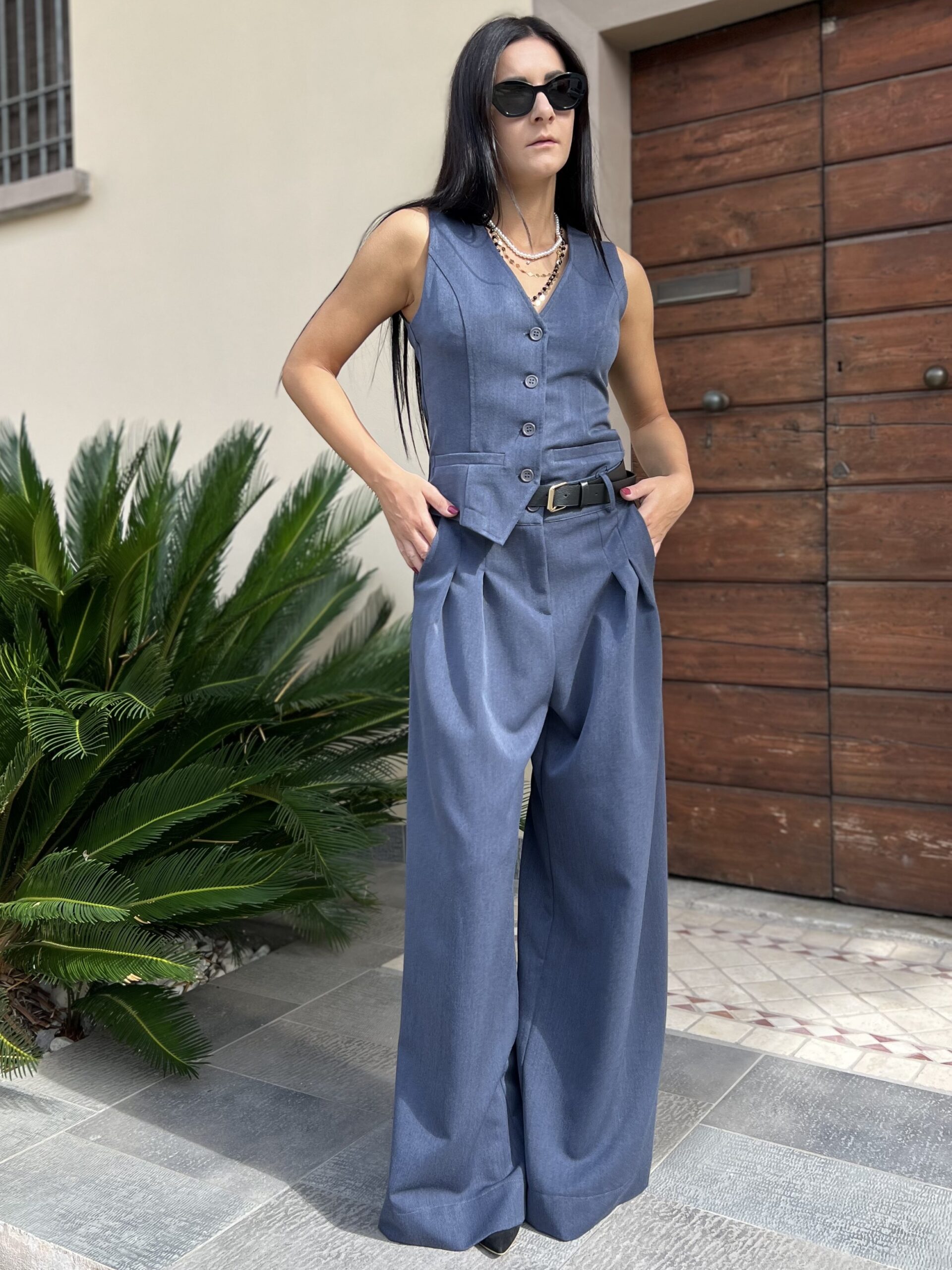 Completo composto da gilet slim e pantalone ampio a palazzo con pinces. Tessuto fluido in misto viscosa, cintura inclusa. Taglia S per 40/42 e M per 42/44.