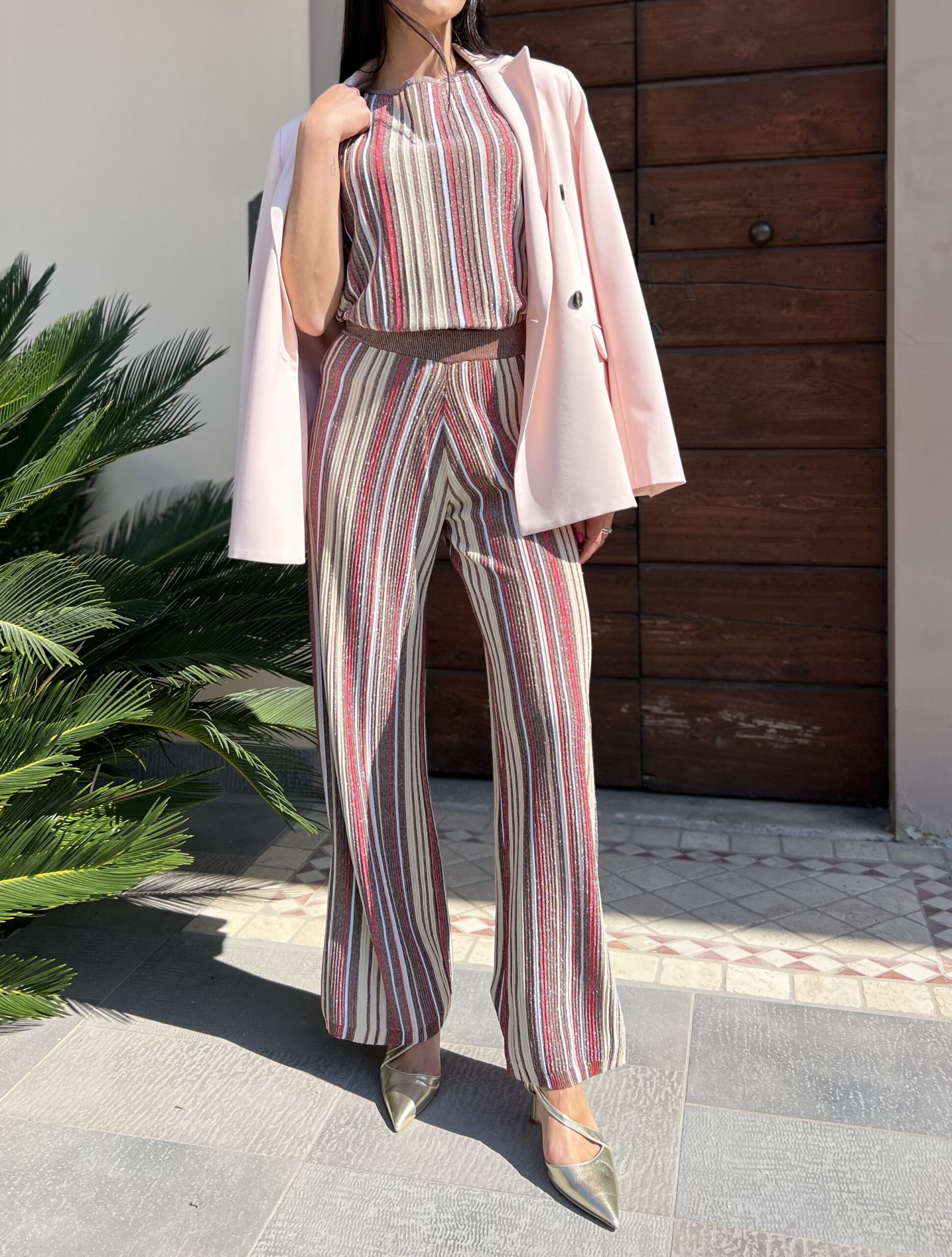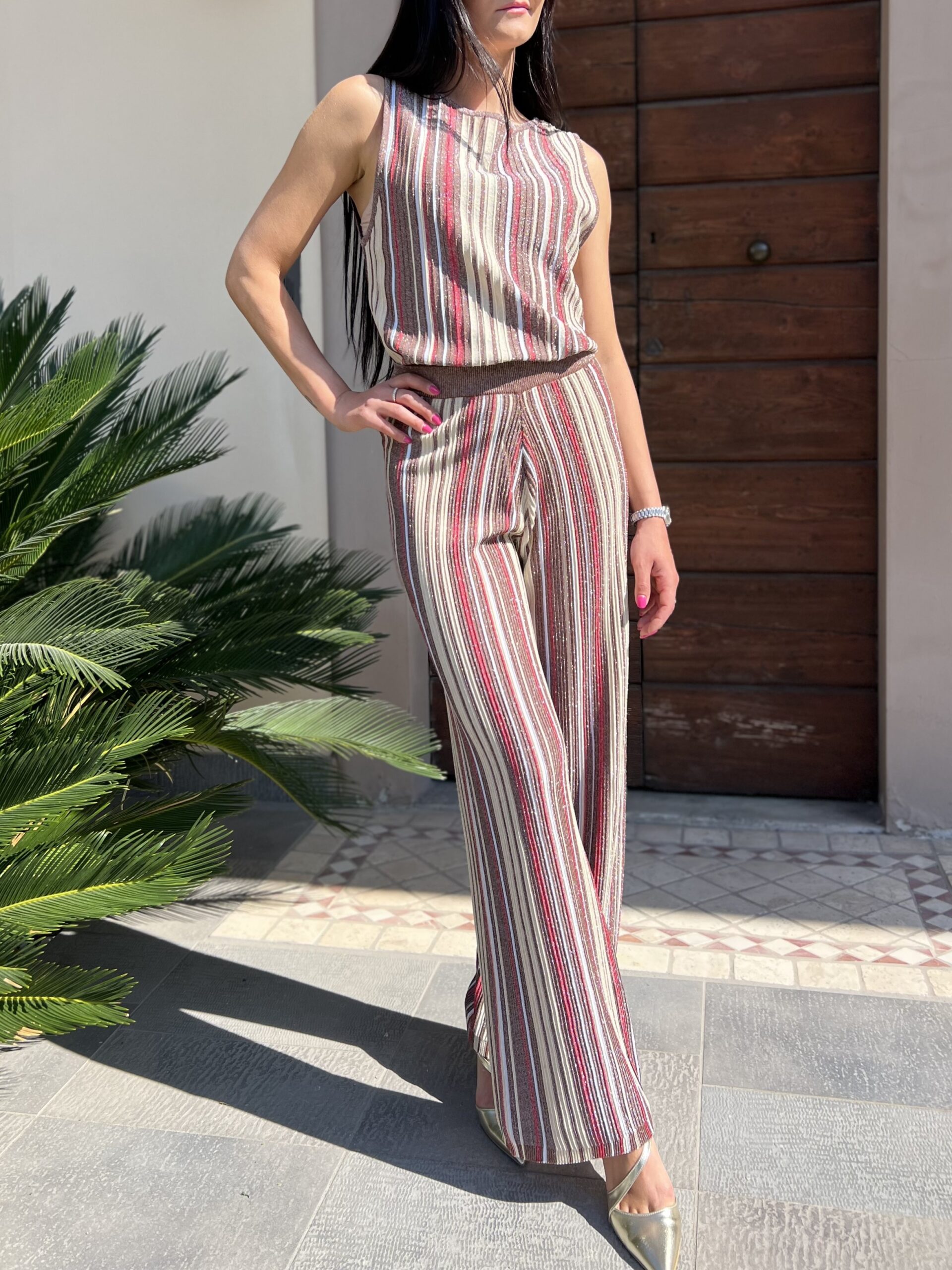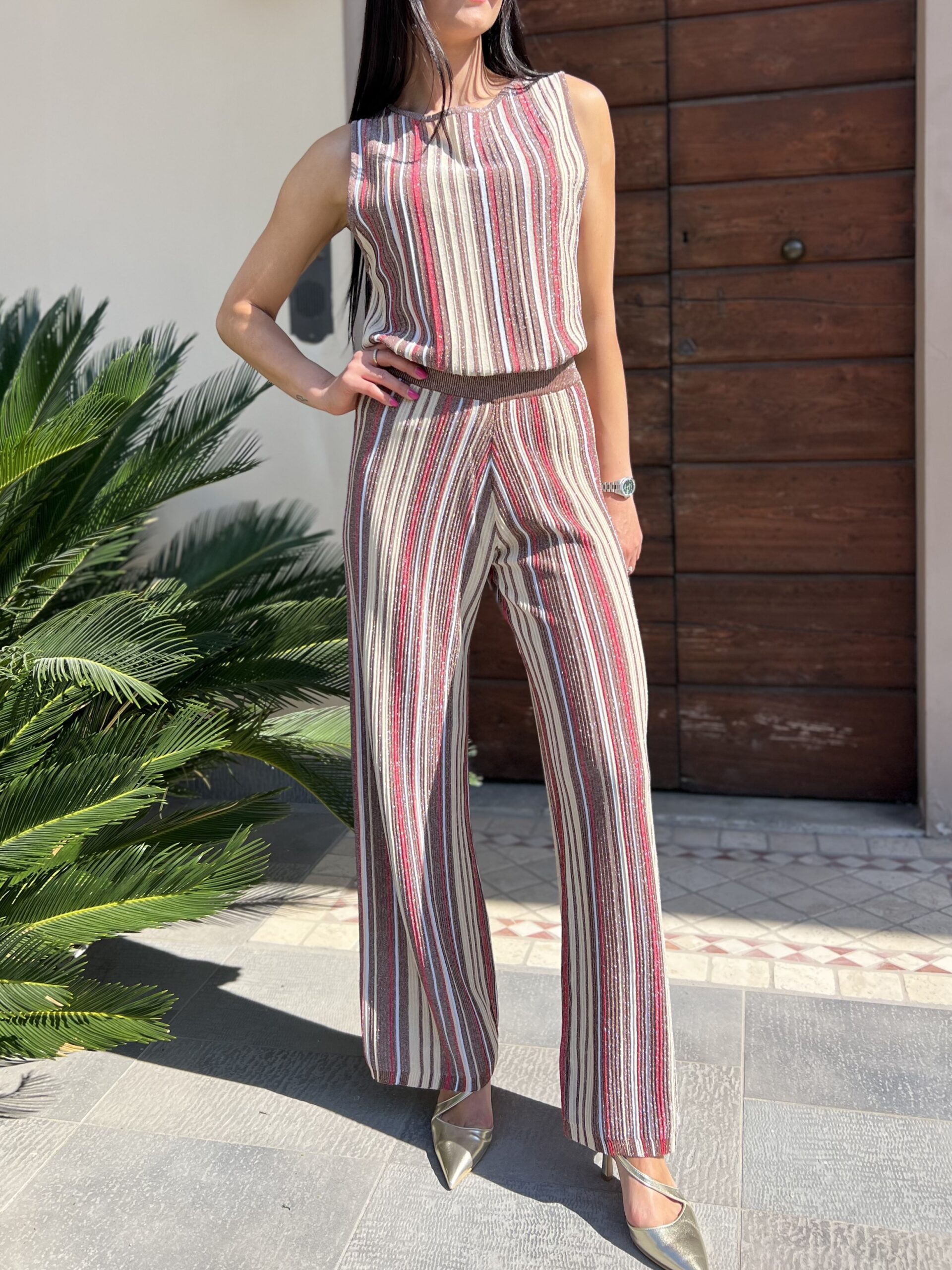 Completo canotta dal taglio dritto con spalla larga abbinato al pantalone con elastico in vita dal taglio dritto. Taglia XS/S per 40/42 e M per 42/44.