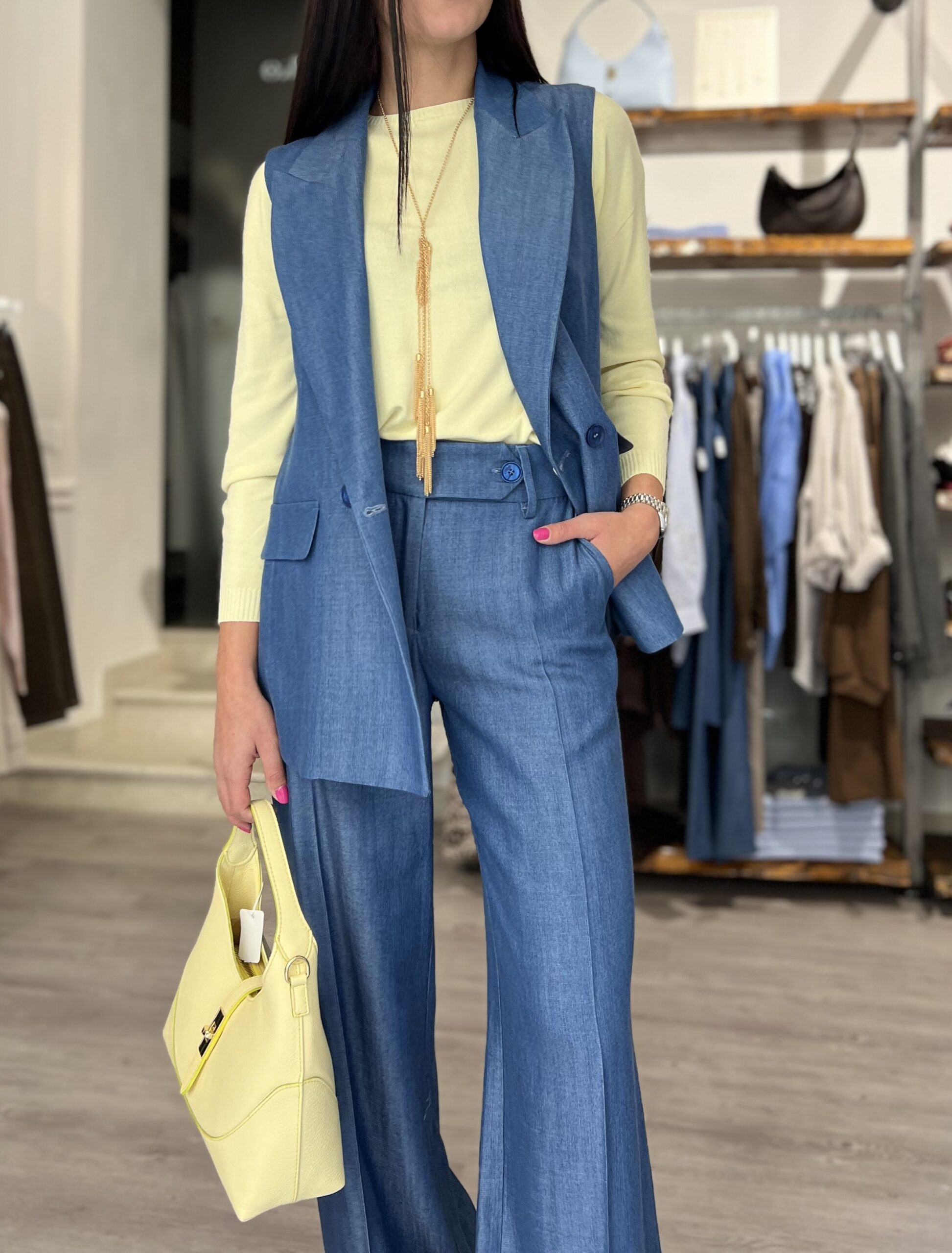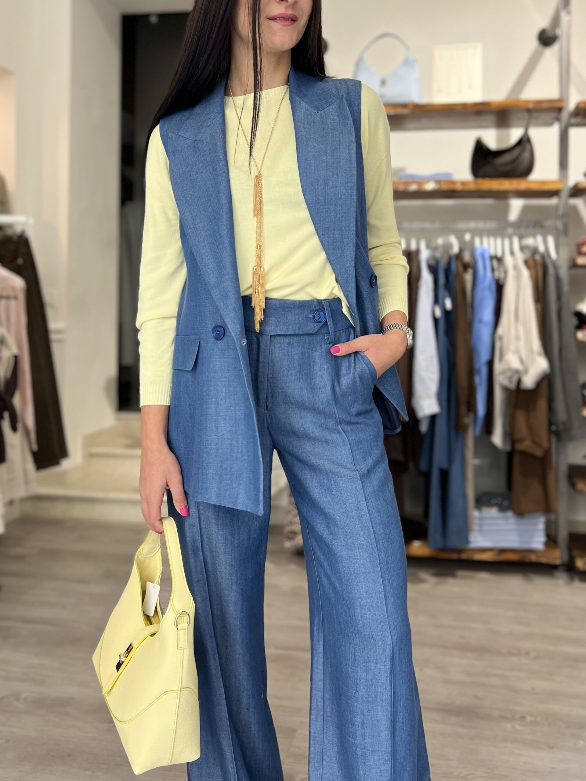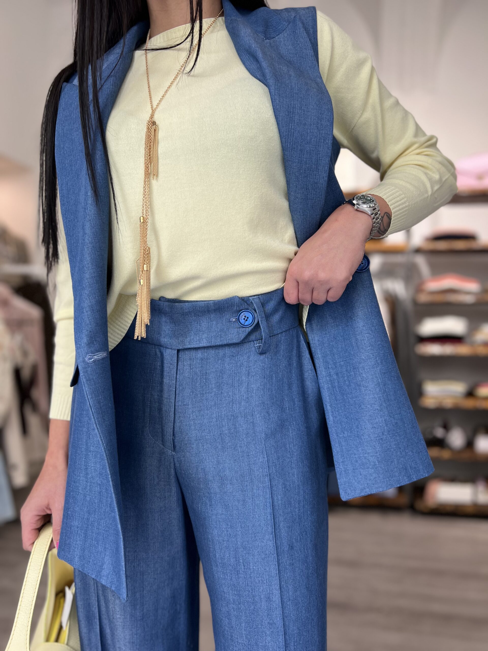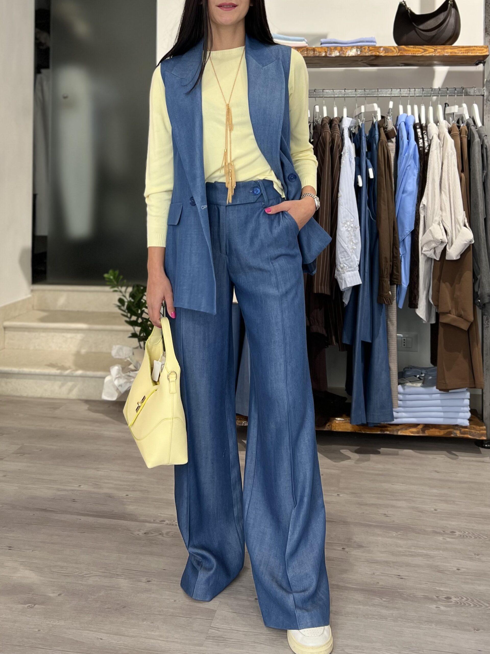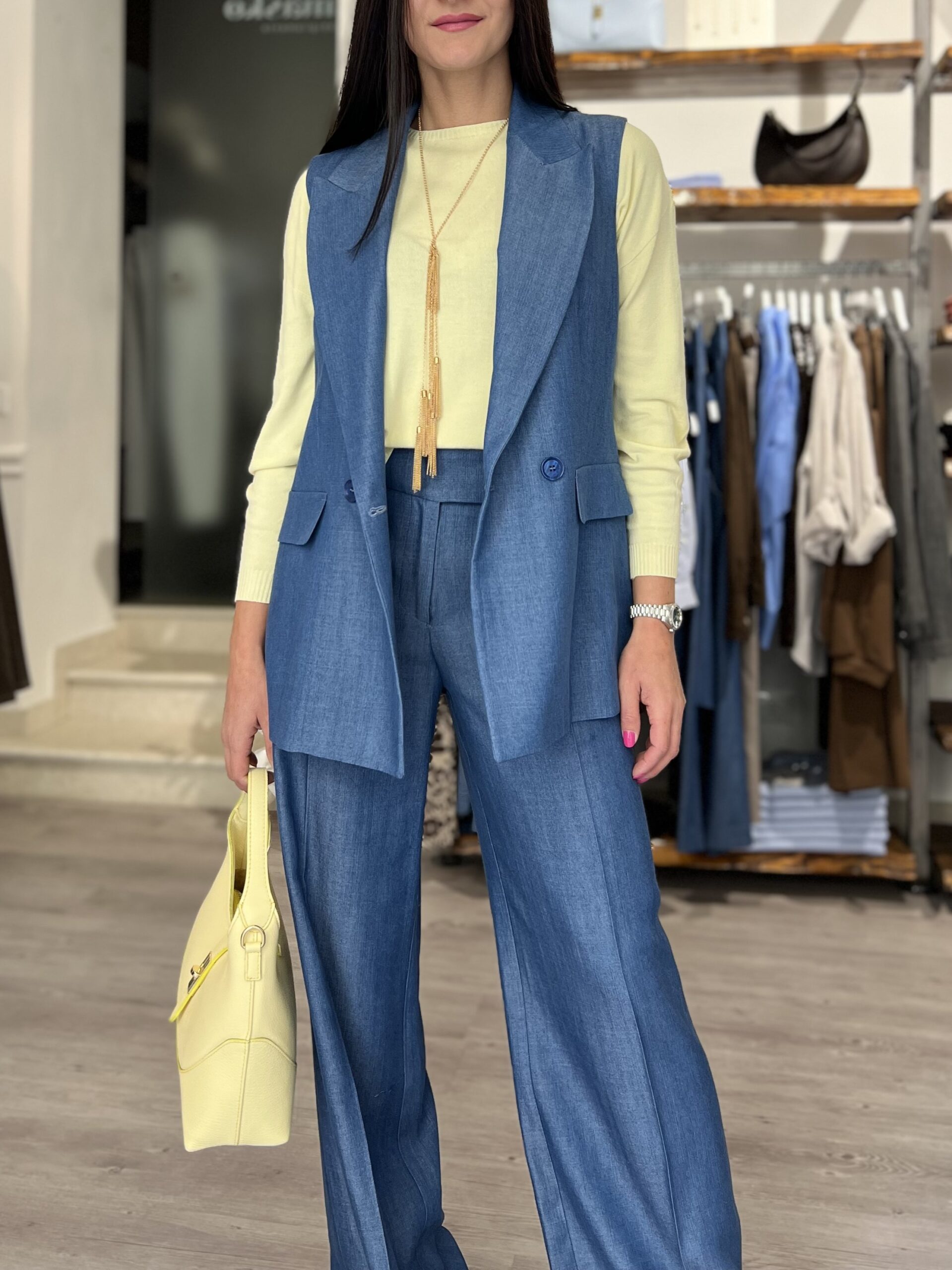 Completo in 100% lyocell composto d gilet lungo doppiopetto e pantalone full lenght con tasca laterale.